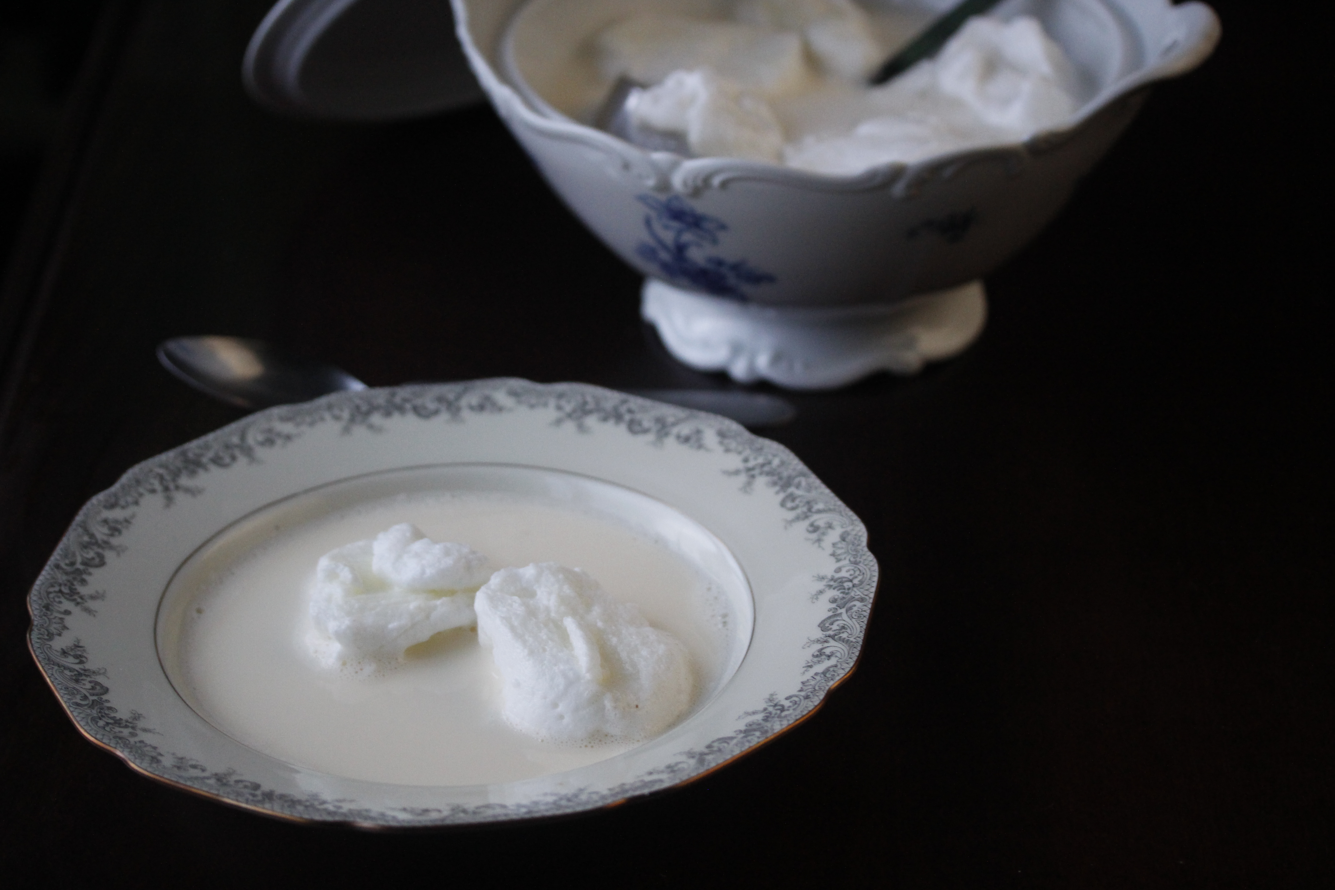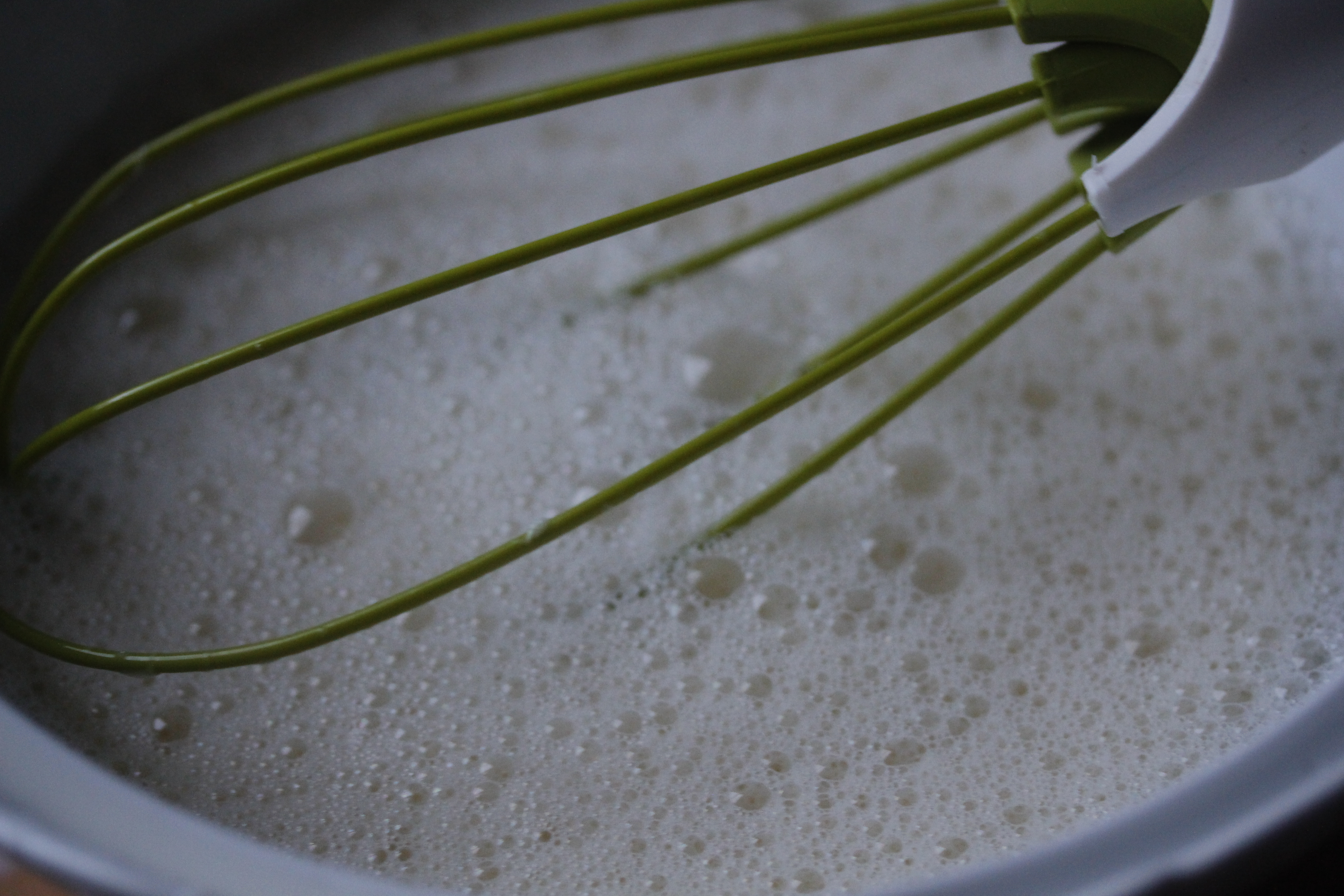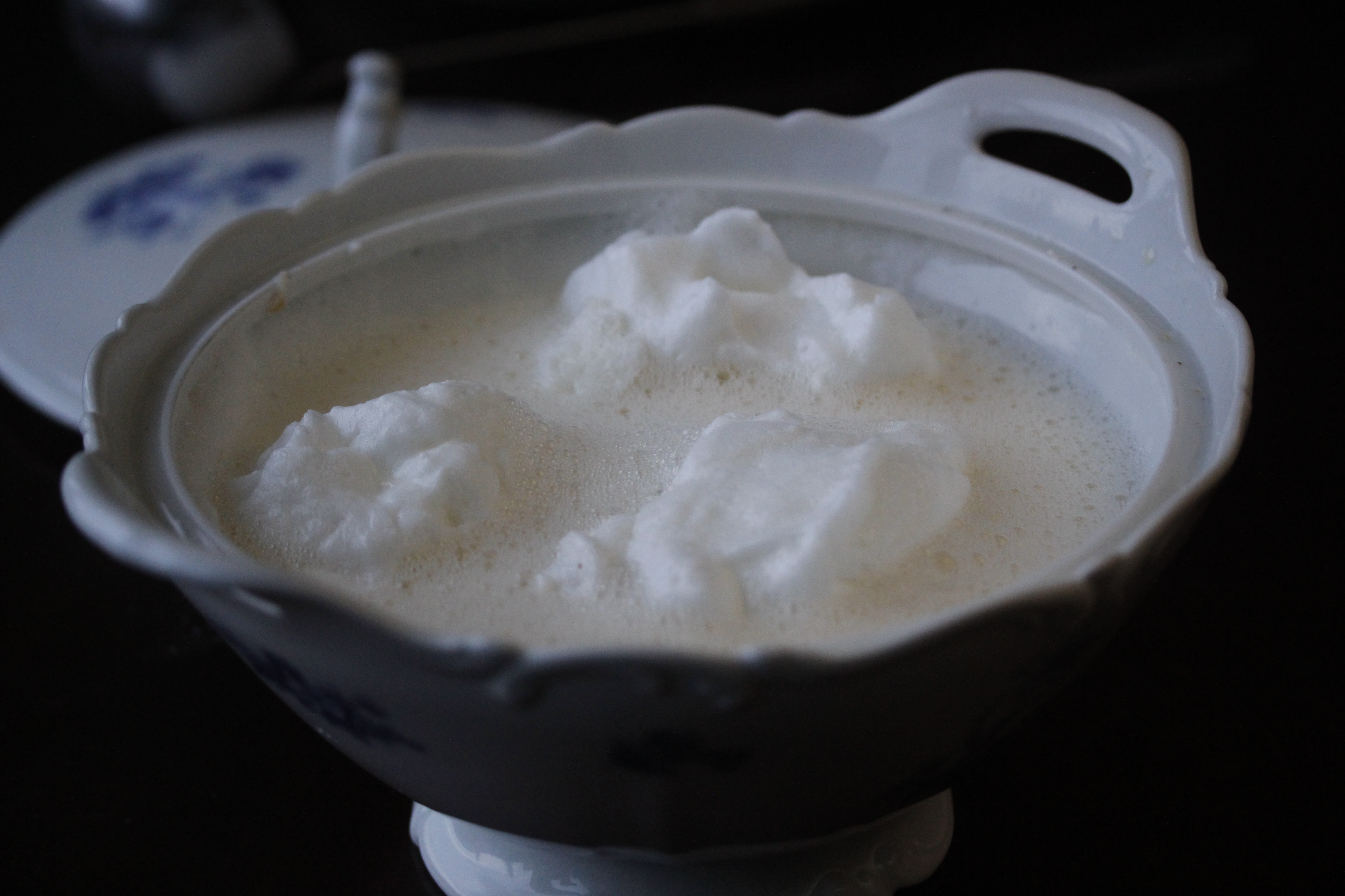 Á meðan tók ég tvö egg, aðskildi og setti rauðurnar í súpuskál en stífþeytti hvíturnar með 2 msk af sykri. Setti þær svo út í mjólkina með skeið (þær fljóta). Svo setti ég lok yfir og lét malla í 2 mínútur.
