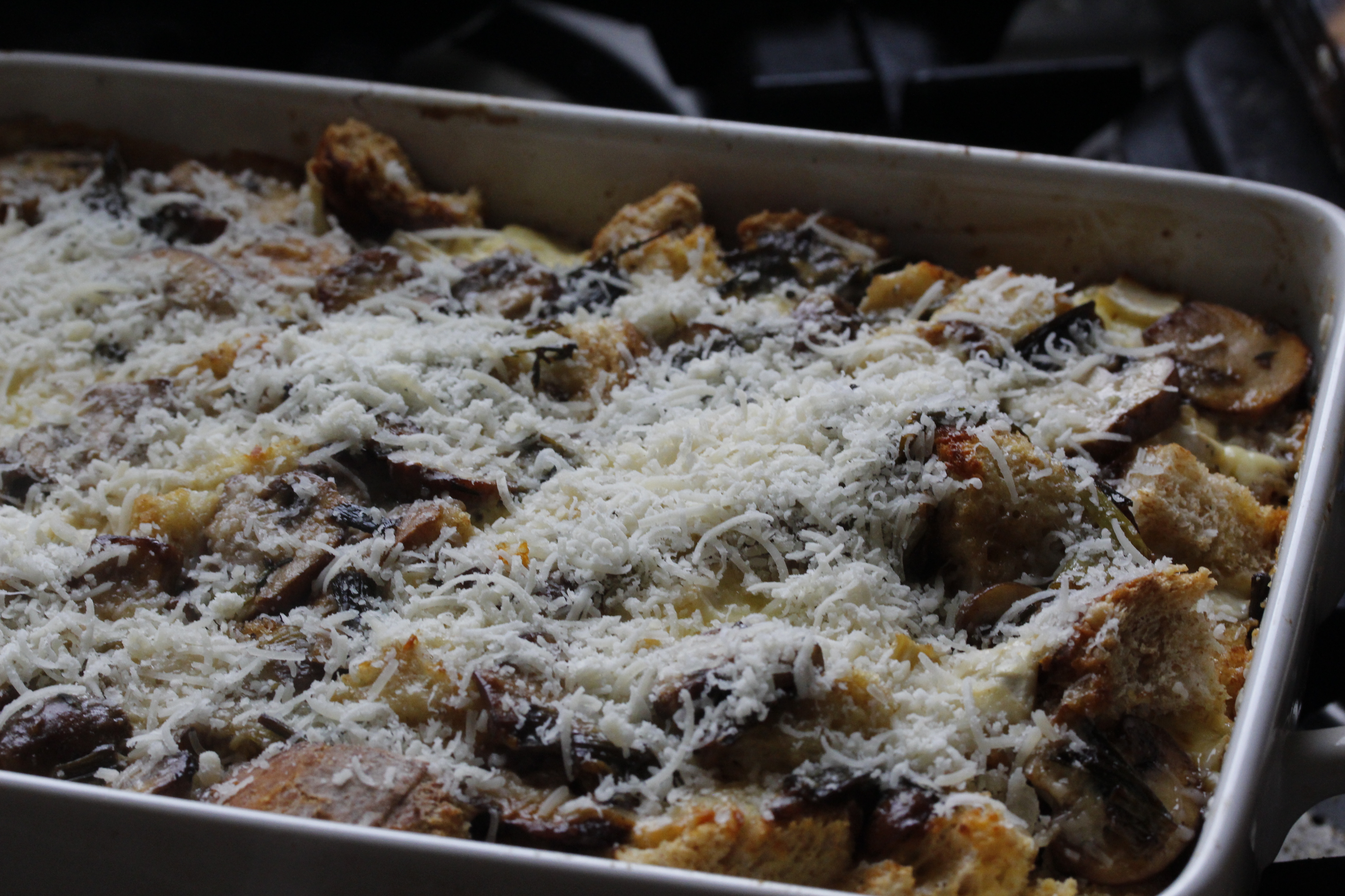 Daginn eftir tók ég svo formið út og hitaði ofninn í 175°C. Bakaði brauðréttinn, undir álpappír, í 35-40 mínútur. Fjarlægði þá álpappírinn, stráði afganginum af parmesanostinum yfir og bakaði í 15-20 mínútur í viðbót, eða þar til yfirborðið var fallega gullinbrúnt.