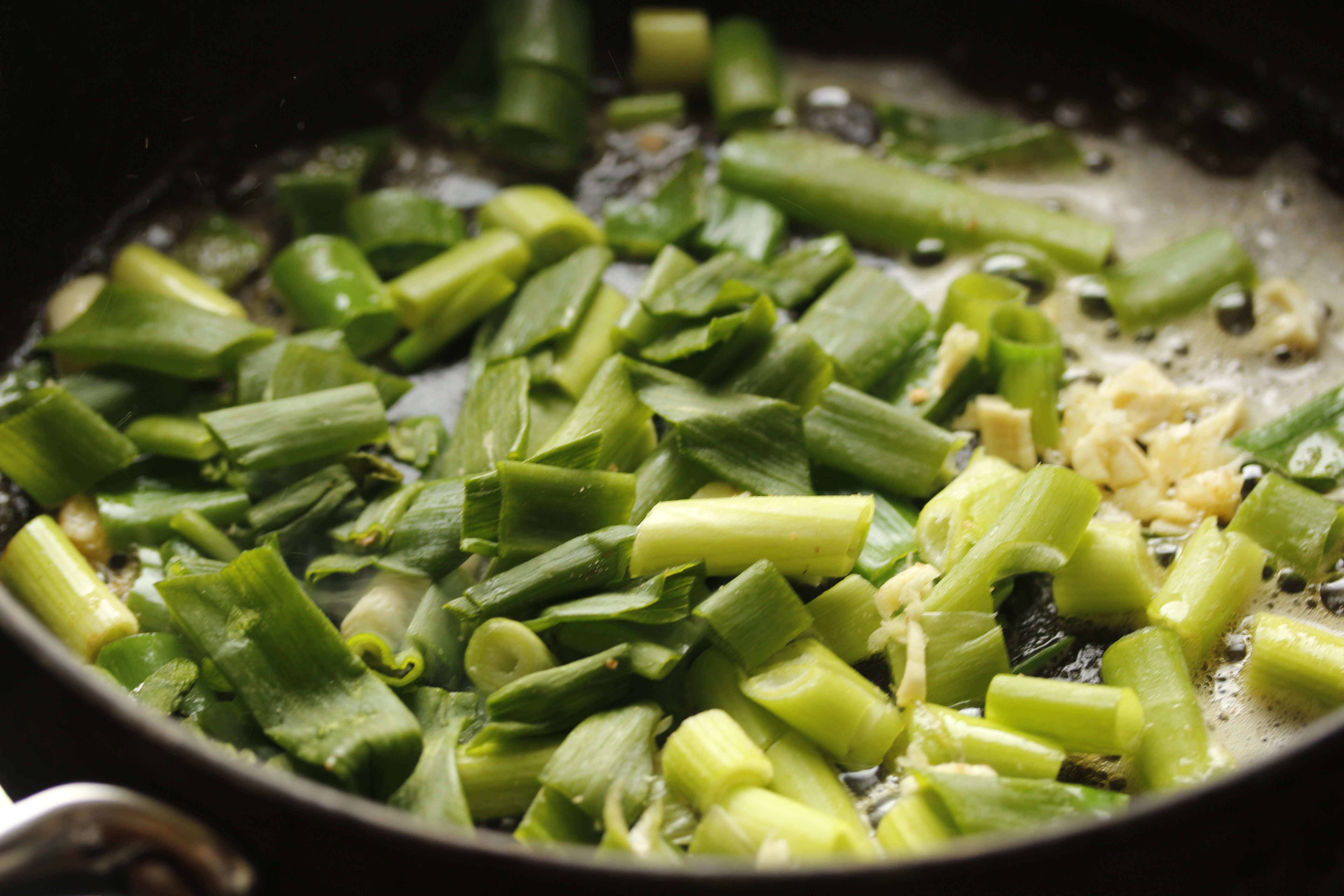 Ég tók svo 250 g af sveppum – mér finnst best að nota kastaníusveppi í svona en það mega alveg vera venjulegir ætisveppir – og saxaði 3-4 vorlauksgeira og 2 hvítlauksgeira. Bræddi svo 2 msk af smjöri á pönnu og setti vorlaukinn og hvítlaukinn á hana …