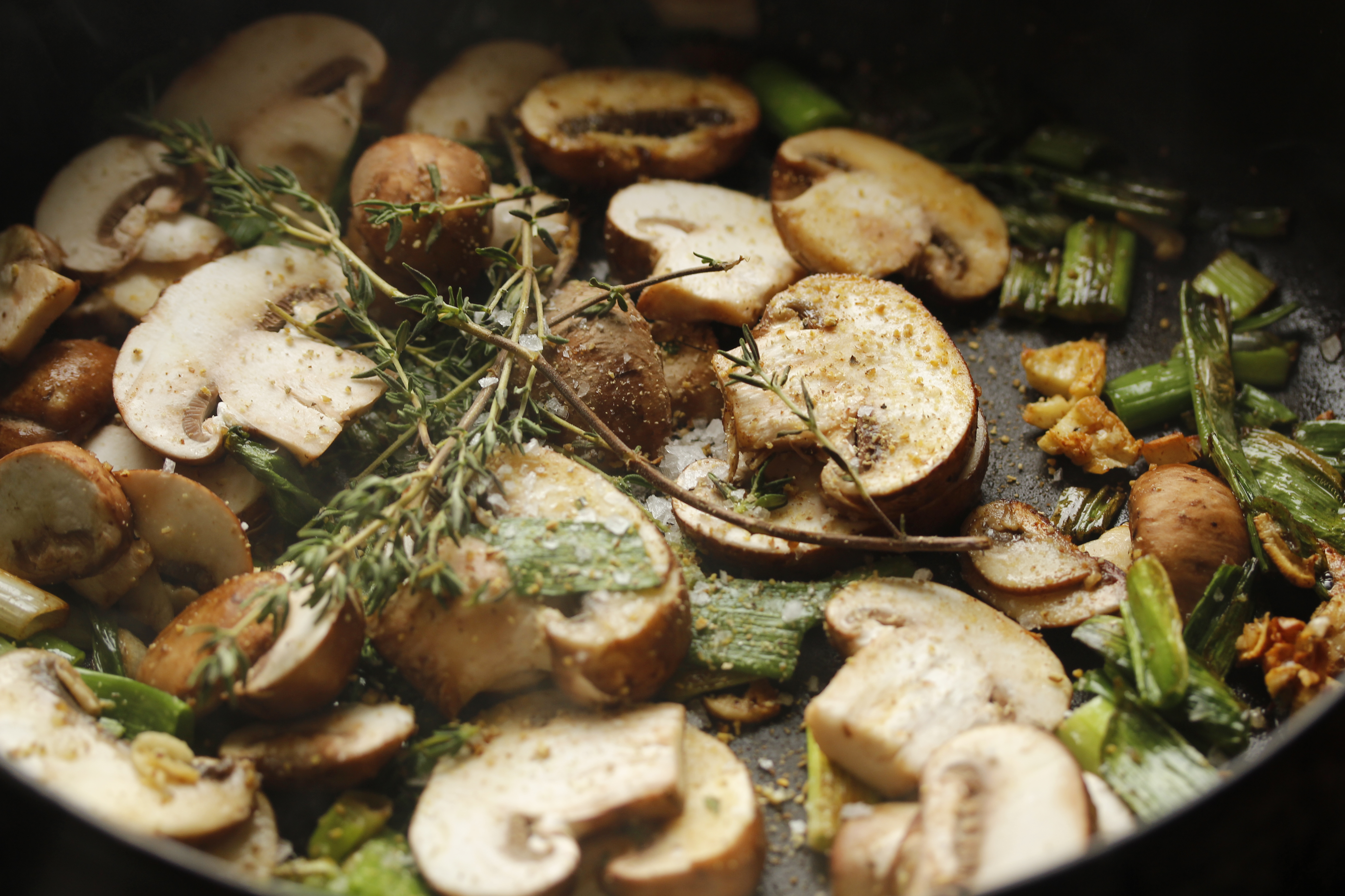 … og síðan sveppina og lét krauma við meðalhita í 6-8 mínútur. Kryddaði með 2-3 timjangreinum (eða 1/2 tsk af þurrkuðu timjani) pipar og salti.