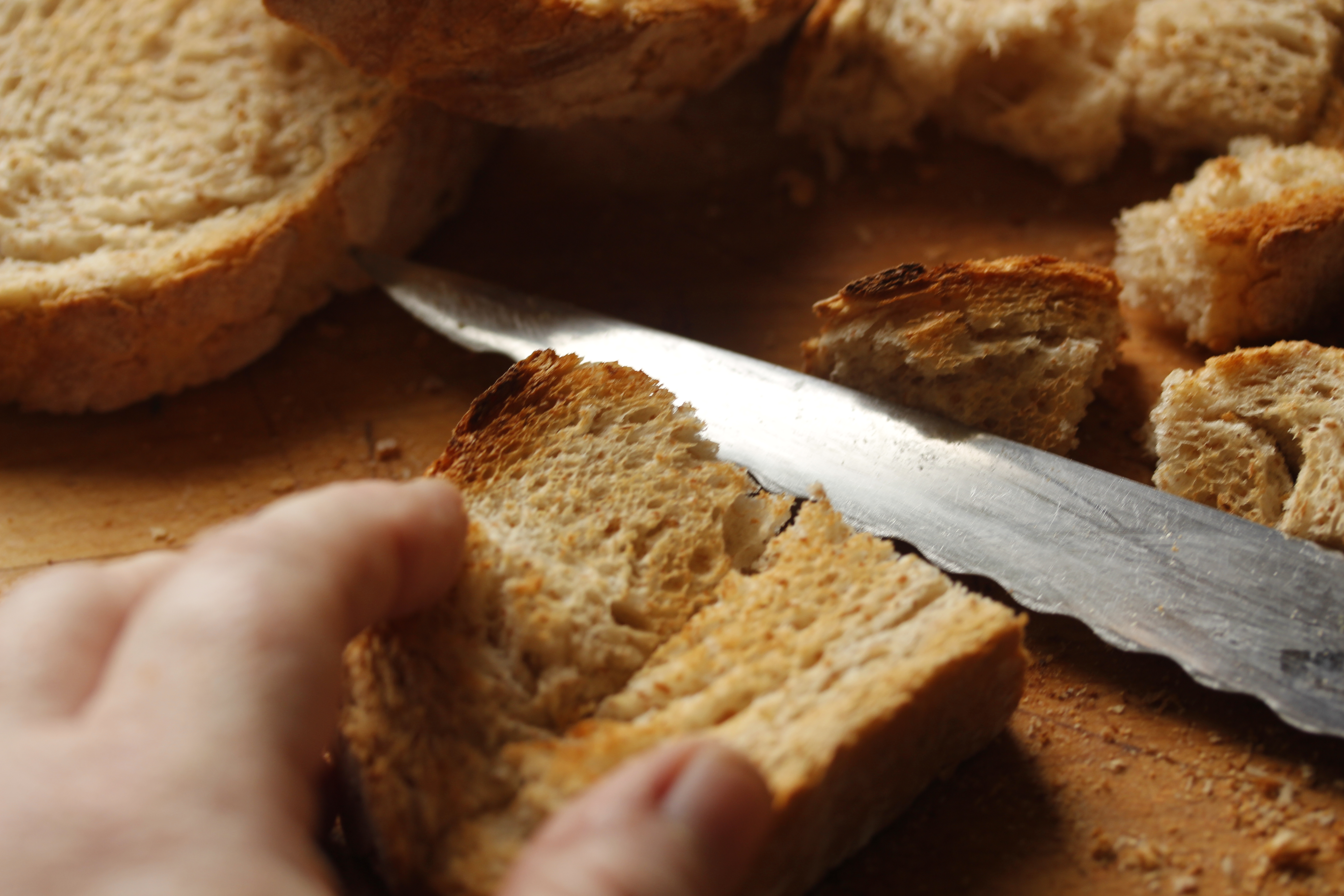 Ég skar brauðið í fremur þykkar sneiðar og léttristaði þær í brauðrist (má líka baka þær í ofni þar til þær eru aðeins farnar að taka lit) og skar þær svo í bita.