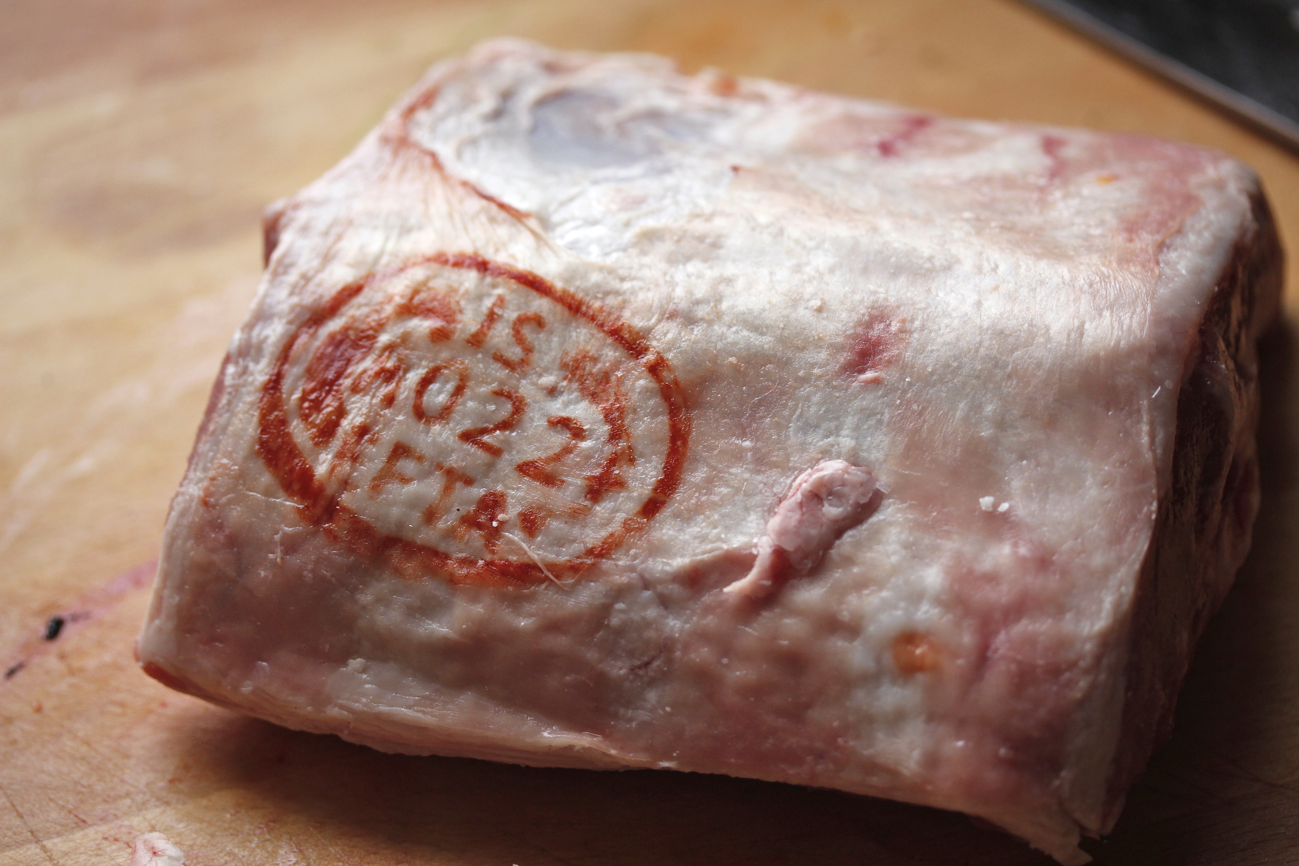 Þegar ég lærði matreiðslu í gagnfræðaskóla var lögð mikil áhersla á að skera stimplana af kjötinu. Ég vissi reyndar aldrei af hverju, hef enga trú á að það séu einhver eiturefni í stimpilblekinu, en líklega var þetta vegna fegurðarsjónarmiða. Allavega innprentaðist þetta svo sterklega í mig að það eru ekki mörg ár síðan ég hætti að nenna þessu. Svona almennt. En þessi hryggbiti var stimplaður svo rækilega, báðum megin hryggjarbeinsins, að ég gat bara ekki látið stimplana eiga sig og þarna er ég búin að skera annan af …