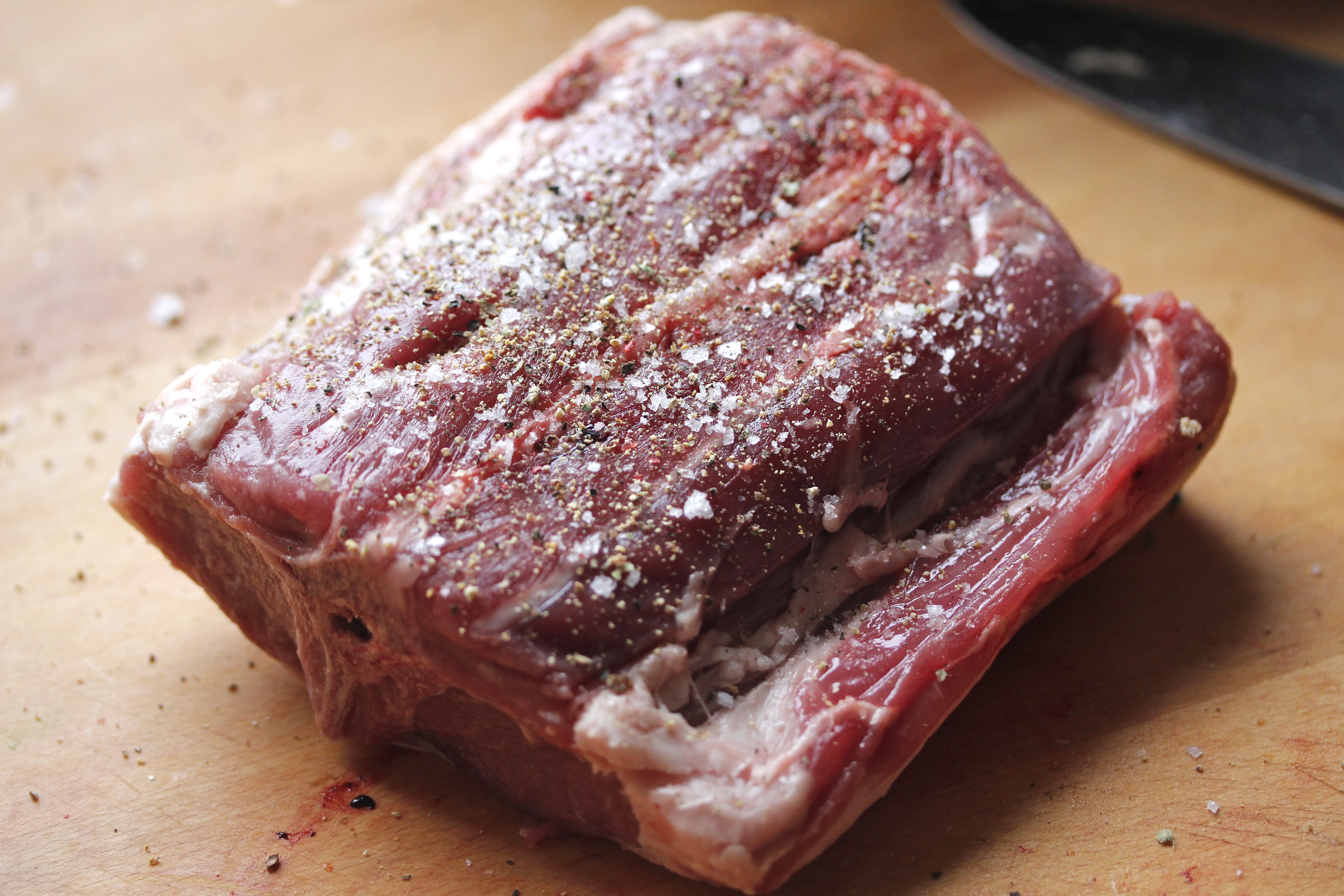 (Annars vildi ég óska þess að hægt væri að fá víðar hálfan hrygg, sagaðan eftir endilöngu og án hryggbeins en með rifjum – ef mig langar að elda svoleiðis þarf ég oftast að höggva hann sjálf með minni traustu kjötöxi.)