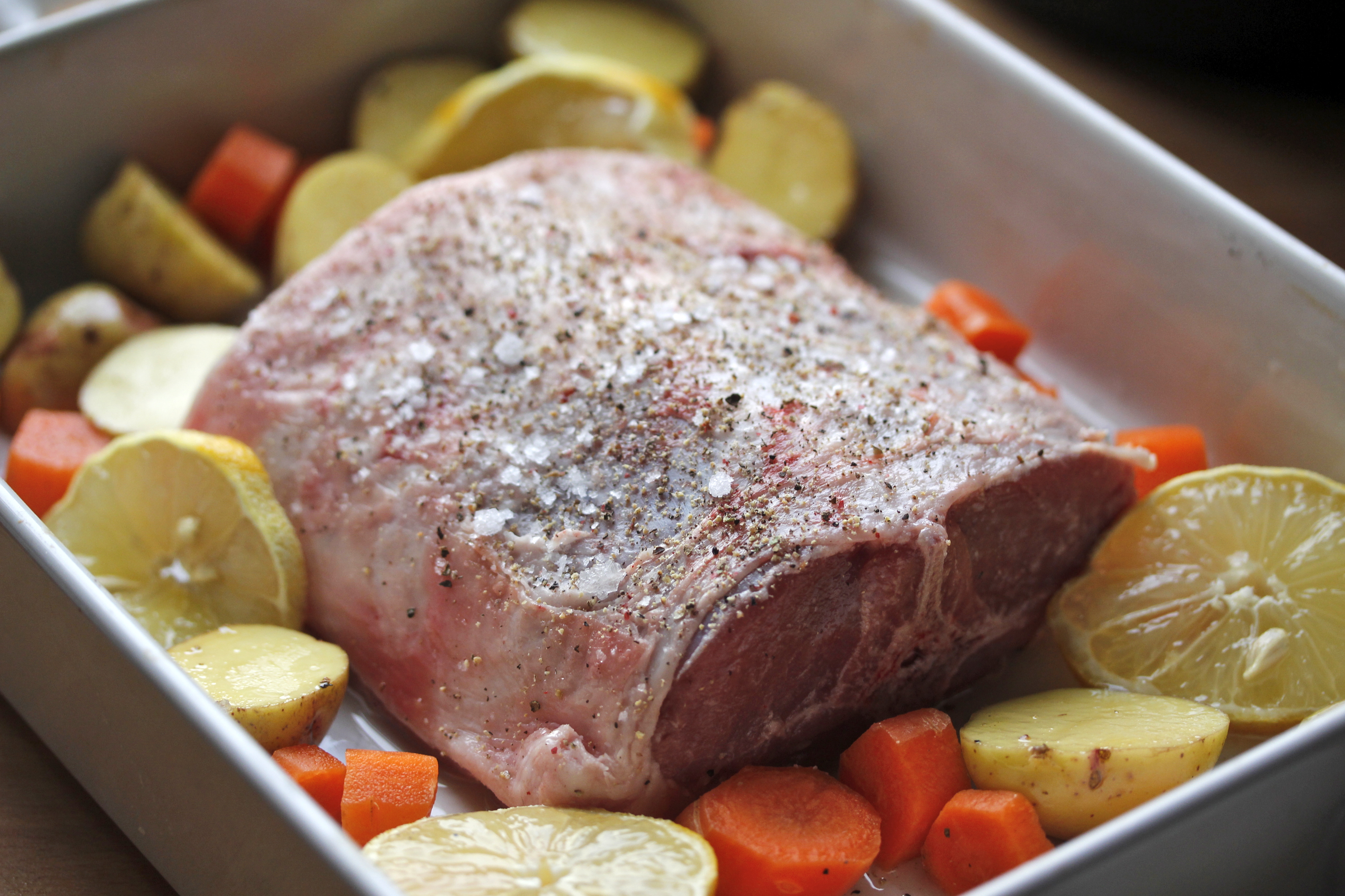 Þetta var fallegur hryggjarbiti, vel holdfylltur með lundinni neðan á. Ég kryddaði hann með pipar og salti og lét standa á meðan ég hitaði ofninn í 225°C.