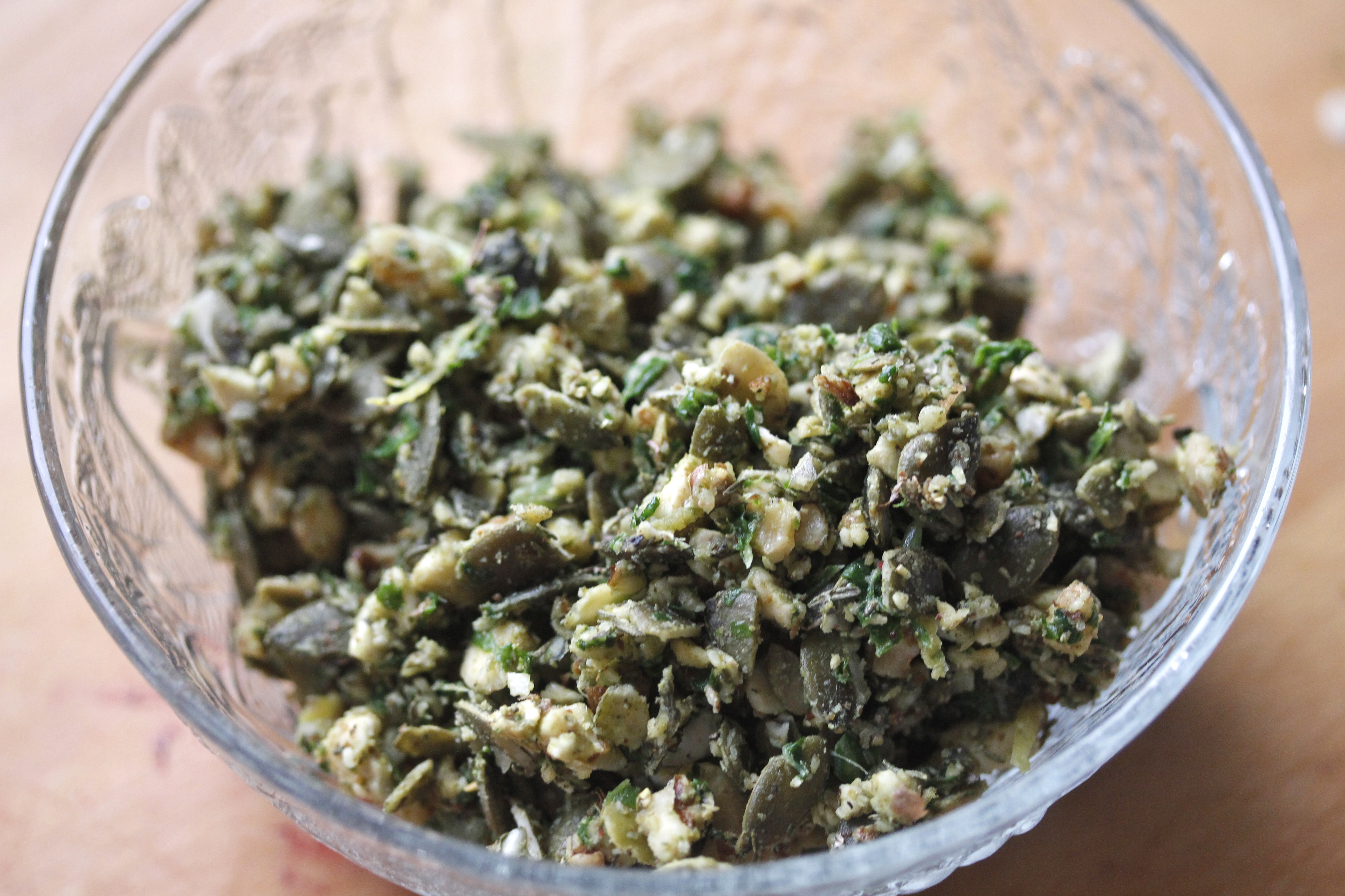 Á meðan tók ég litlu matvinnsluvélina mína og setti í skálina 3 msk af graskersfræjum, 3 msk af kasjúhnetum, litla lófafylli af basilíkublöðum, rifinn börk af 1/2 sítrónu ásamt svolitlu af safa, 1/2 tsk af kummini, pipar og salt.