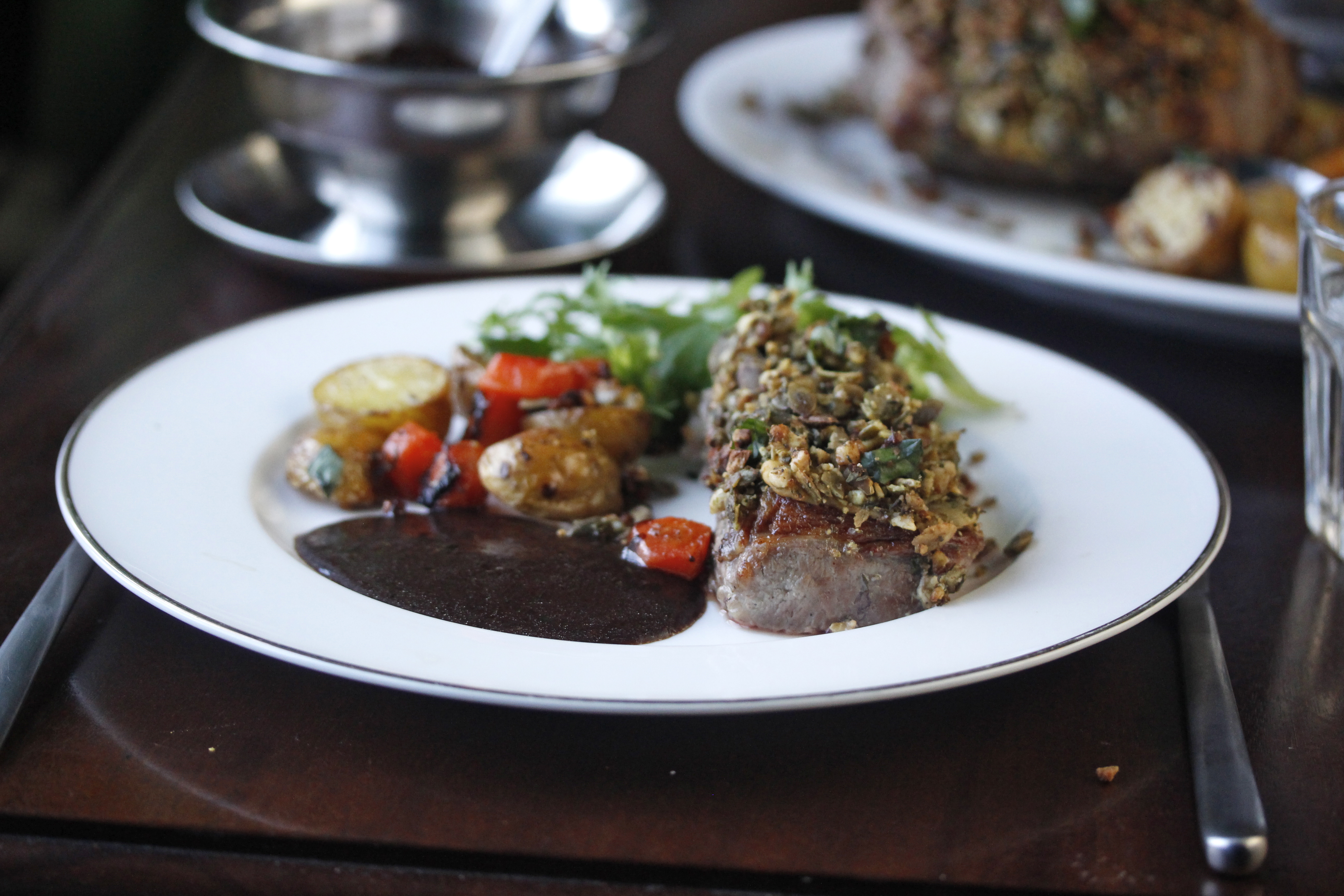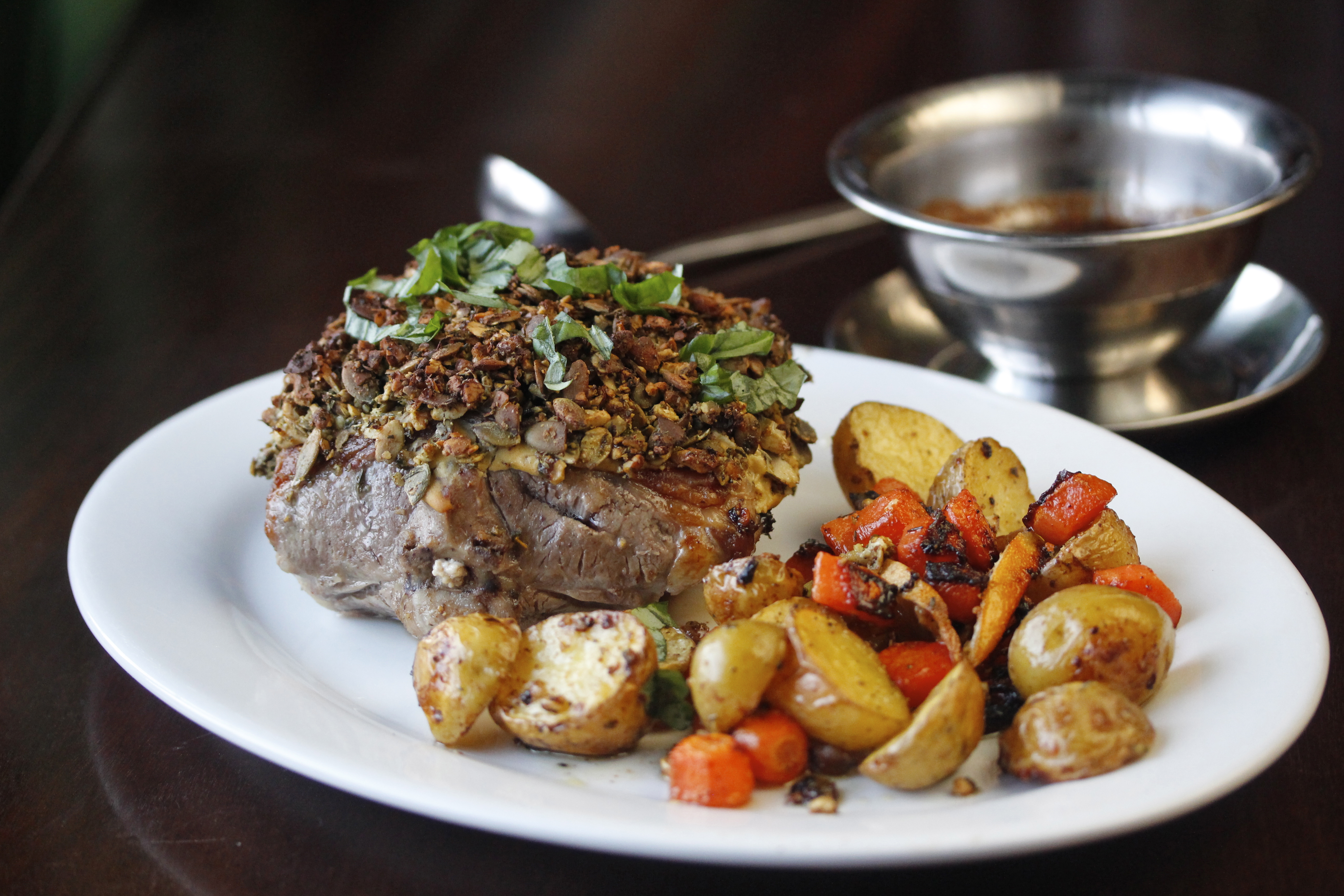 Lambahryggur undir graskersfræja- og hnetuþekju