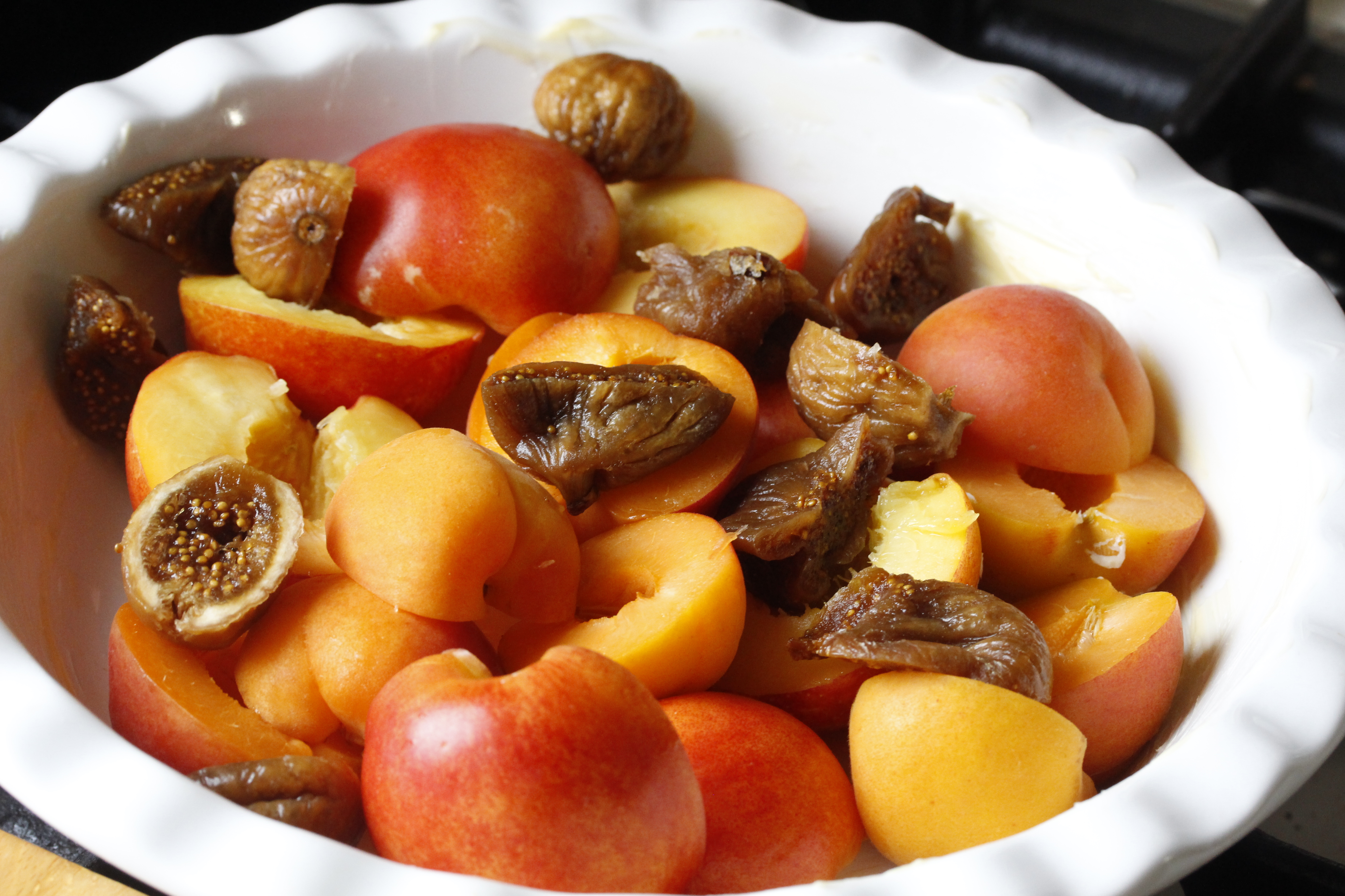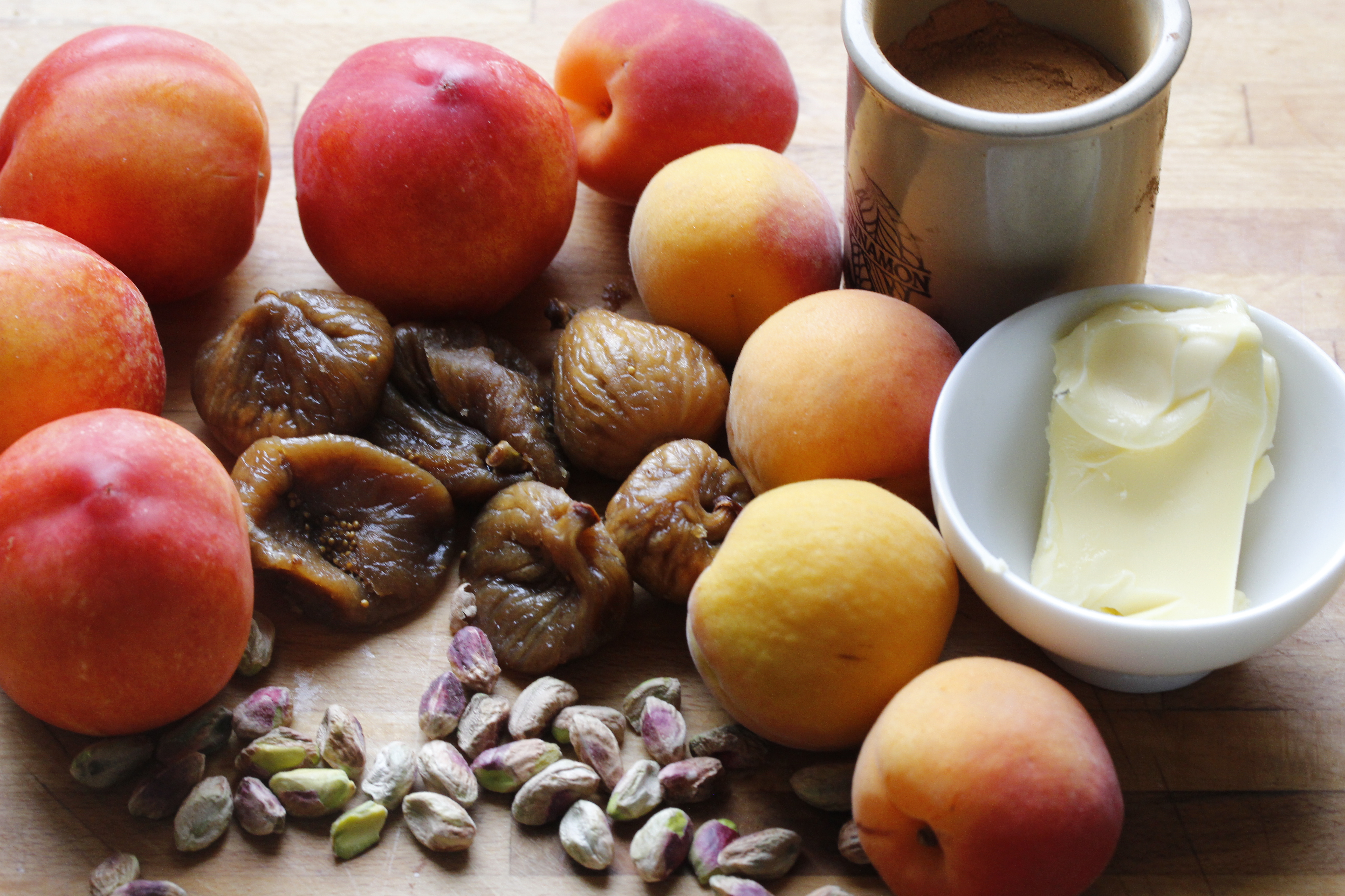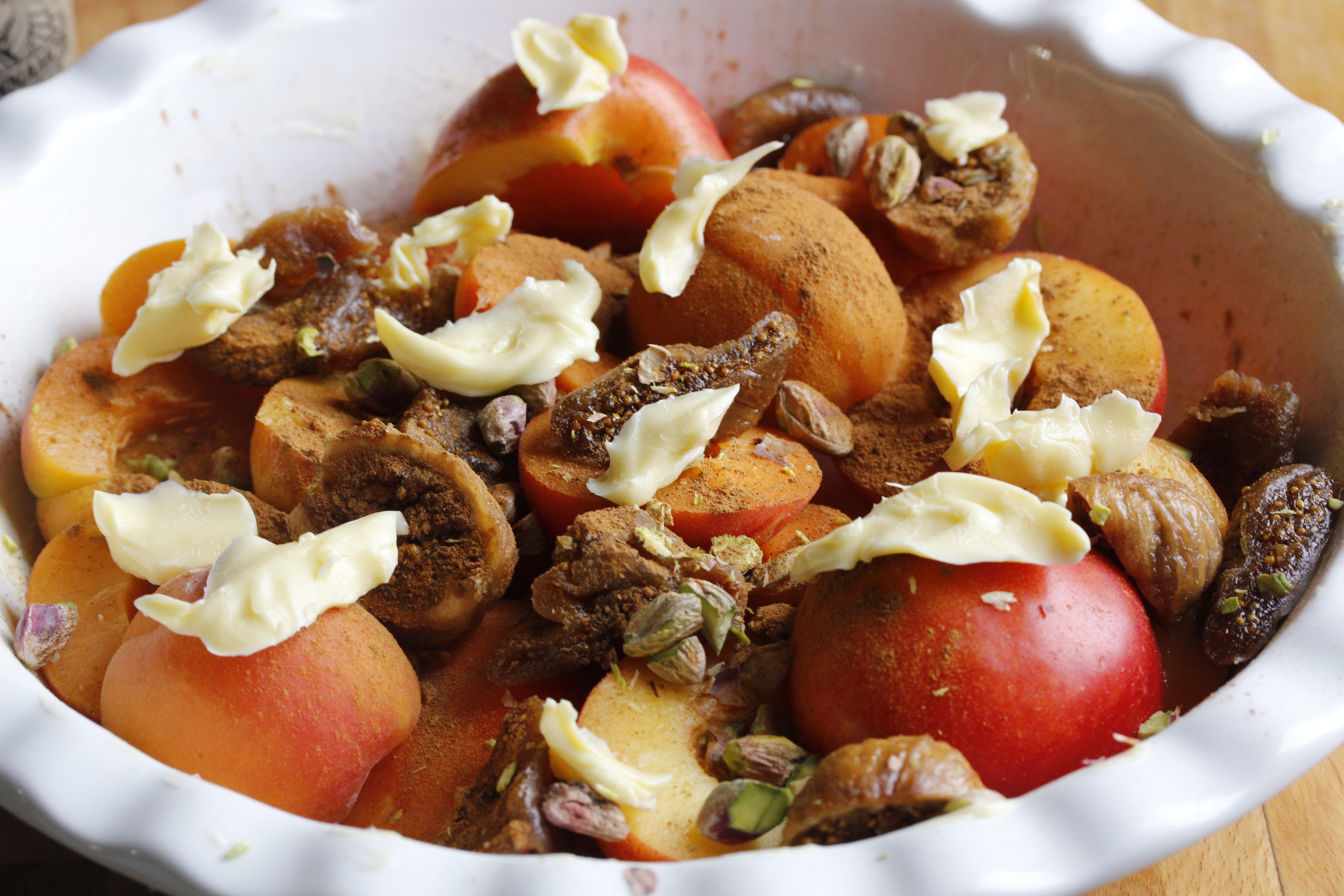Ég kveikti á ofninum og stillti hann á 200°C. Skar svo nektarínurnar og apríkósurnar (eða þá ávexti sem notaðir eru) í tvennt og fjarlægði steinana. Skar svo gráfíkjurnar í 3–4 bita hverja (og það má ekki gleyma að fjarlægja stilkinn) og grófsaxaði pistasíurnar. Svo smurði ég bökumót (eða annað eldfast mót) með dálitlu af smjörinu og setti ávextina og hneturnar í mótið.