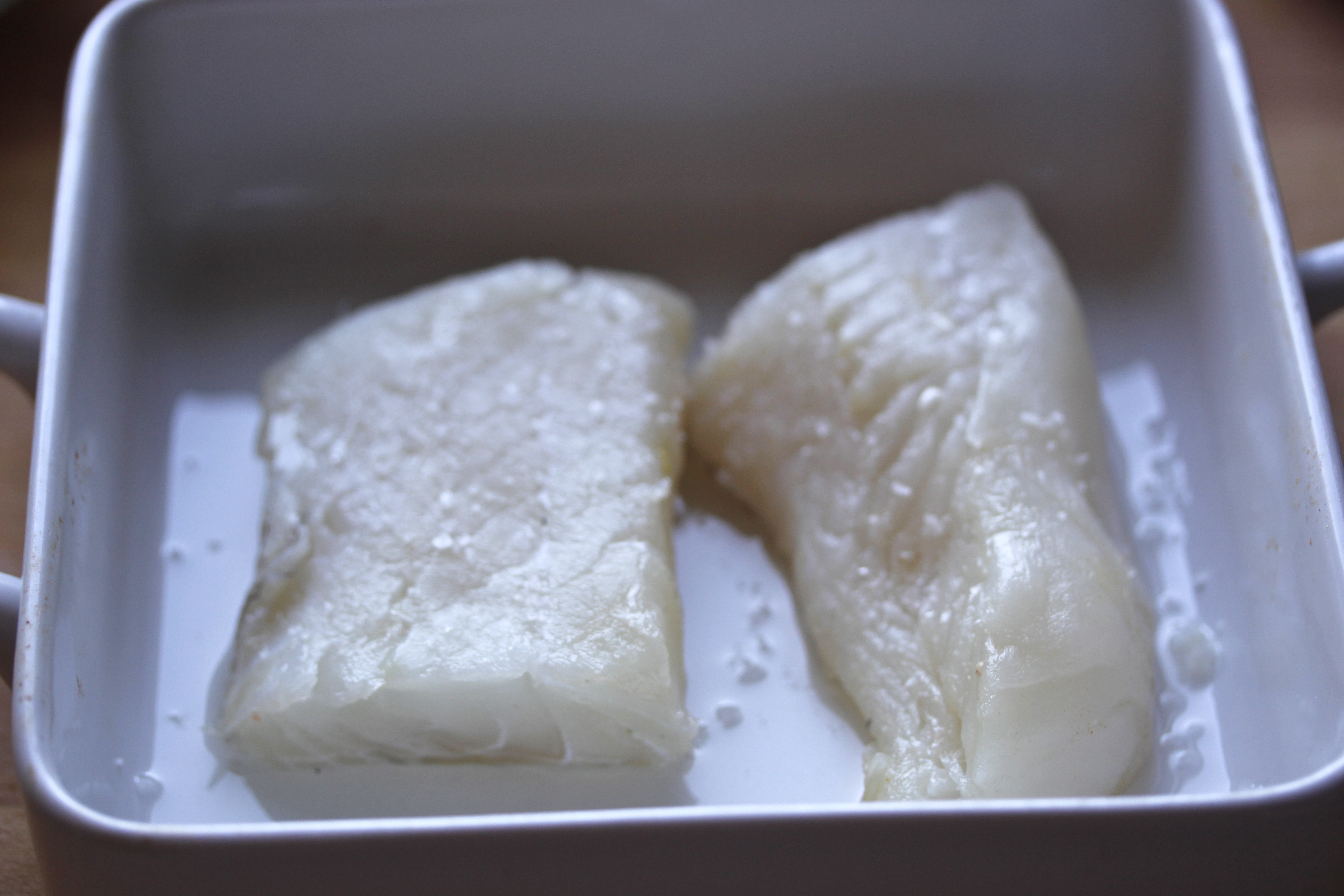 Ég átti svona 370 g af löngu, roð- og beinlausri, en það mætti líka nota einhvern annan hvítan fisk. Penslaði lítið, eldfast mót með olíu, kryddaði fiskinn með pipar og salti og setti í mótið.