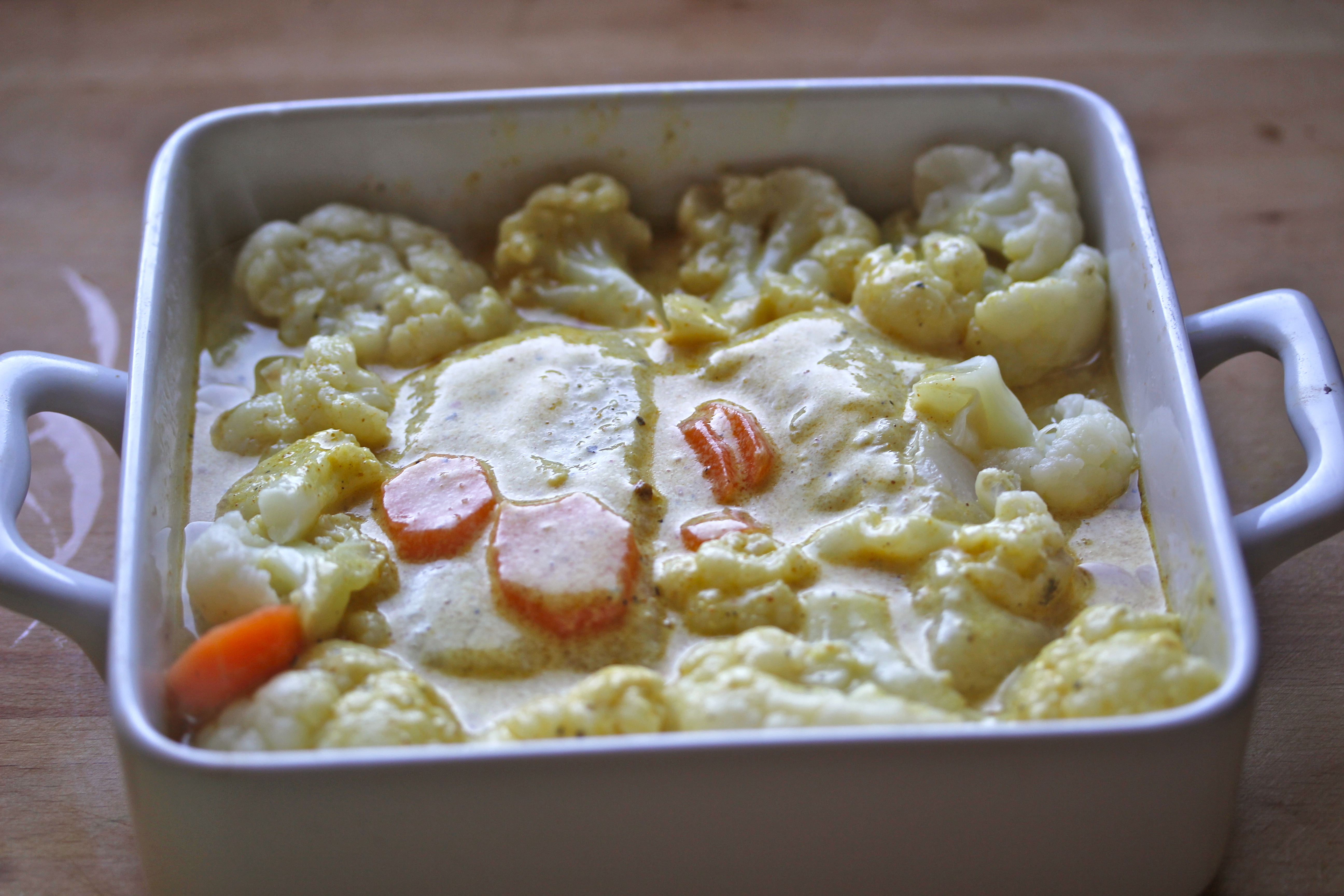 Ég hitaði ofninn í 200°C. Tók svo 300 g af blómkáli og skipti niður í kvisti. Flysjaði 2-3 gulrætur og skar í sneiðar. Sauð grænmetið svo í léttsöltuðu vatni þar til það var nærri meyrti.