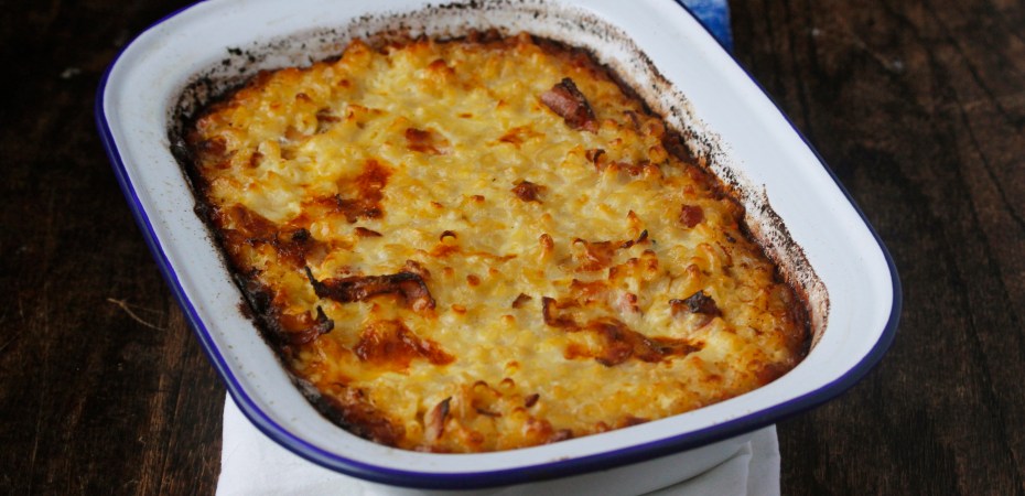 Þessi uppskrift, sem birtist í MAN í haust, er byggð á uppskrift sem ég fékk eitt sinn hjá bandaríska rithöfundnum John Thorne, sem raunar var þeirrar skoðunar að öllum matreiðslubókum sem væru með mac’n’cheese-uppskrift sem innihéldi hvíta sósu ætti að henda út um gluggann. Uppskrift hans var hins vegar með niðursoðinni mjólk, sem mér fannst ekki góð hugmynd heldur svo að ég notabara rjóma í staðinn. Hann sagði líka að osturinn ætti að vera aðalhráefnið og þar er ég aftur á móti alveg sammála – þessi útgáfa inniheldur aðeins meira af osti en makkarónum.