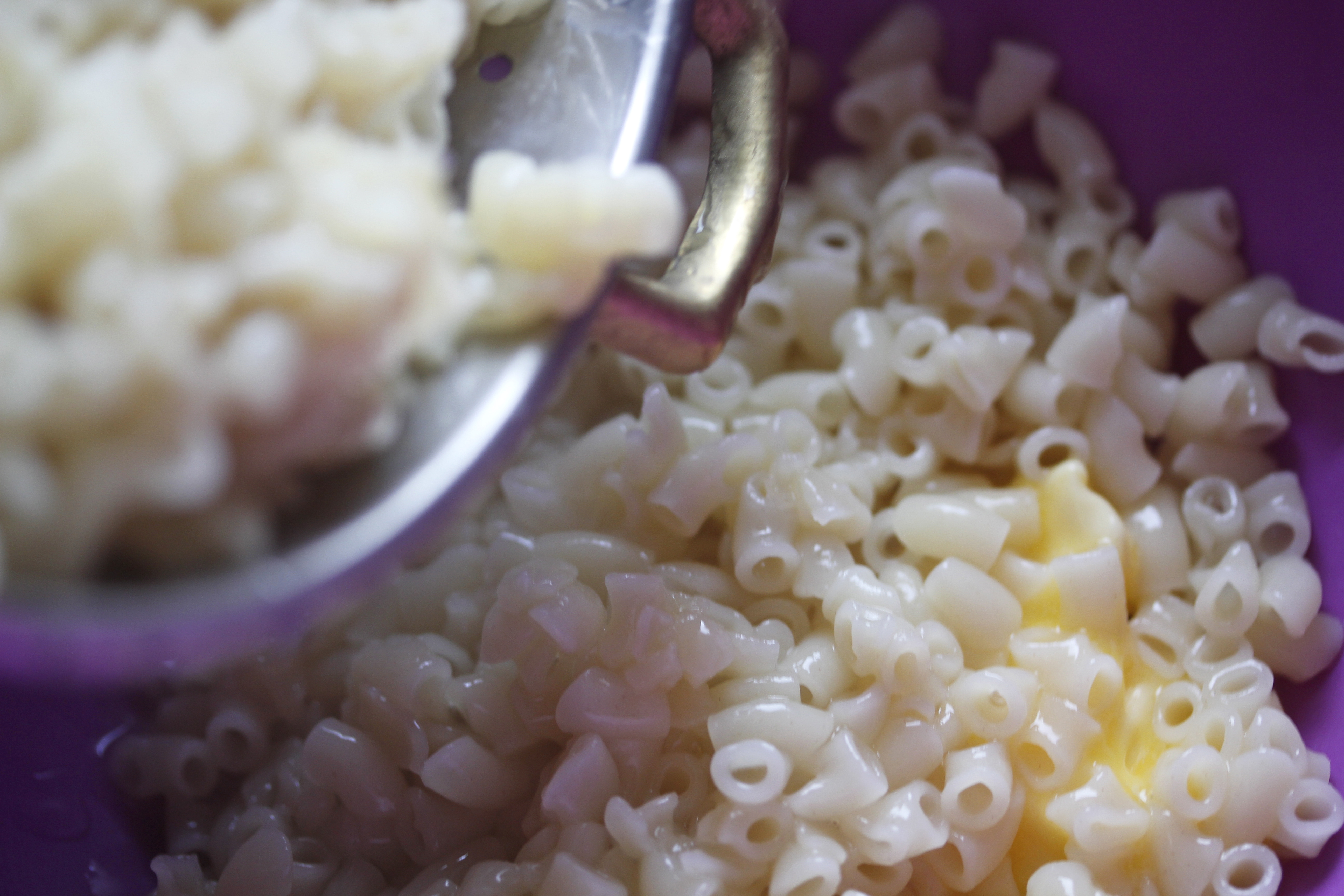 Ég tók svo 50 g af smjöri, notaði 1 msk til að smyrja form en setti hitt í skál. Þegar makkarónurnar voru soðnar (eða rétt tæplega) hellti ég þeimí sigti og lét renna af þeim en hvolfdi þeim svo út í skálina og hrærði þar til smjörið var bráðið.