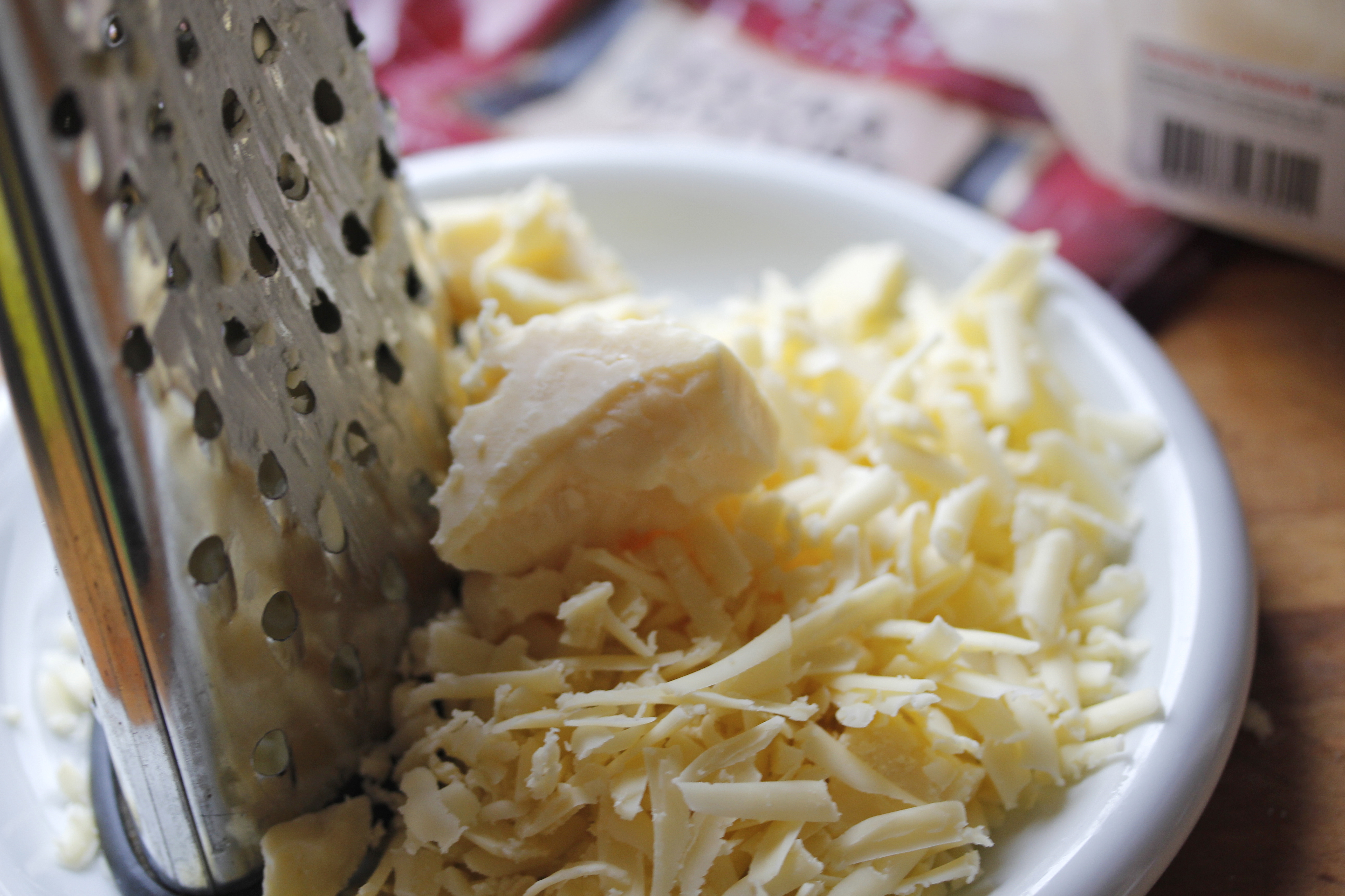 Ég reif svo niður 150 g af cheddar og 150 g af sterkum gouda. Það má nota aðrar tegundir af osti en best að hann sé frekar bragðmikill.