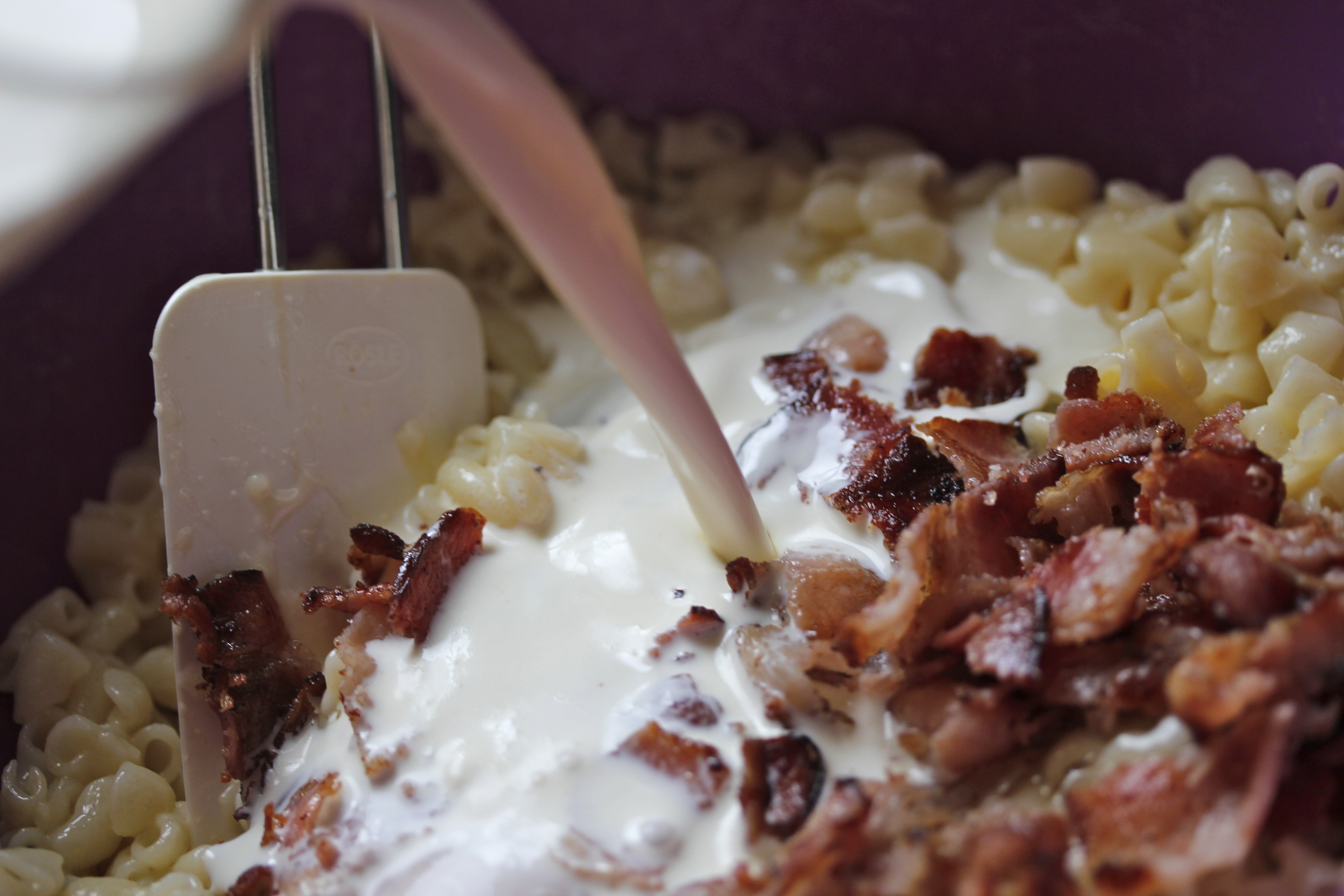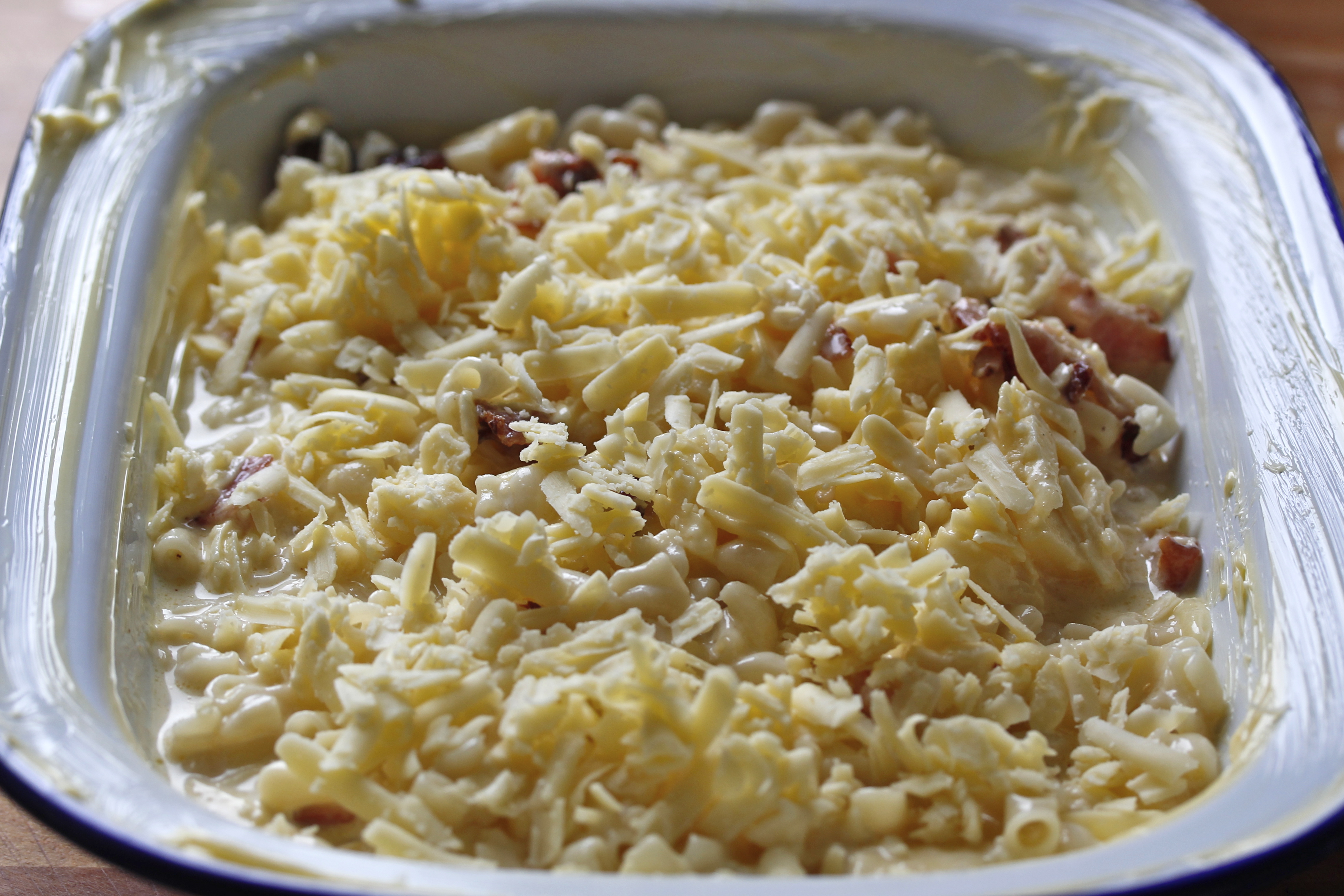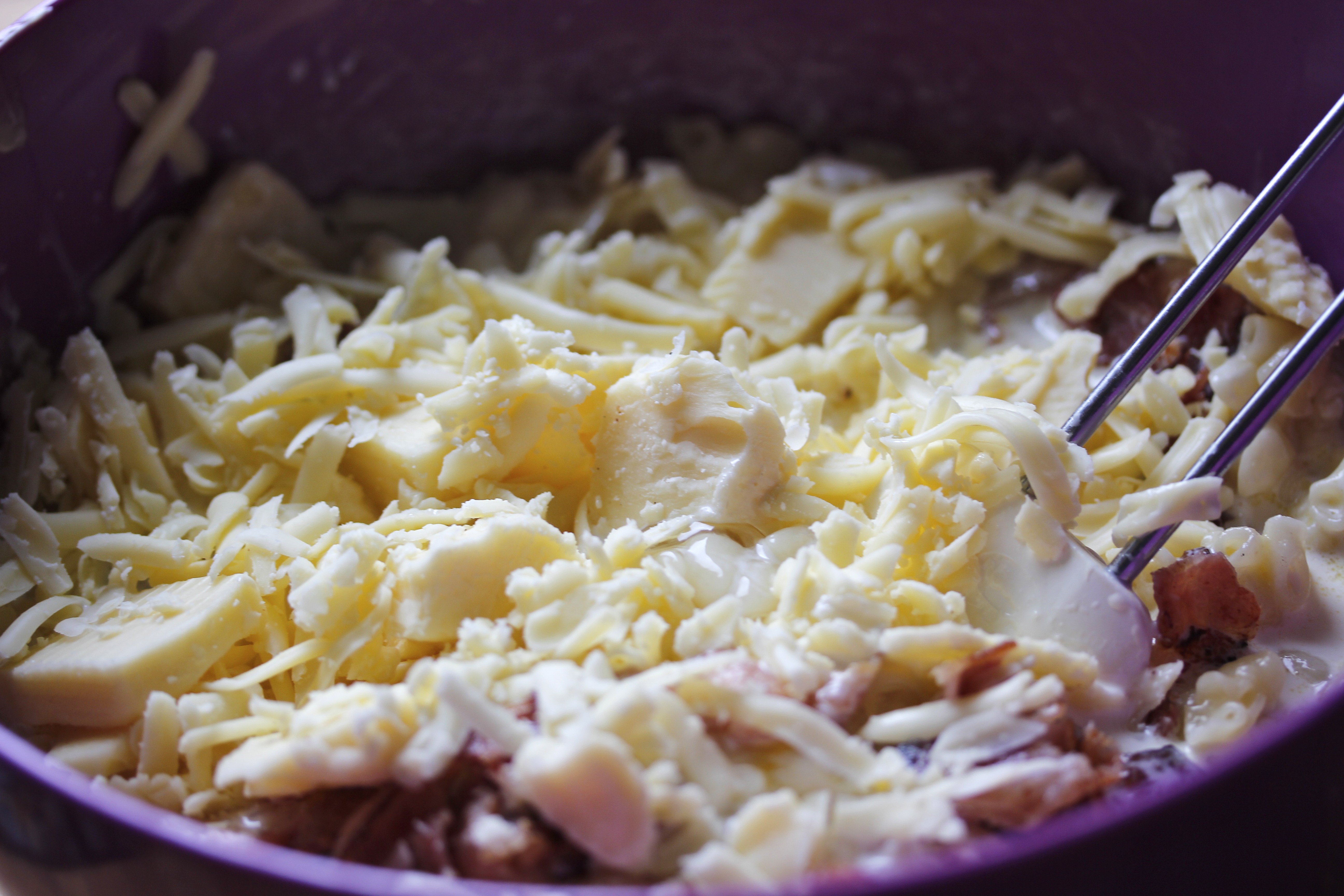 Ég byrjaði á að kveikja á ofninum og hita hann í 220°C. Hitaði svo saltvatn í potti og sauð 250 g af makkarónum í 6-7 mínútur, eða þar til þær voru rétt tæplega meyrar. Á meðan steikti ég beikon – ætli það hafi ekki verið svona 150 g – á pönnu þar til það var stökkt, setti það á eldhúspappír, lagði meiri eldhúspappír ofan á og pressaði til að losna við eitthvað af beikonfitunni. Skar svo beikonið í bita.