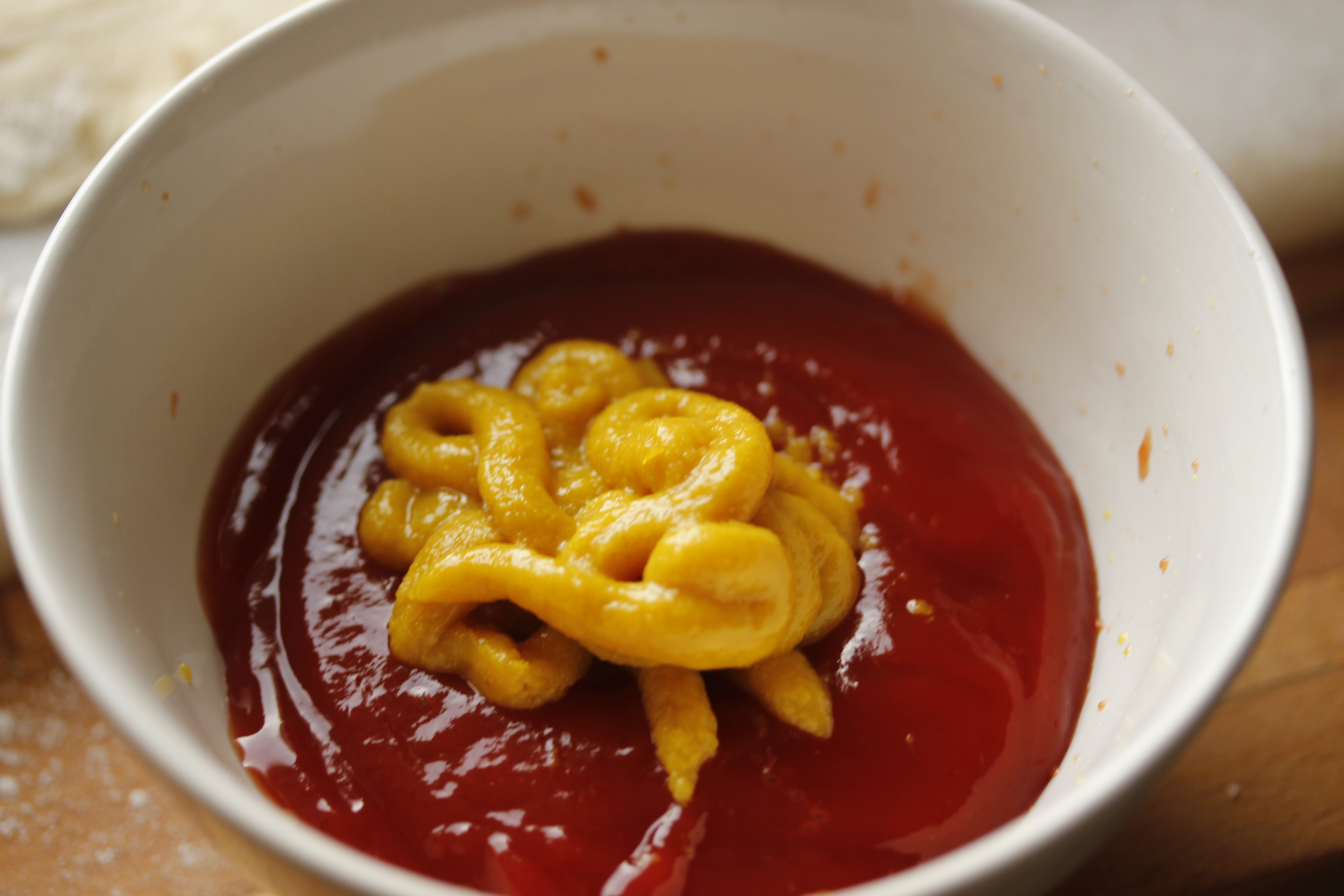 Ég var semsagt að gera tvenns konar snúða og byrjaði á pylsusnúðunum. Hrærði saman í skál 100 ml af tómatsósu og 1 msk af sætu sinnepi.