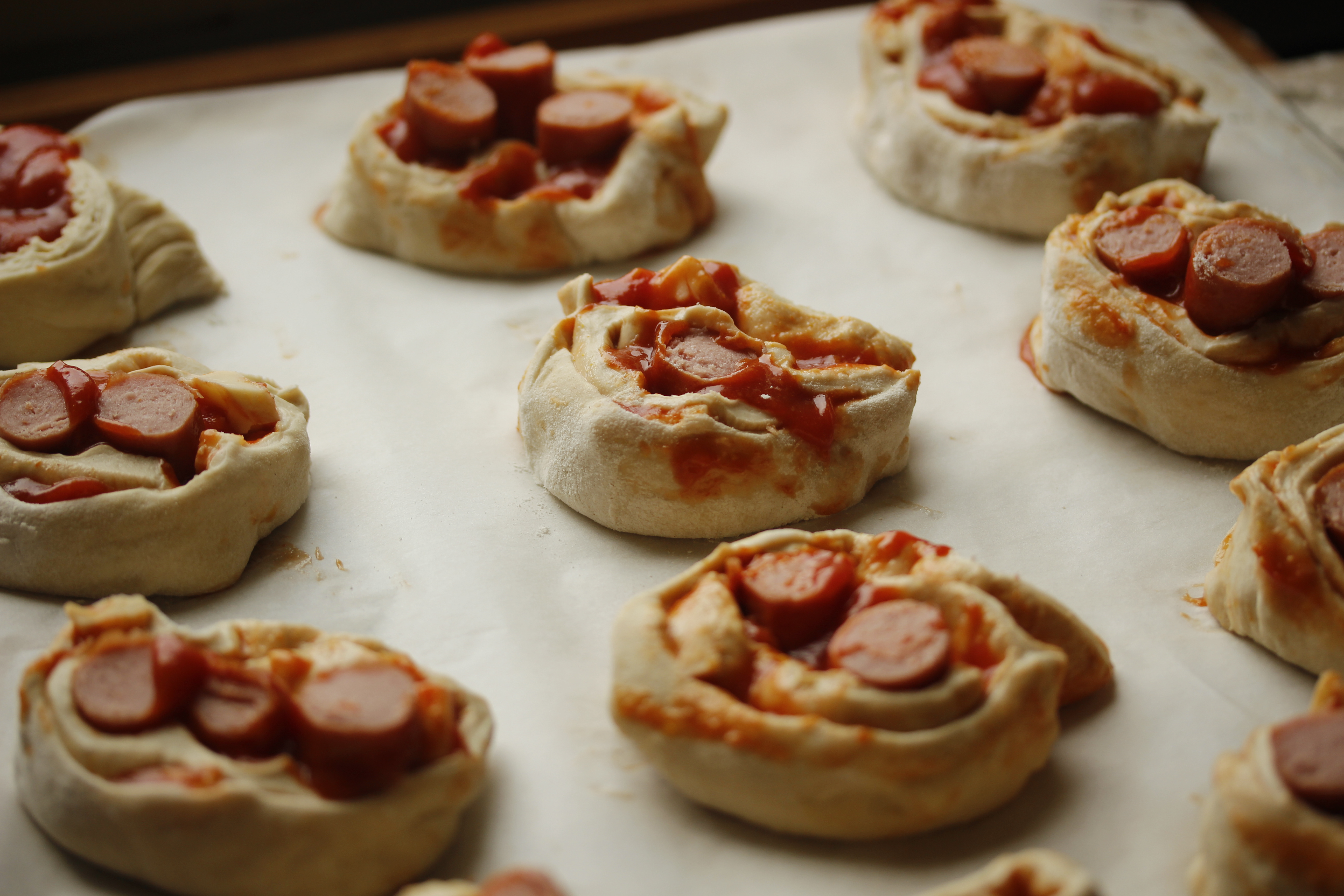 Svo rúllaði ég deiginu upp þannig að pylsurnar voru í miðjunni og skar rúlluna í 1½-2 cm þykkar sneiðar. Raðaði sneiðunum á pappírsklædda bökunarplötu og hafði dálítið bil á milli.