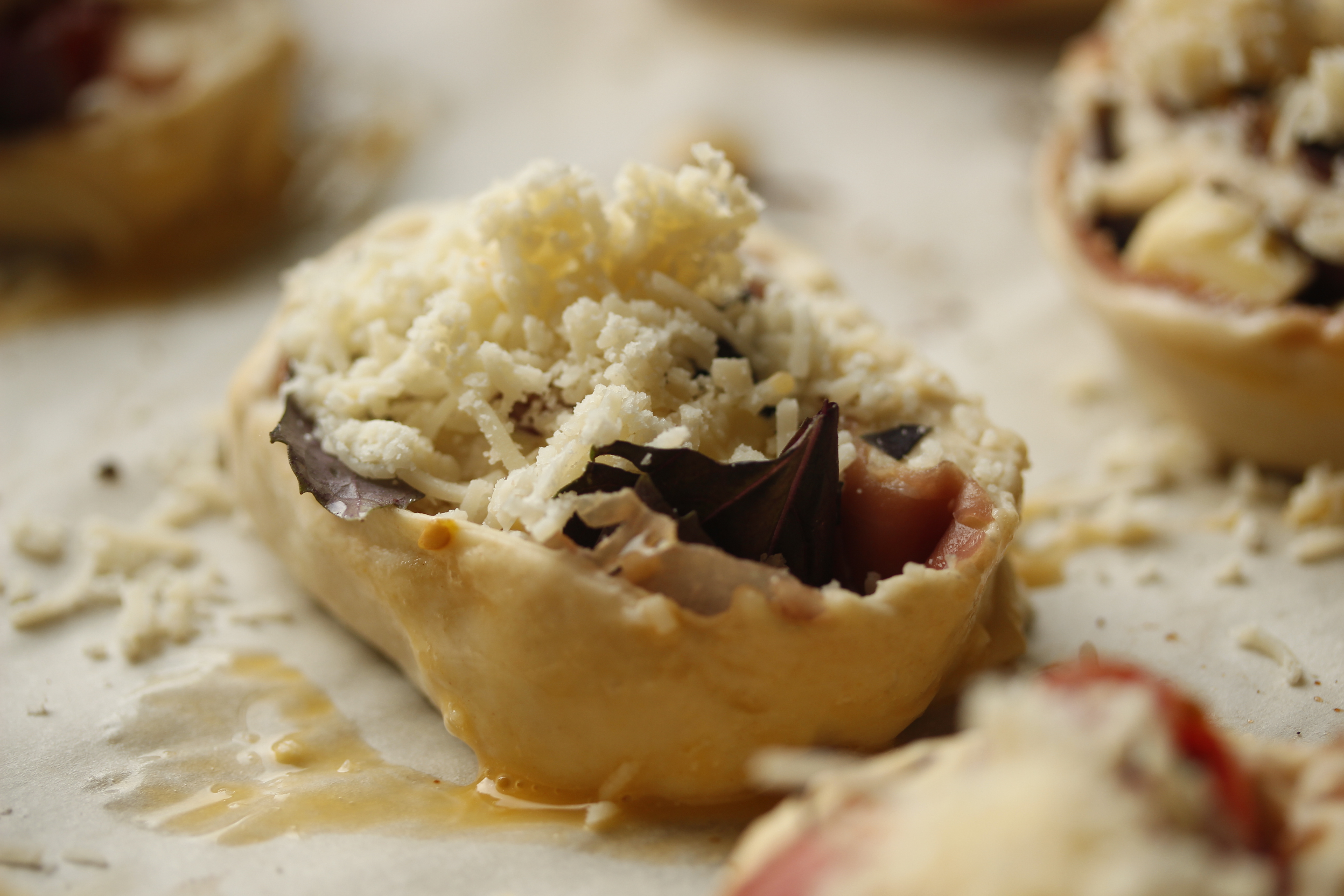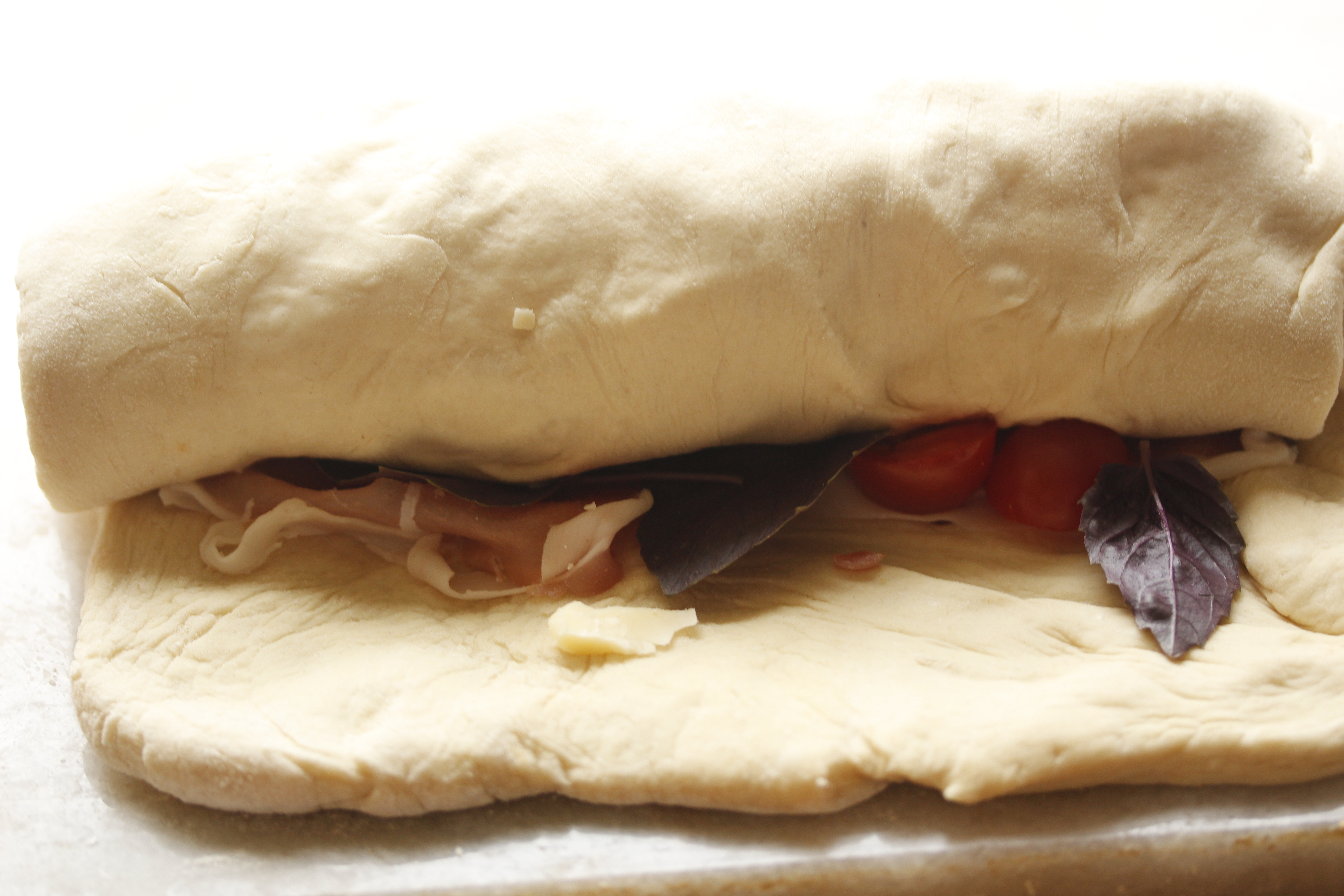 Þá voru það skinkusnúðarnir: Ég tók hinn deigrétthyrninginn og dreifði á hana 80-100 g af hráskinku (1 bréfi). Skar 100 g af kirsiberjatómötum í tvennt og dreifði yfir, ásamt lófafylli af basilíkublöðum (vildi svo til að ég átti aðallega fjólubláa basilíku, en það má auðvitað vera venjuleg.