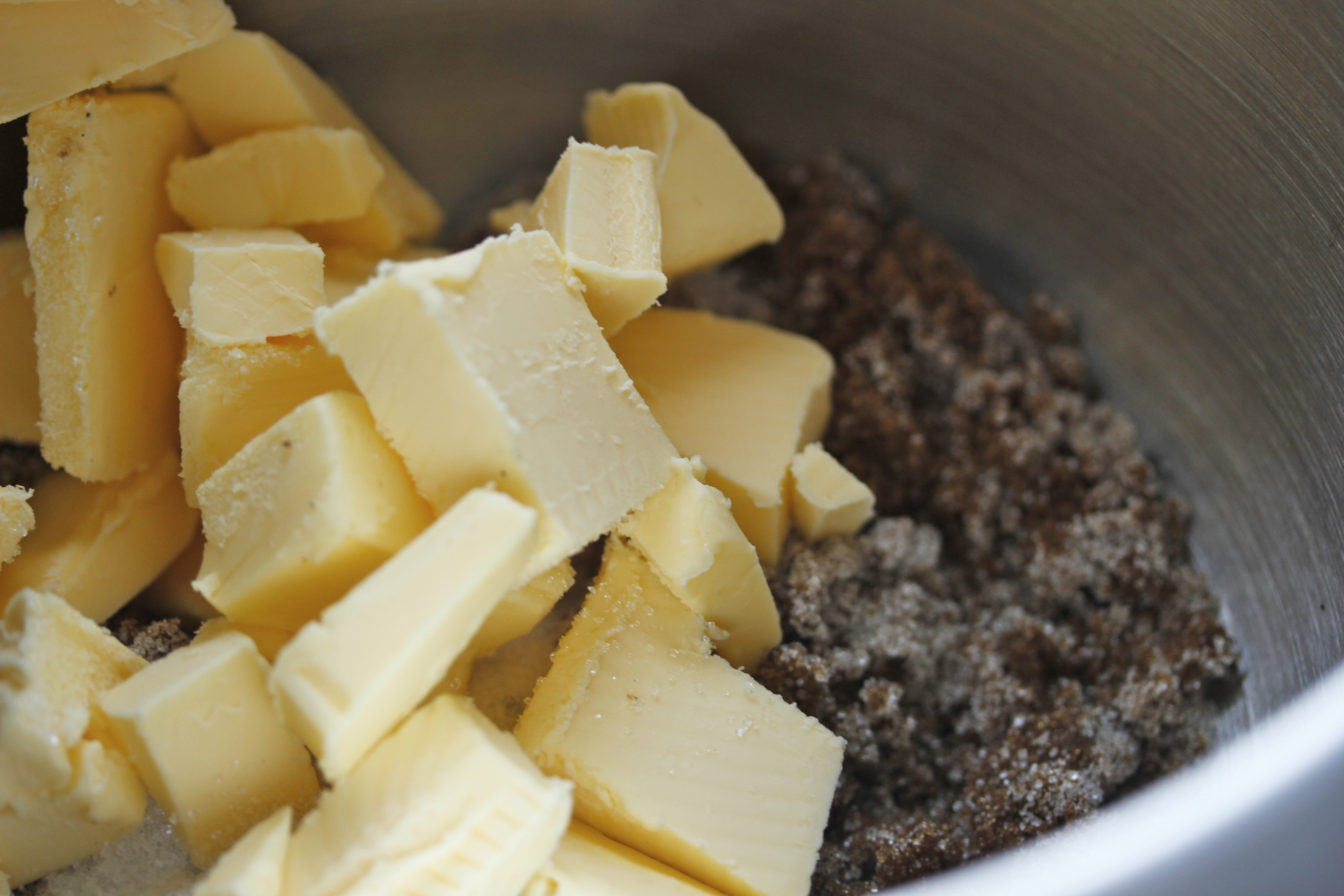 Ég byrjaði á að kveikja á ofninum og hita hann í 180°C. Svo tók ég hrærivélina og setti 150 g af púðursykri, 50 g af sykri og 200 g af smjöri í hrærivélarskálina – eiginlega hefði smjörið átt að vera lint en þar sem ég tók það beint úr kæli skar ég það í frekar litla bita svo að það hrærðist betur.