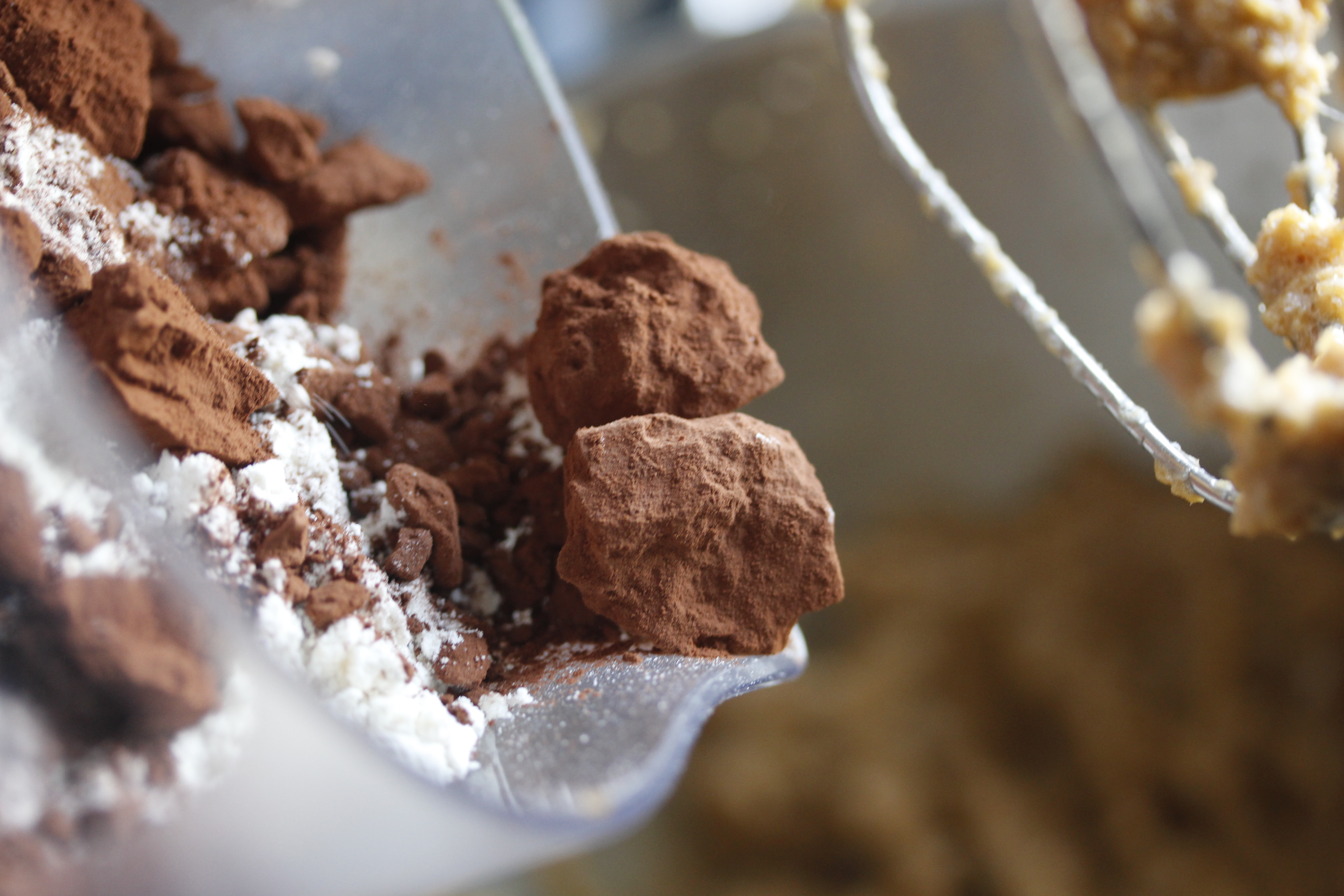 Að lokum blandaði ég hnetusmjörshnöppunum saman við. Deigið á að vera fremur blautt en þó þannig að hægt sé að rúlla úr því kúlur með lófunum. Bættu við svolitlu hveiti ef það er of blautt, eggjahvítu (það á jú að vera ein afgangs) ef það er of þurrt.