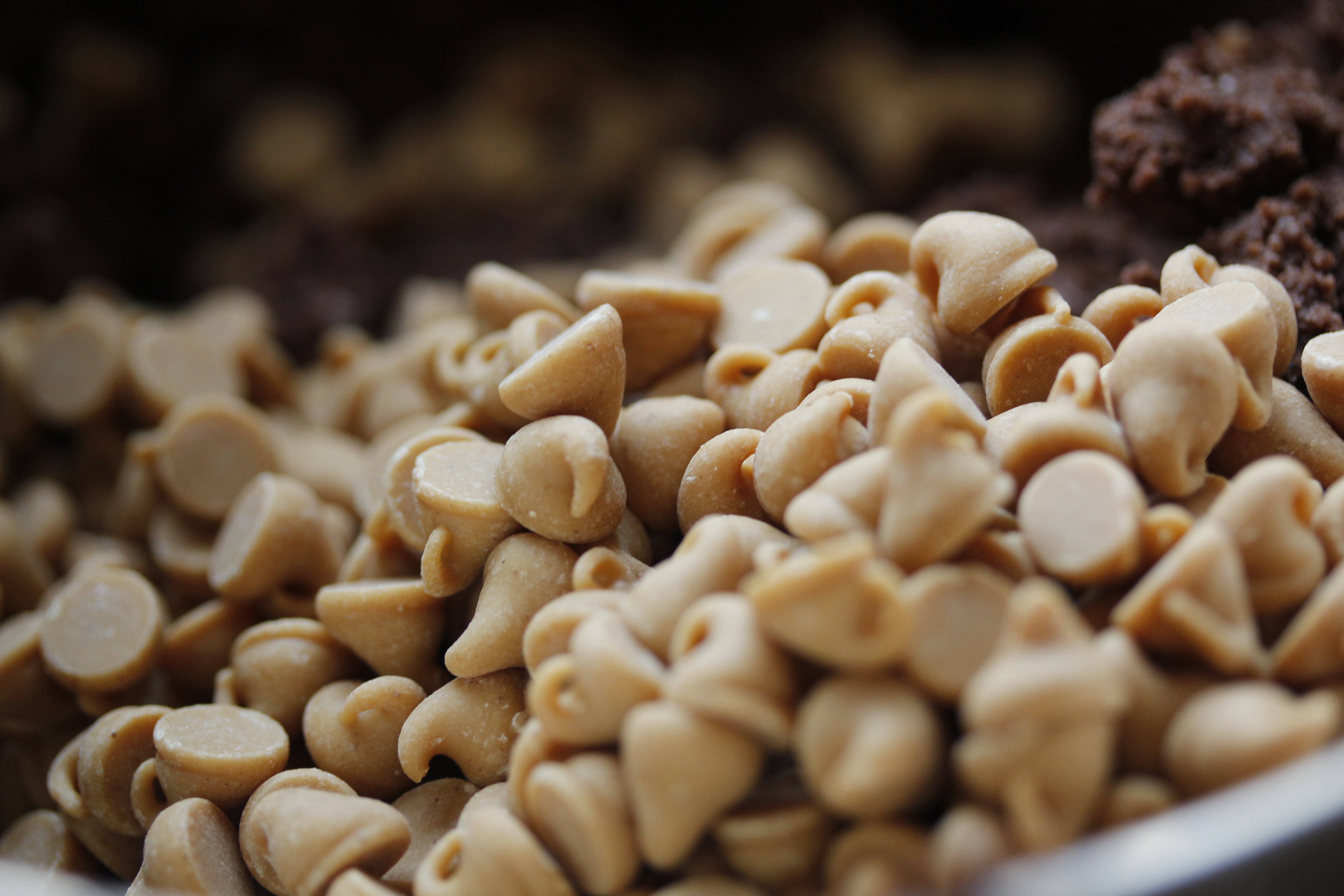Smákökur eru ekki bara jólakræsingar, auðvitað er hægt að baka þær á hvaða árstíma sem er. Þessar hér bakaði ég snemma í haust og þær voru reyndar fljótar að klárast líka. Ég rakst á hnetusmjörsdropa (Reese’s Peanut Butter Chips) í Nóatúni og keypti þá með það í huga að baka smákökur. Notaði að mestu leyti súkkulaðibitakökuuppskrift sem ég átti en gerði á henni smábreytingar. En í staðinn fyrir þá má líka nota súkkulaðidropa eða -bita, Smarties eða annað.