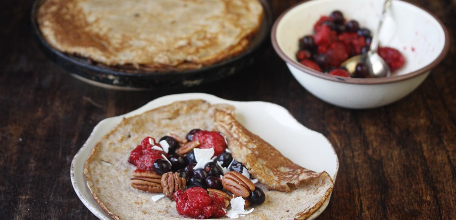 Mér þykir best að nota heilhveiti í morgunverðarpönnukökur, þær verða einhvernveginn minna bakkelsi við það, meiri matur (en síst verri á bragðið) og auðvitað hollari fyrir vikið. Og ég nota engan hvítan sykur fremur en í aðrar pönnukökur en stundum pínulítið hlynsíróp eða hunang (já, ég veit að það er ekkert hollara en það er betra á bragðið) en því má þó alveg sleppa. Ég setti svolítinn kanil í þessar hér en það mætti alveg nota önnur bragðefni, til dæmis vanillu eða rifinn sítrónubörk, og ef á að borða þær með ósætri fyllingu eins og hrísgrjónum og grænmeti mætti jafnvel setja smátt saxaðar kryddjurtir út í soppuna.