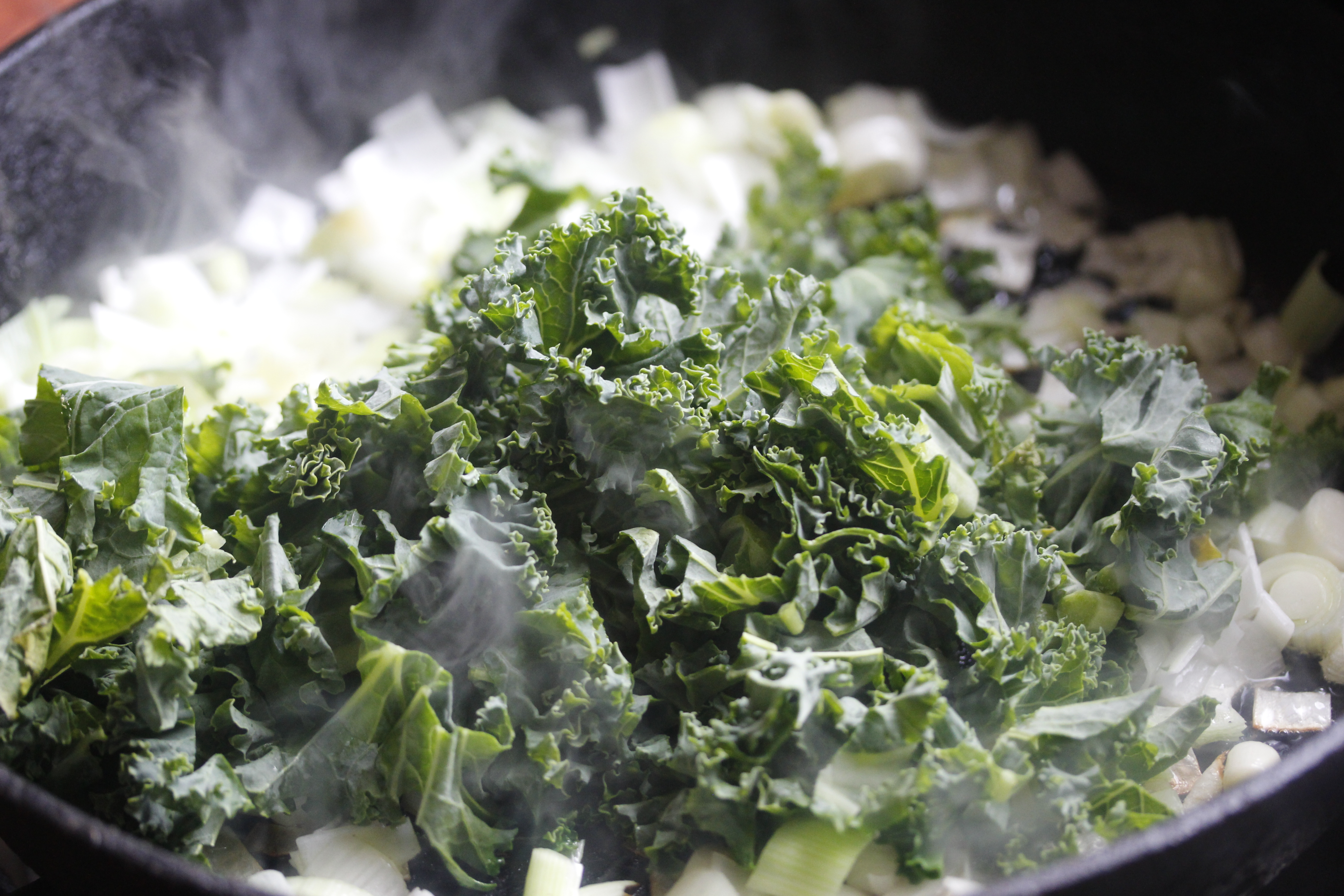 Svo hreinsaði ég 1 stóran blaðlauk (hvíta og ljósgræna hlutann, dökkgrænu blöðin má svo nota í soð eða súpu) og saxaði hann frekar smátt, saxaði 2-3 hvítlauksgeira smátt og skar stönglana úr 100 g af grænkálsblöðum og saxaði svo blöðin frekar gróft. Hitaði 2 msk af ólífuolíu á pönnu, lét blaðlauk og hvítlauk krauma í nokkrar mínútur án þess að brúnast. Svo setti ég grænkálið á pönnuna og lét krauma í 2-3 mínútur,