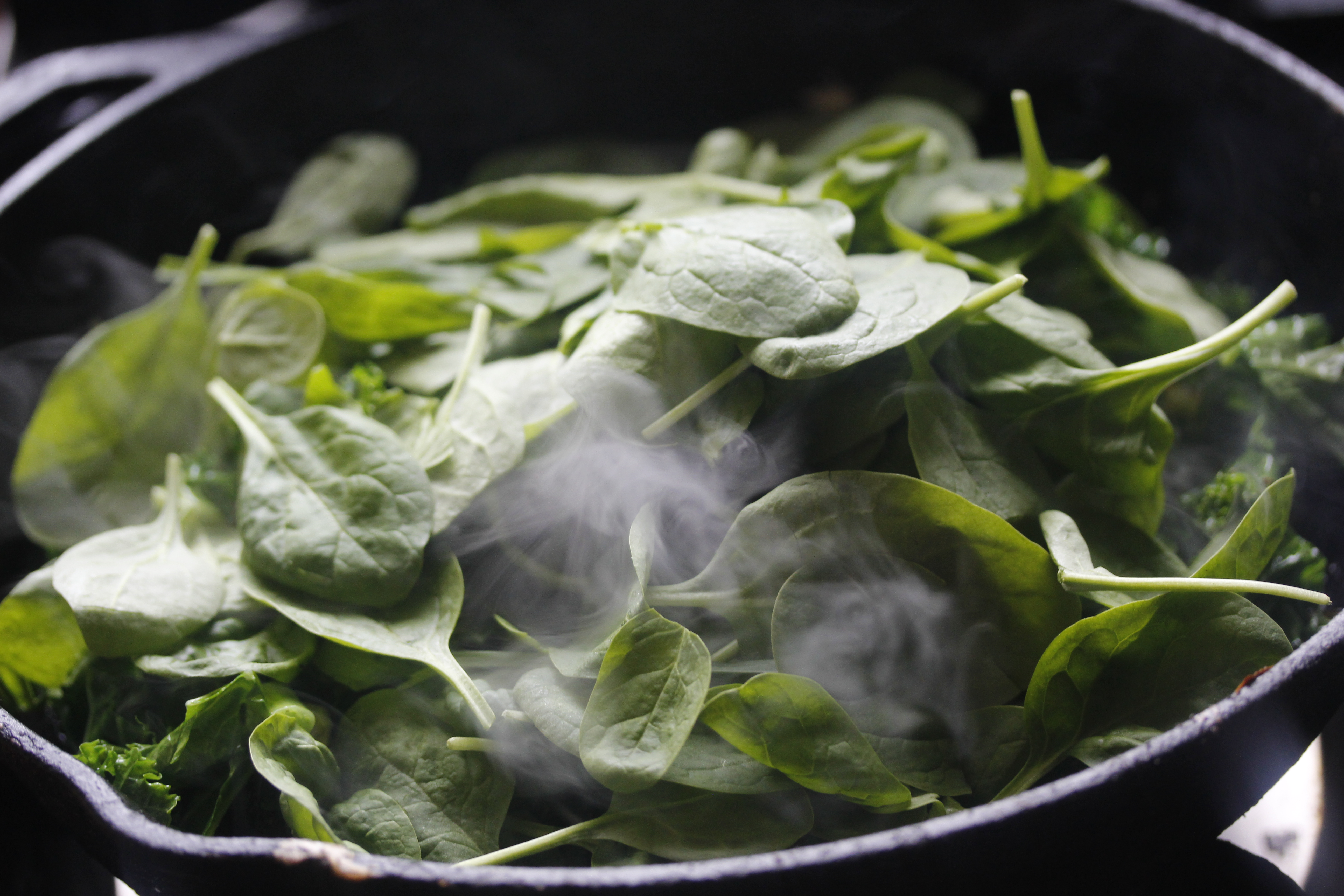 Þá bætti ég 100 g af spínati á pönnuna og lét krauma í um 2 mínútur í viðbót.