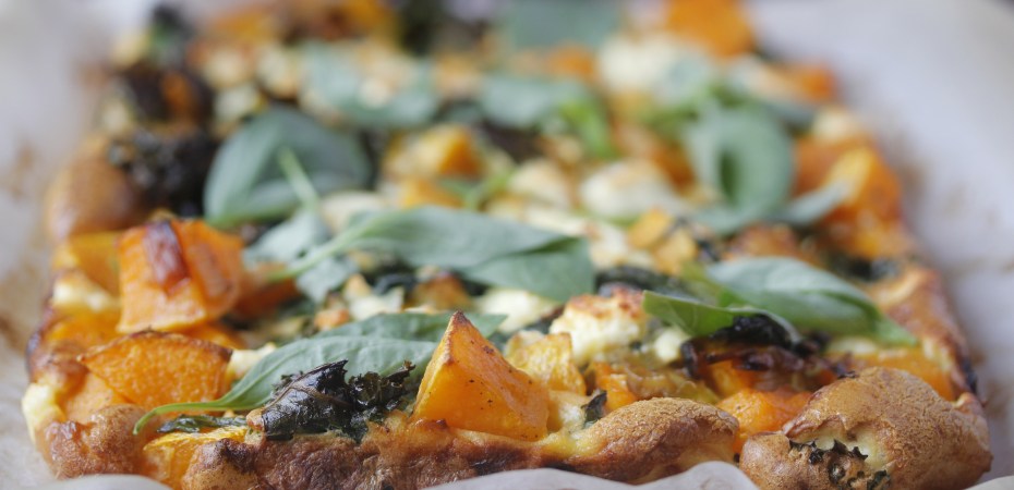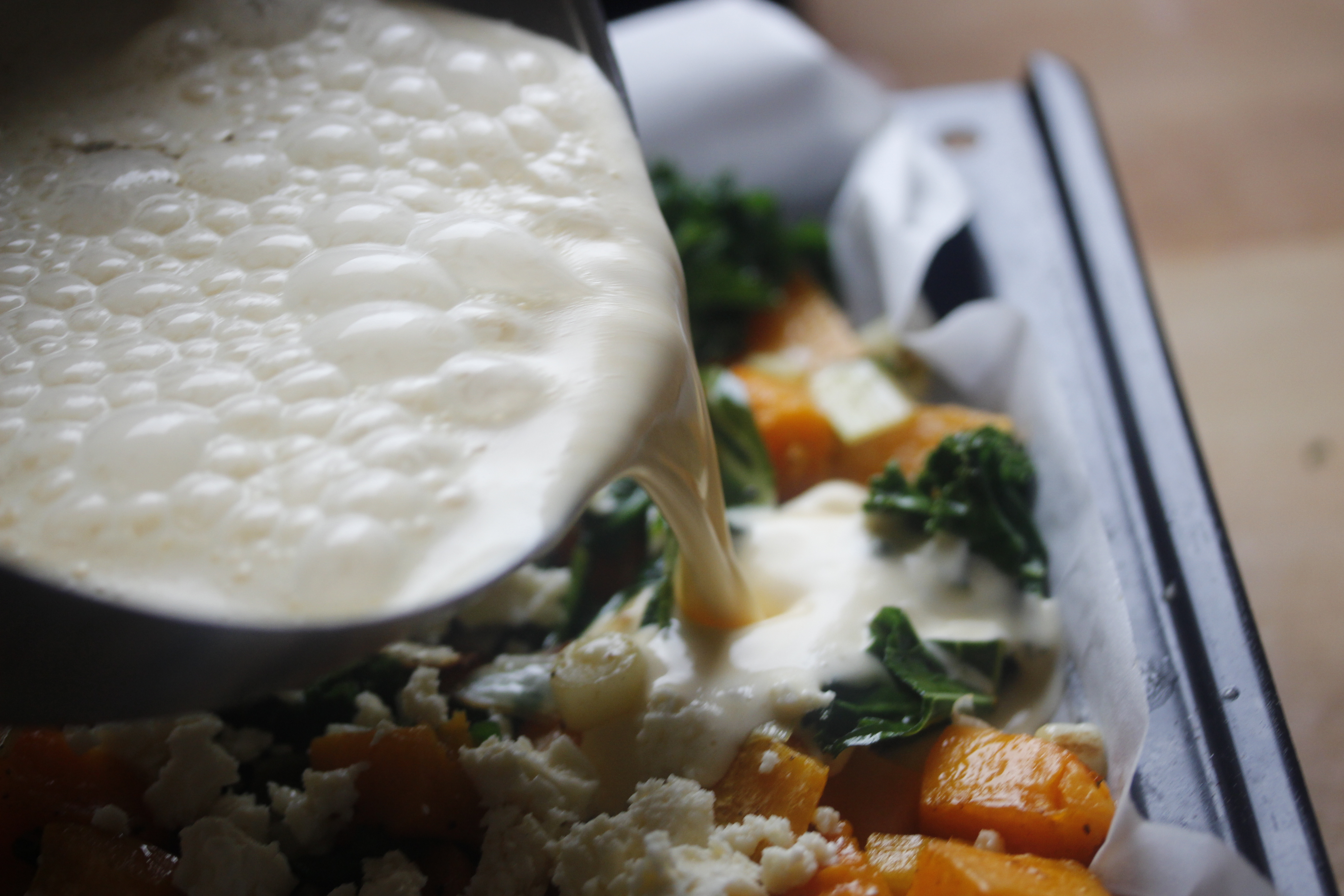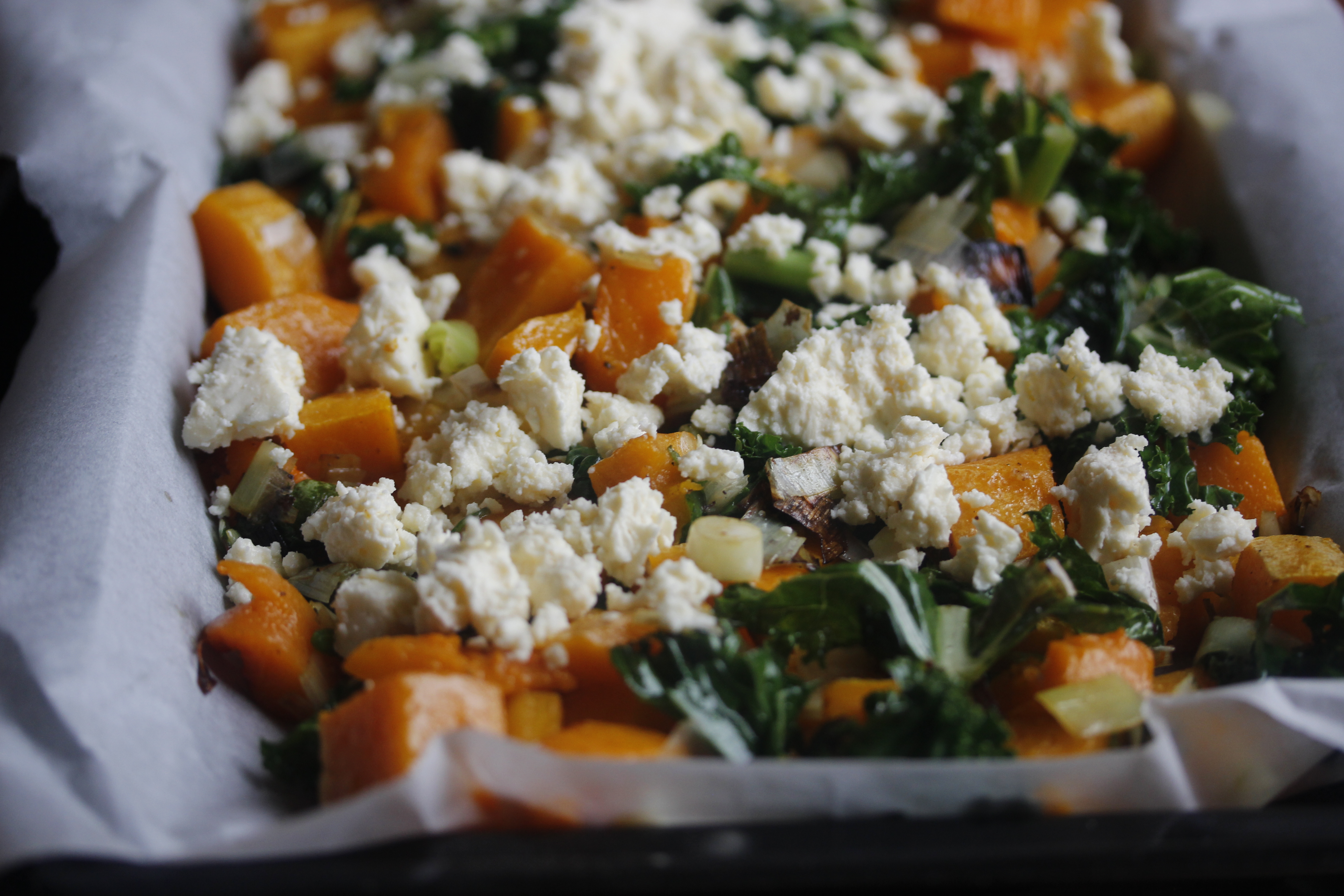 Butternut-eggjabaka með grænkáli, spínati og fetaosti
