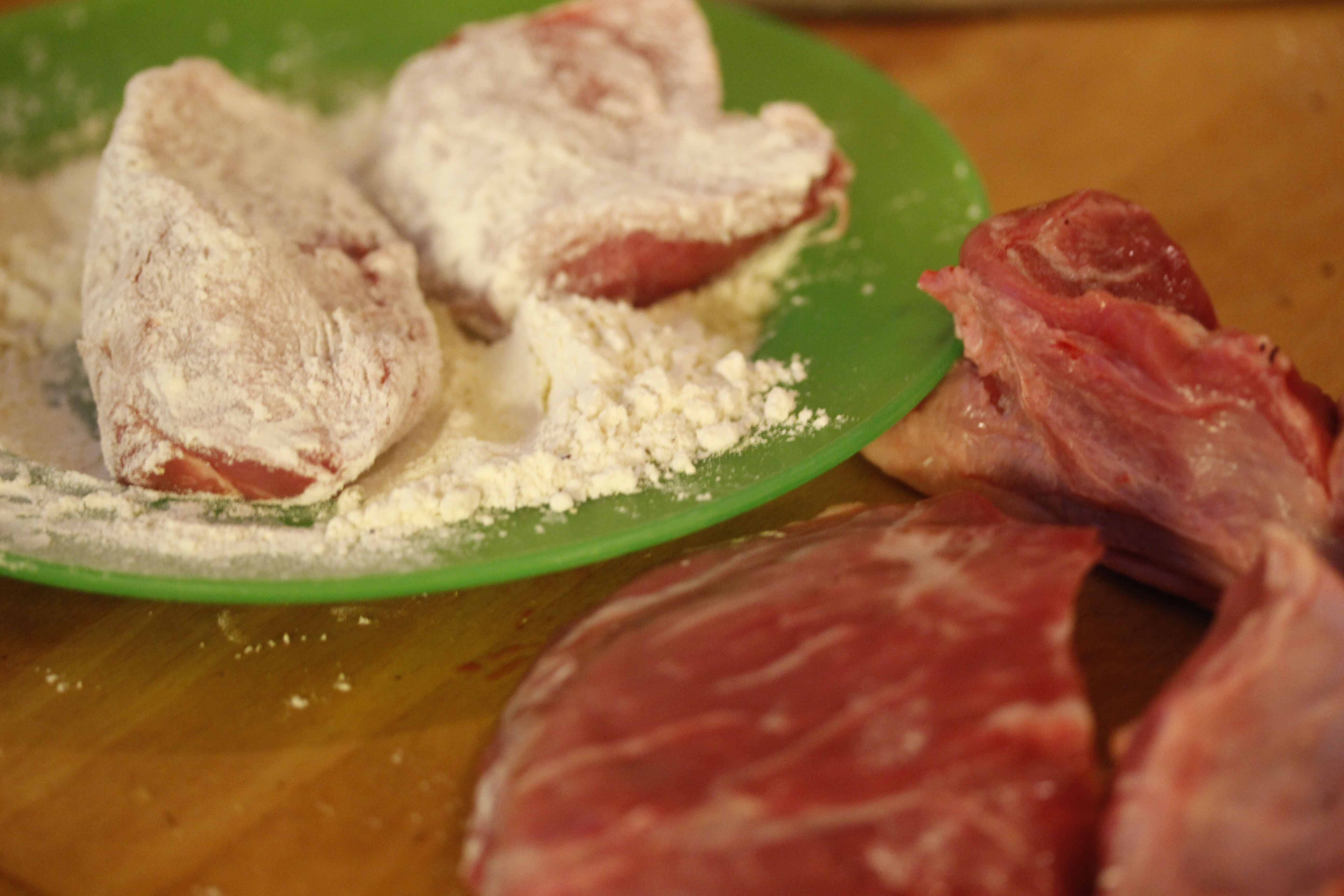 Ég blandaði pipar og salti saman við 1-2 msk af hveiti og velti kinnunum vel upp úr blöndunni. Svo hitaði ég 1 msk af olíu í steypujárnspottinum mínum (en það má nota hvaða þykkbotna pott eða pönnu sem er, svo framarlega sem lokið er sæmilega þétt) og brúnaði kinnarnar vel á báðum hliðum.