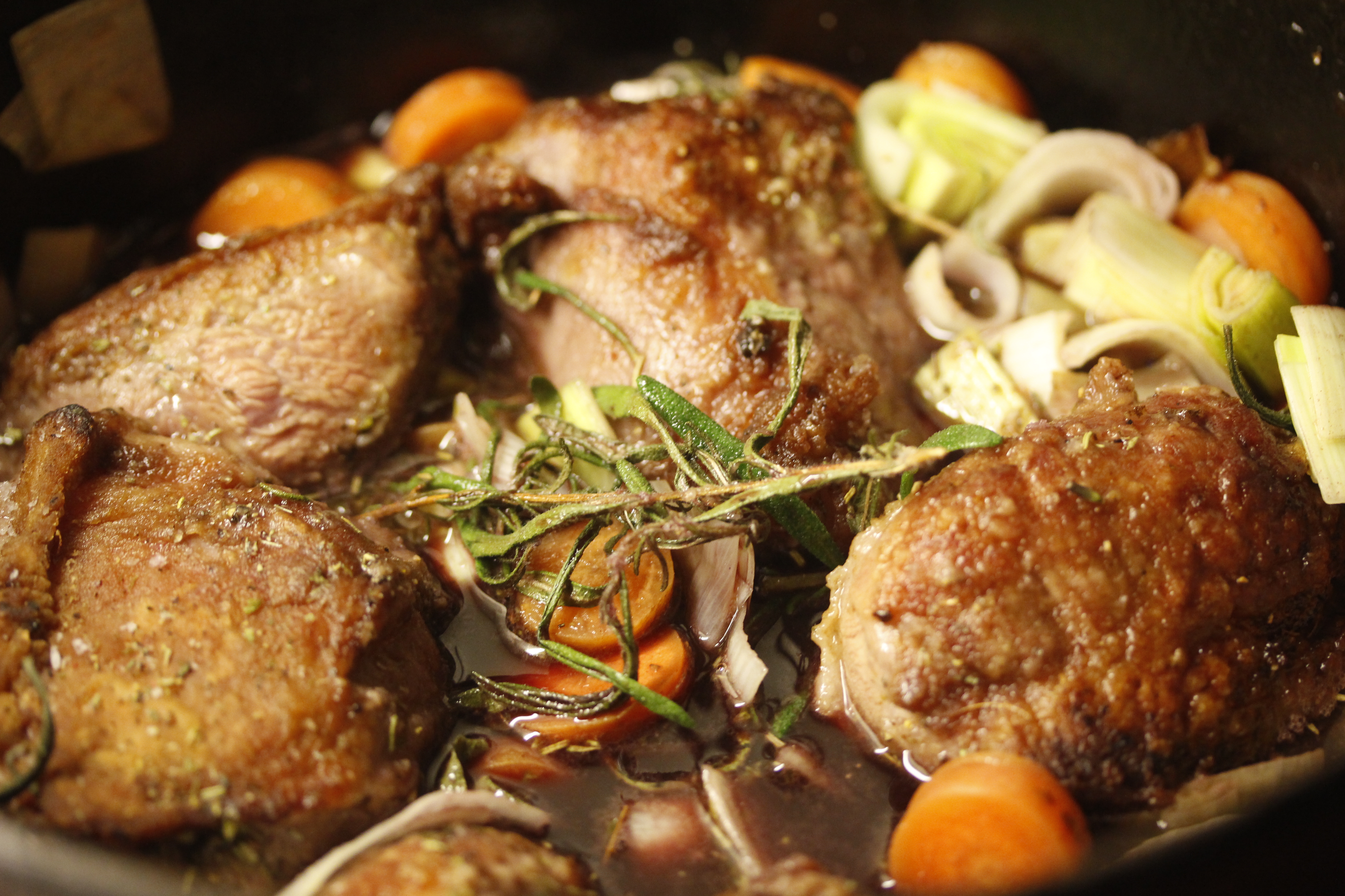 Ég lét kinnarnar malla í 2 1/2 klst. Ef lokið fellur þétt að pottinum og hitinn er svo lágur að þetta rétt mallar ætti ekki að þurfa að hreyfa við þessu en það er kannski vissara að líta í pottinn einu sinni eða tvisvar þegar fer að líða á suðutímann og bæta við svolitlu vatni ef uppgufunin er of mikil. En sósan ætti að laga sig sjálf og það á ekki að þurfa neitt til að þykkja hana, og hún ætti að verða býsna bragðmikil og góð.