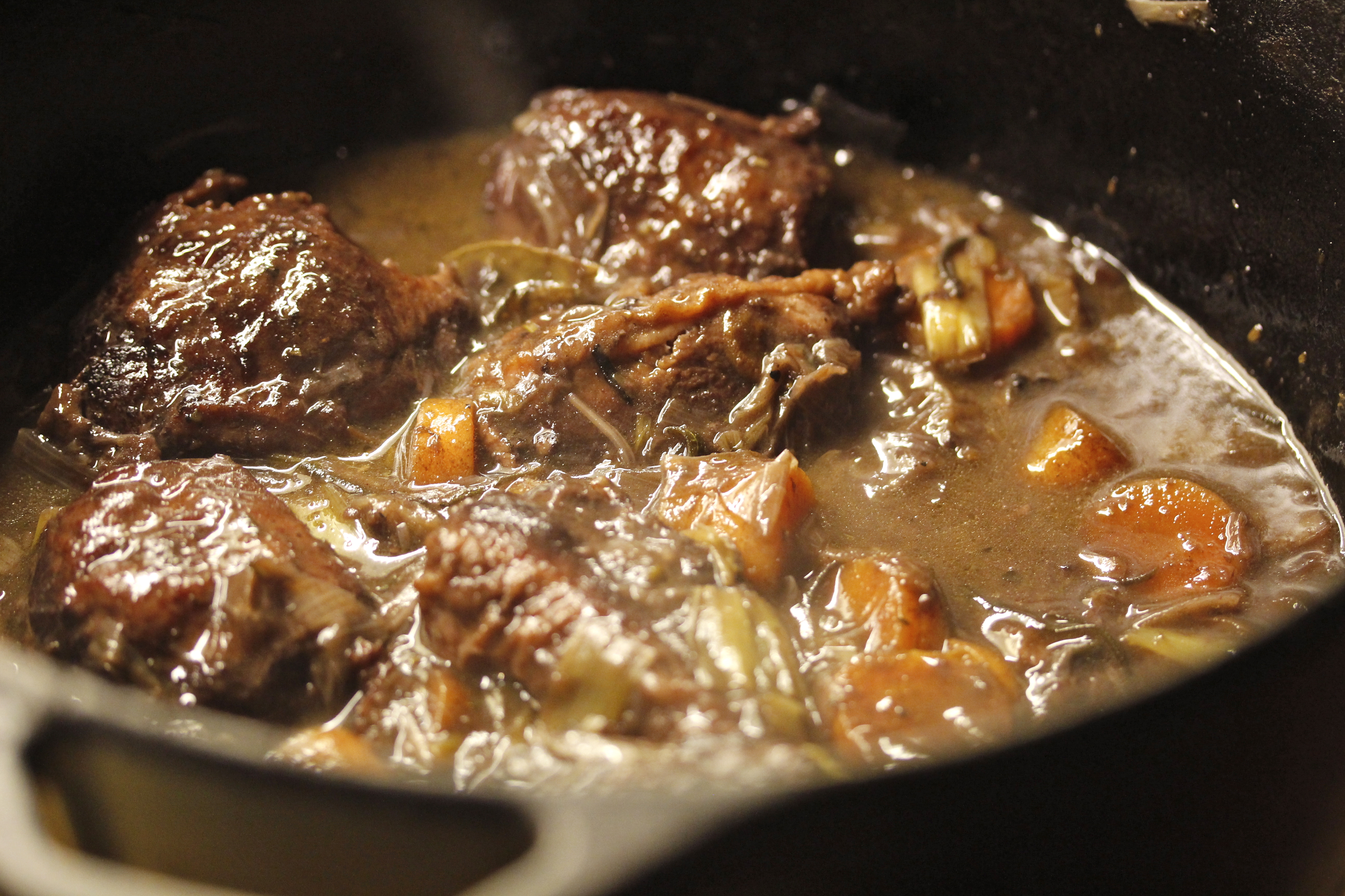 Svo bætti ég 1 tsk af herbes de provence (eða það má nota einhverja aðra góða kryddjurtablöndu) út í ásamt 2 lárviðarlaufum og 2-3 rósmaríngreinum sem lágu undir skemmdum. Ef ekki er notað rósmarín má bara setja meira af krydjurtablöndunni. Og bætti við dálitlum pipar og salti. Hellti svo 300 ml af rauðvíni út í, hitaði að suðu, setti lokið á pottinn og lækkaði hitann eins og hægt var.