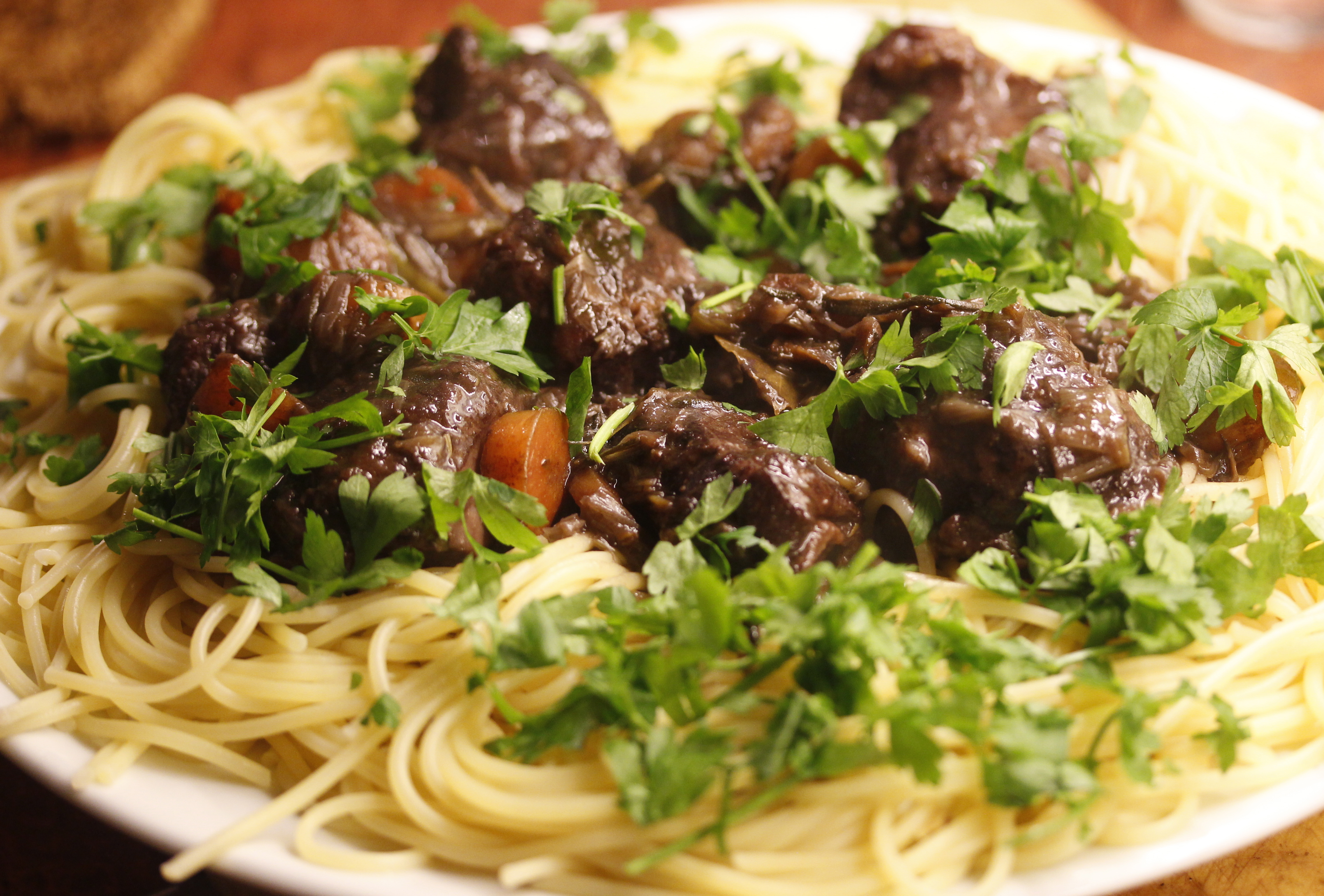 Ég sauð svo spaghettí og setti á fat. Setti kinnarnar í miðjuna og hellti sósunni og grænmetinu yfir og saxaði svo dálitla steinselju og stráði henni yfir. Þetta leit nú bara ansi girnilega út.
