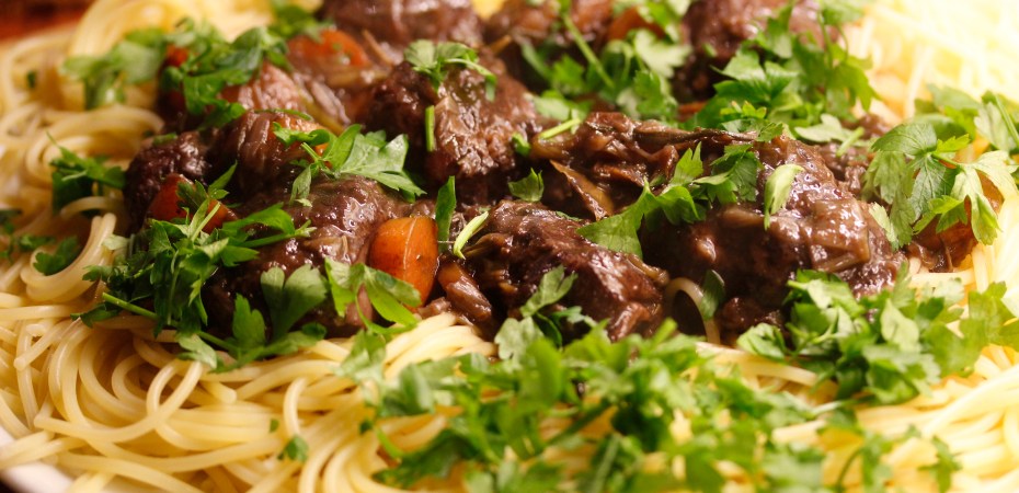 Grísakinnar í rauðvíns-pastasósu