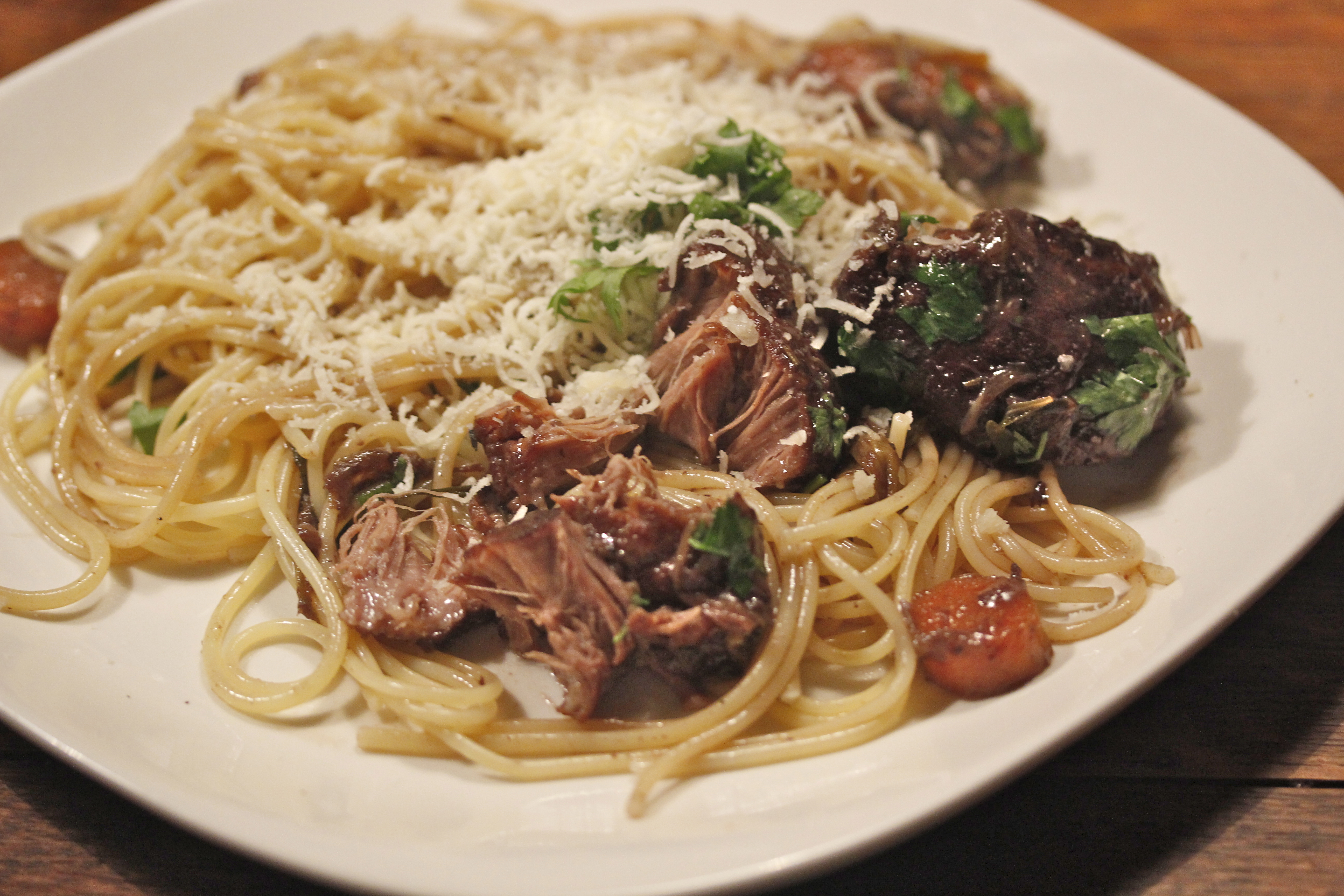 Og svo er bara að rífa parmesanost yfir. Kinnarnar voru svo meyrar að það var hægt að skera þær (eða rífa í sundur) með gaffli og þurfti ekki að tyggja þær … Og jú, bragðið var alveg hreint ágætt.