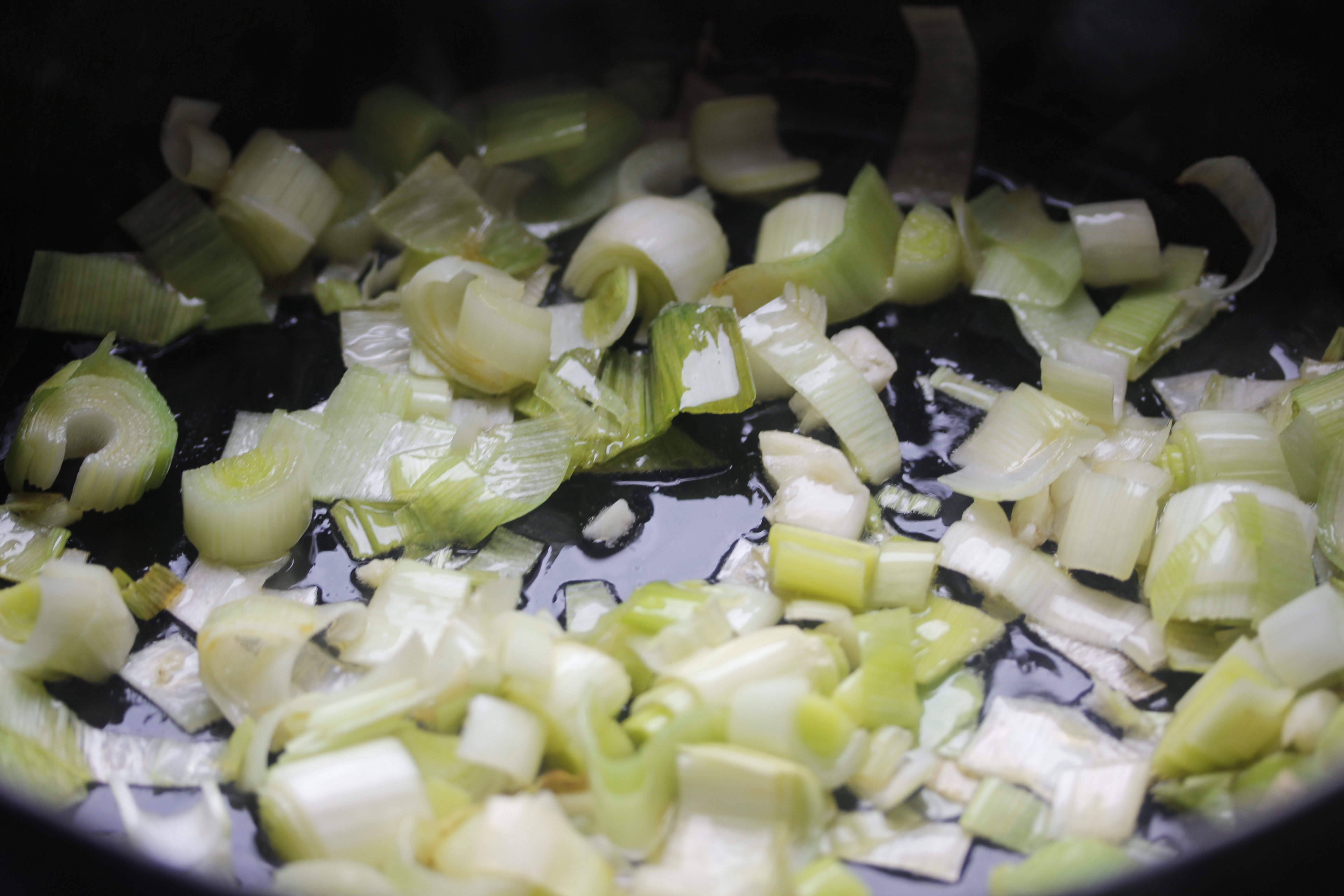 Svo hreinsaði ég einn lítinn blaðlauk og svona 150 g af gulrótum og skar hvorttveggja í frekar litla bita Saxaði líka tvo hvítlauksgeira smátt. Hitaði 1 msk af olíu í potti og lét blaðlaukinn krauma við meðalhita í nokkrar mínútur án þess að brúnast.