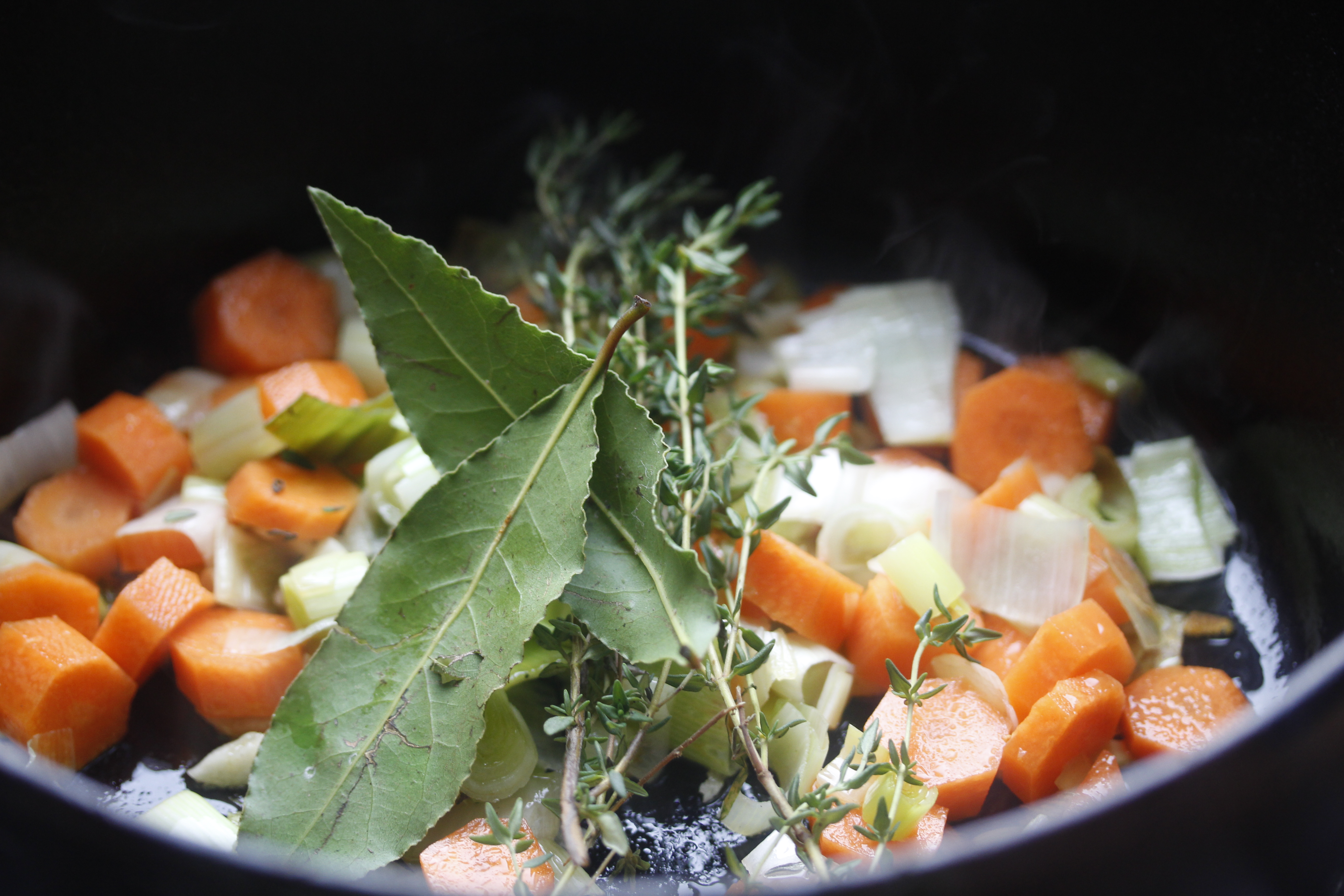 Svo setti ég gulræturnar út í, ásamt hvítlauknum, 2 lárviðarlaufum og 3-4 timjangreinum (eða svona 1 tsk af þurrkuðu timjani) og lét krauma í 2-3 mínútur í viðbót.