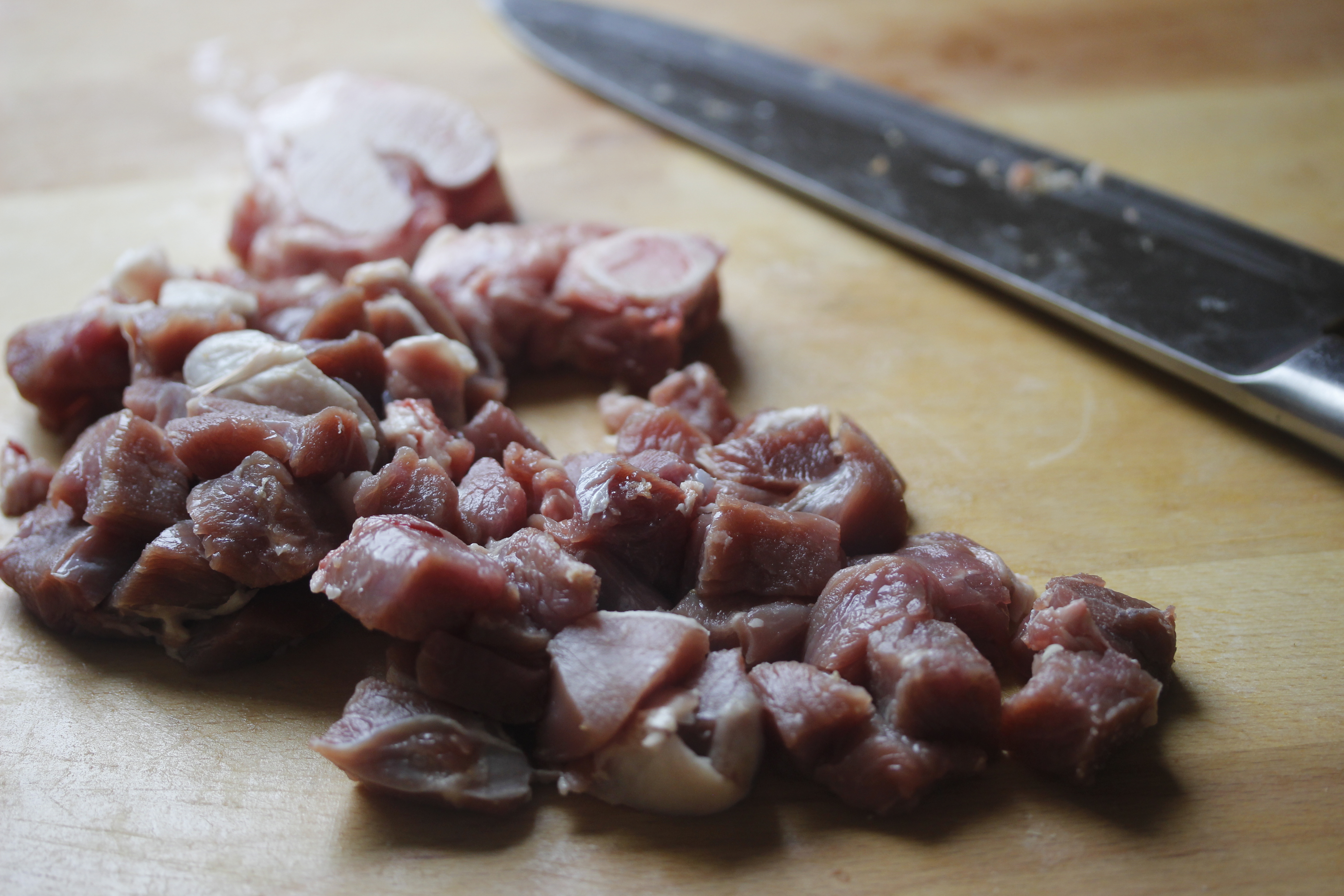 Ég notaði lambalærissneiðar í súpuna, fékk þær á tilboði, en það má nota hvaða lambakjöt sem er, helst magurt, kannski svona 350-400 grömm. En ég fitusnyrti það allavega og skar í frekar litla munnbita.