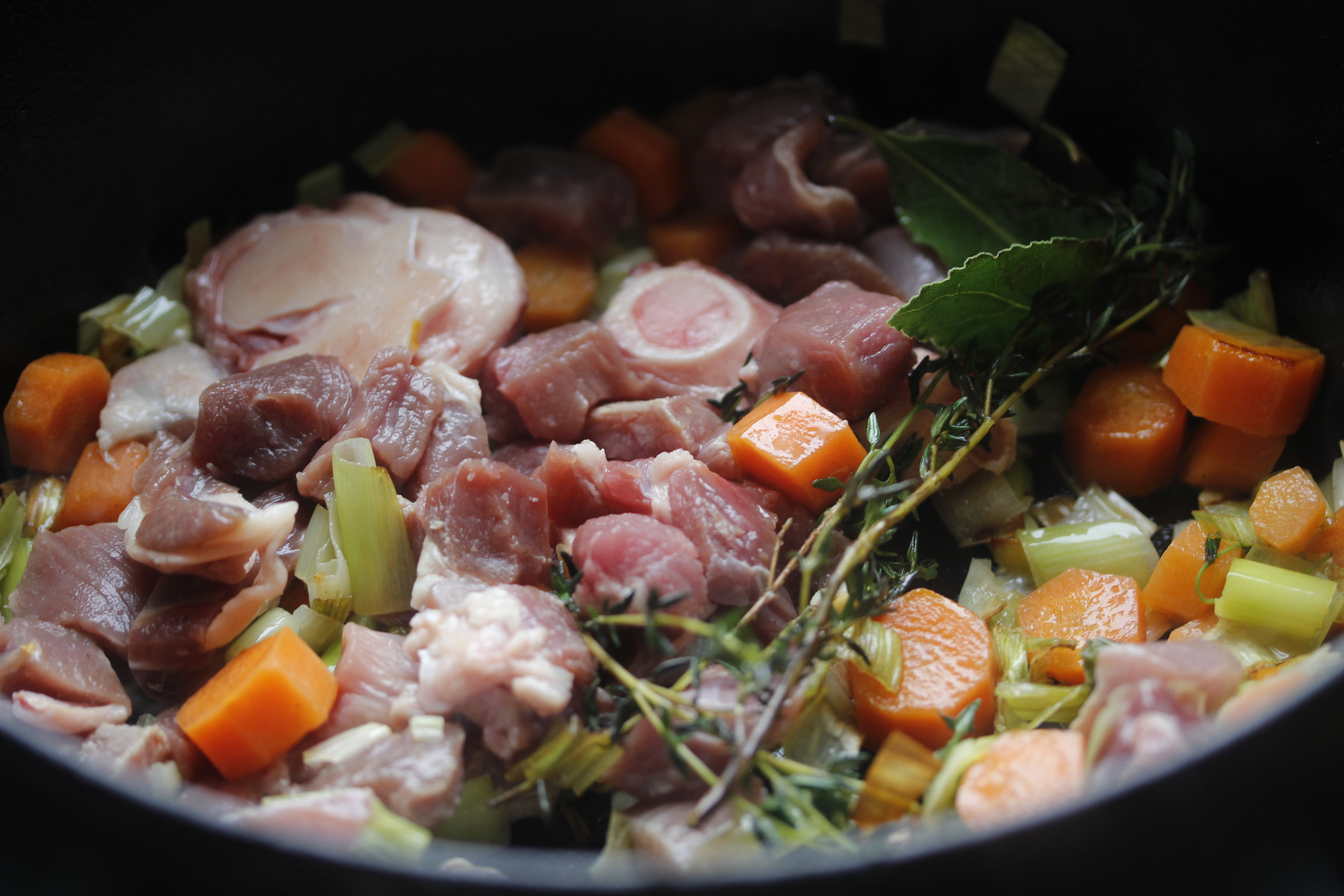Svo setti ég kjötið í pottinn. Ég set beinin með til að fá kraft úr þeim en veiði þau svo upp úr í lokin ásamt kryddjurtunum.