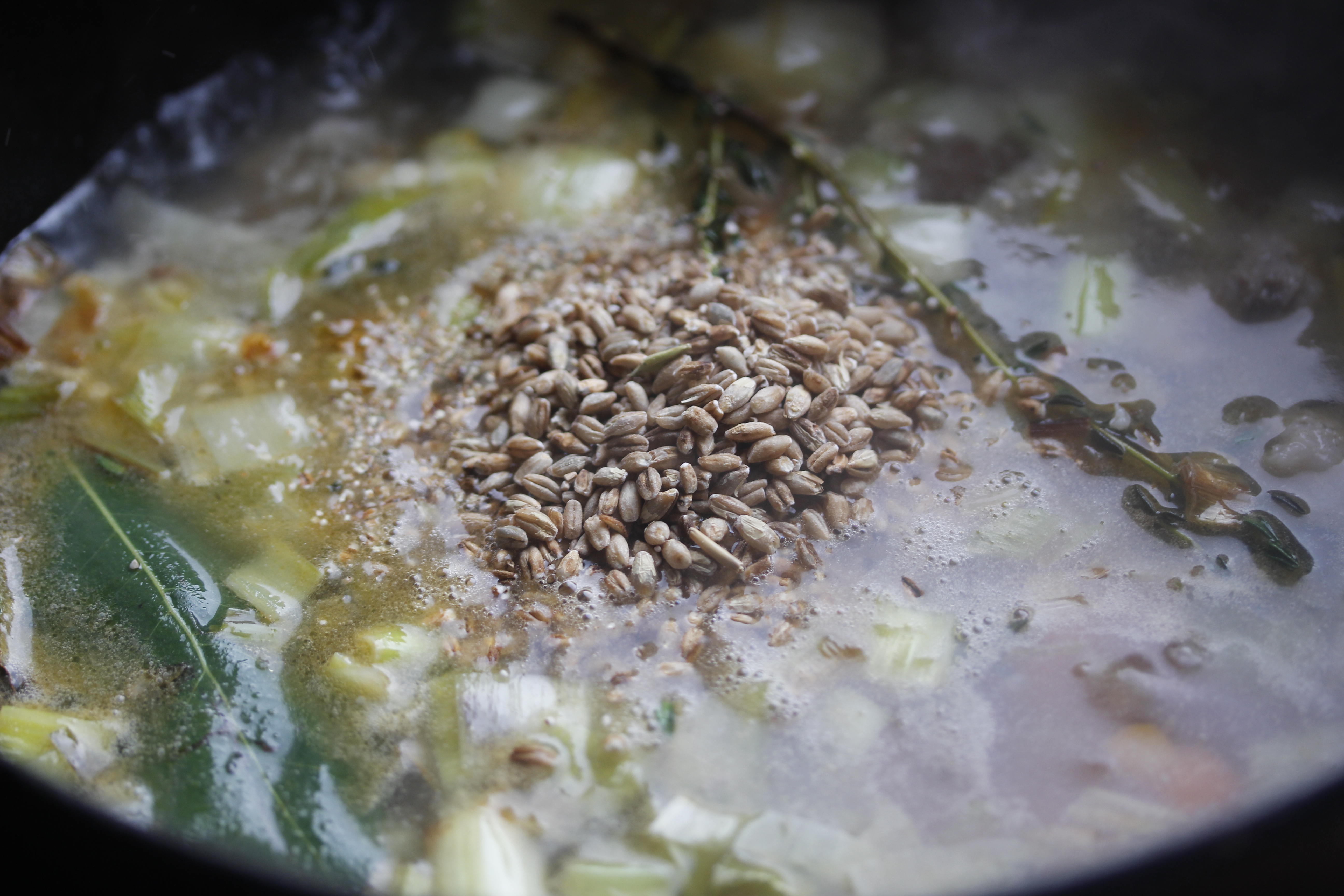Síðan hellti ég 1,5 l af vatni út í og bætti við 1 msk af lambakrafti (má líka vera kjúklingakraftur), 1/2-1 fræhreinsuðu og söxuðu chilialdini, 75 g af bankabyggi, pipar og salti. Hitaði að suðu og lét malla við vægan hita í um 40 mínútur.