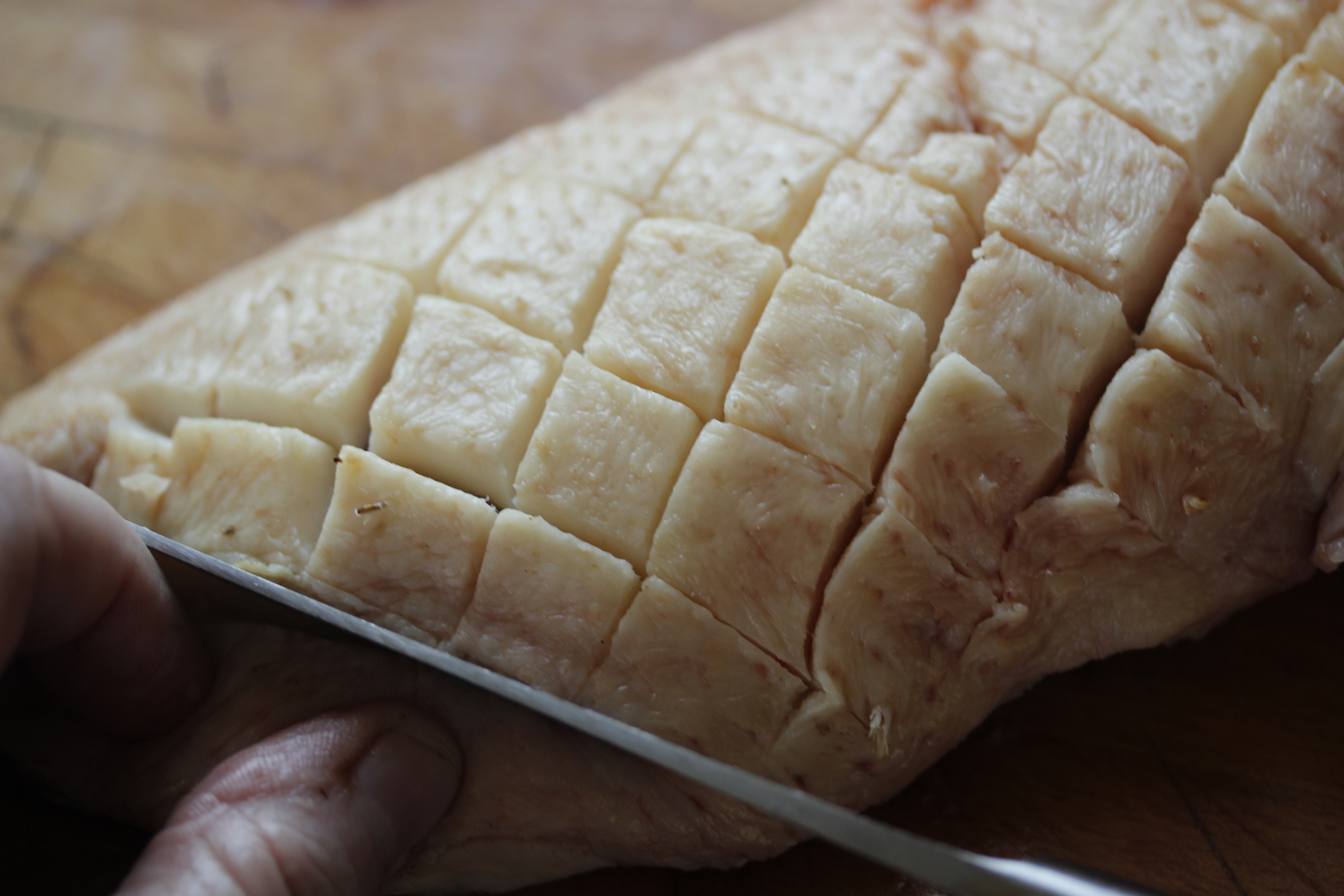 En það þarf náttúrlega að byrja á að láta andabringurnar/bringuna þiðna. Ég var með eina bringu, meðalstóra. Og svo er best að skera tígulmynstur í fituna með svona 1 cm millibili. Bara í gegnum fituna og að kjötinu, ekki inn í kjötið. Þetta er til að fitan bráðni betur og steikingin verði jafnari. Og svo kveikti ég á ofninum og stillti hann á 200°C.