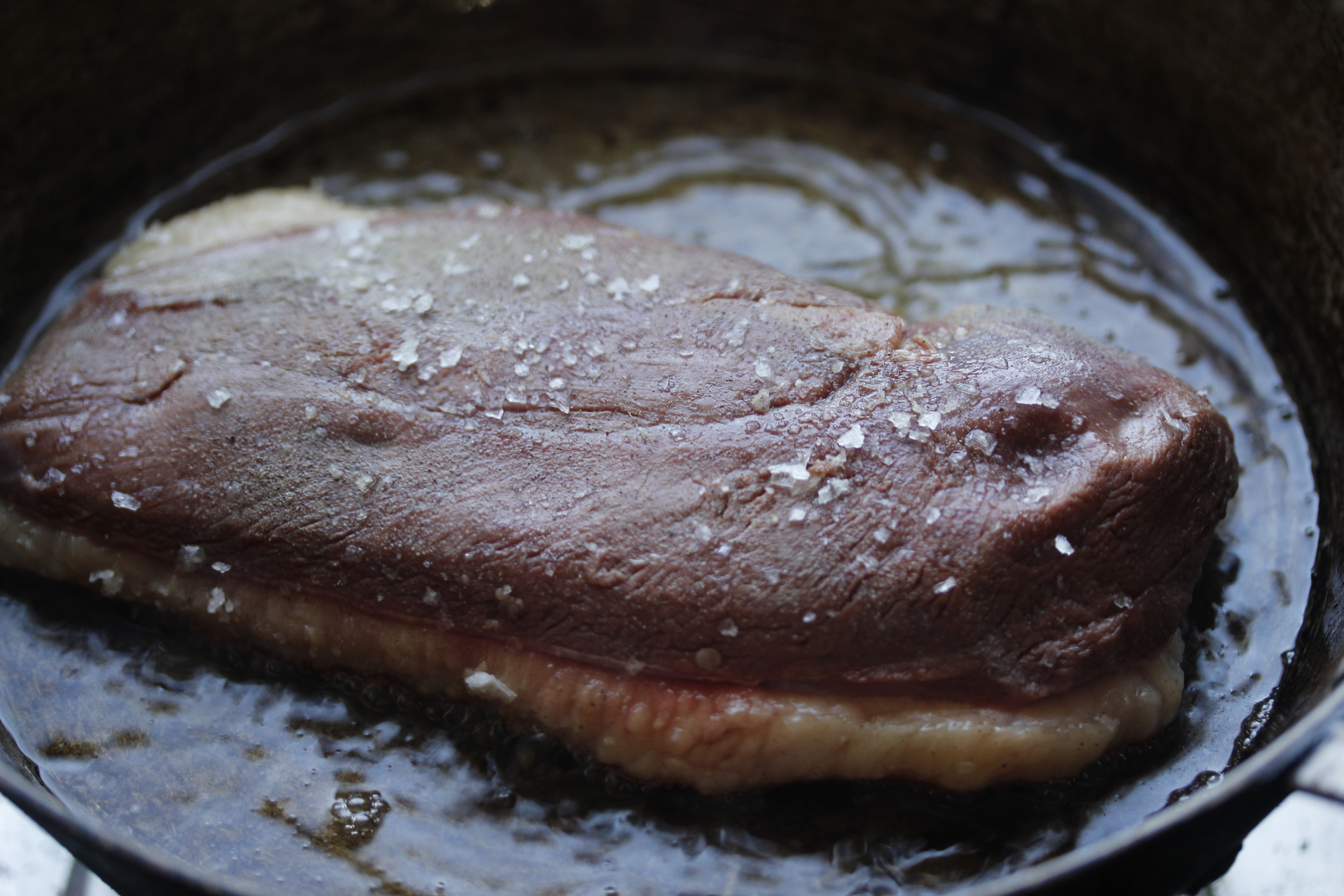 Ég set bringur yfirleitt á kalda pönnu og kveiki svo undir henni en það má auðvitað byrja að hita hana áður. En hún á að vera þurr, fitan er fljót að byrja að renna og fyrr en varir syndir bringan í andafeiti. Ég helli venjulega mestallri fitunni af pönnunni og í skál áður en ég sný bringunni. Og ég geymi hana alltaf og nota til steikingar, hún er frábær á ofnsteiktar kartöflur og rótargrænmeti.