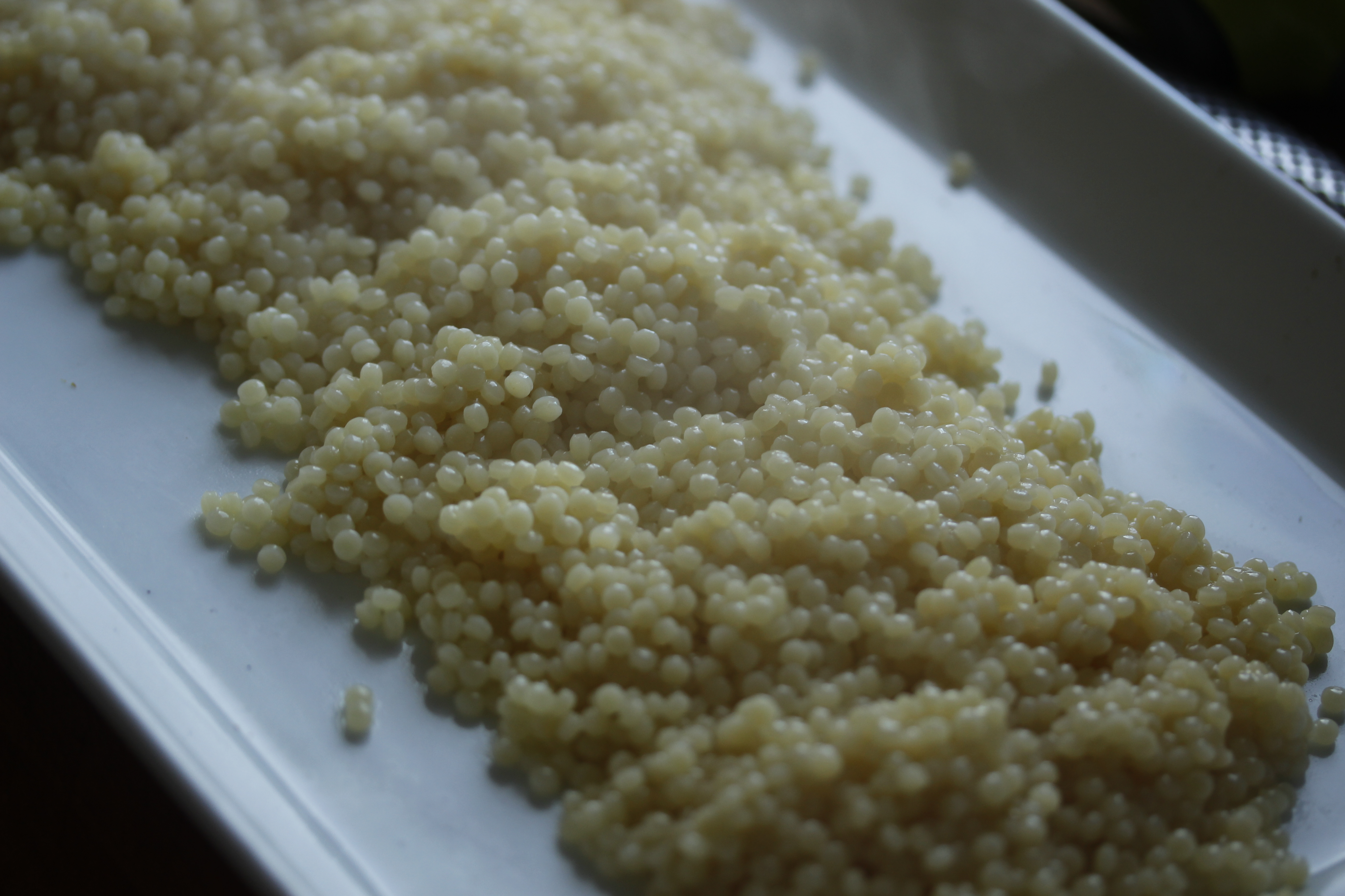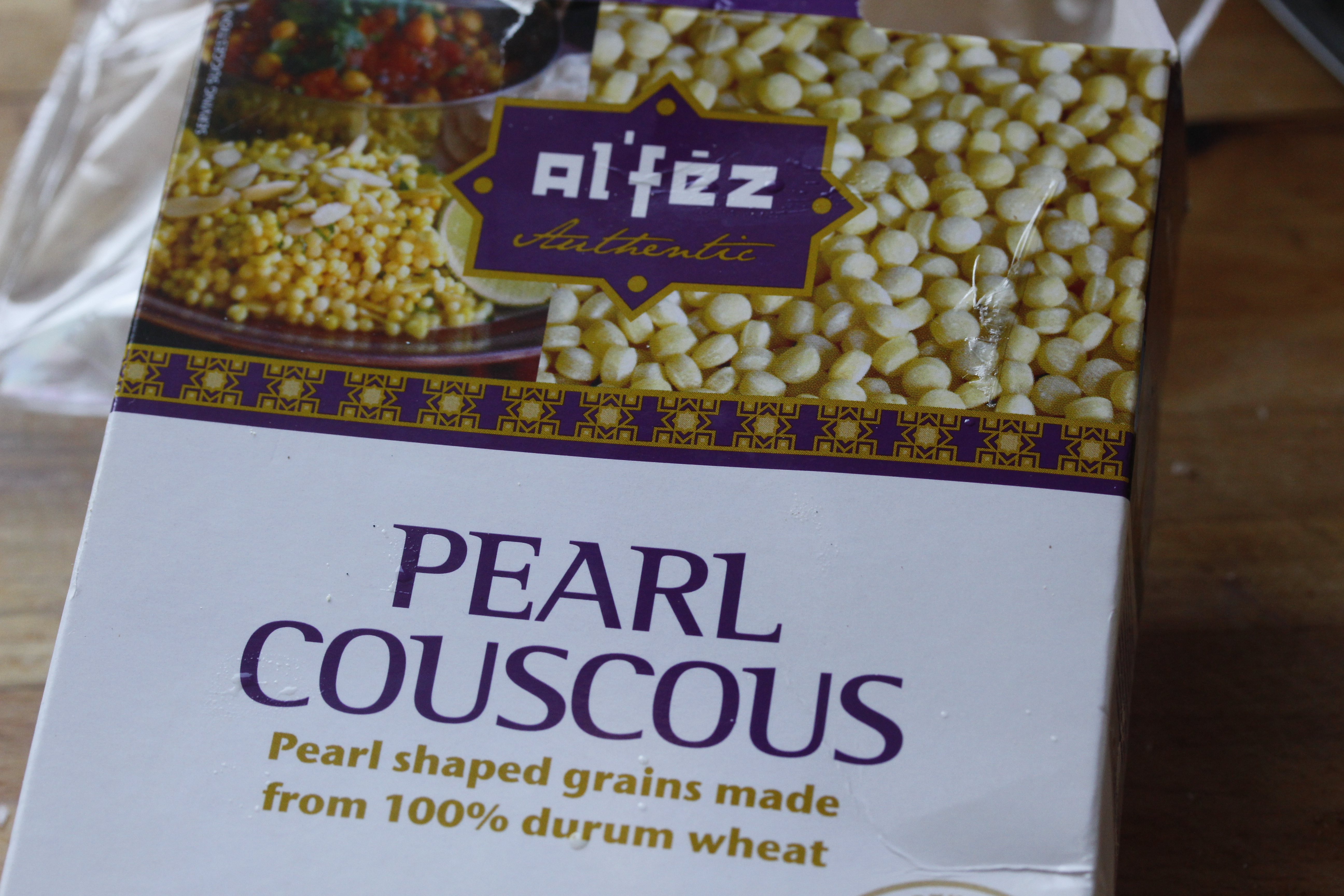 Ég notaði perlukúskús (ísraelskt kúskús), sem er í rauninni pasta fremur en kúskús. Ef það fæst ekki má líka nota eitthvert smágert pasta eða soðið bygg, helst þó perlubygg.