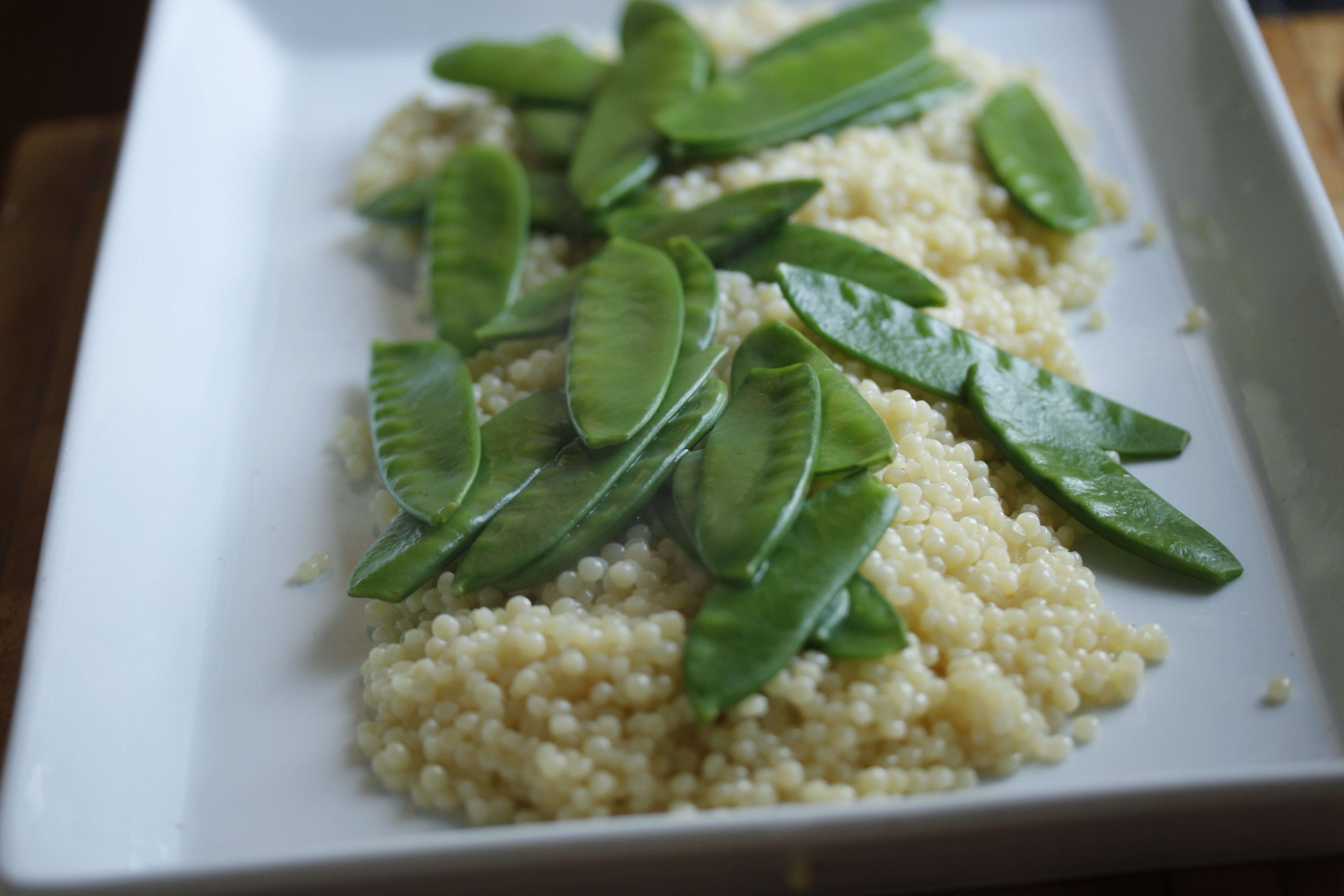 Ég átti til 100 g af sykurbaunum (snjóbaunum), sem ég setti út í sjóðandi saltvatn, sauð í tvær mínútur og hellti þeim svo í sigti og lét kalt vatn buna á þær til að stöðva suðuna. Setti þær svo ofan á kúskúsið.