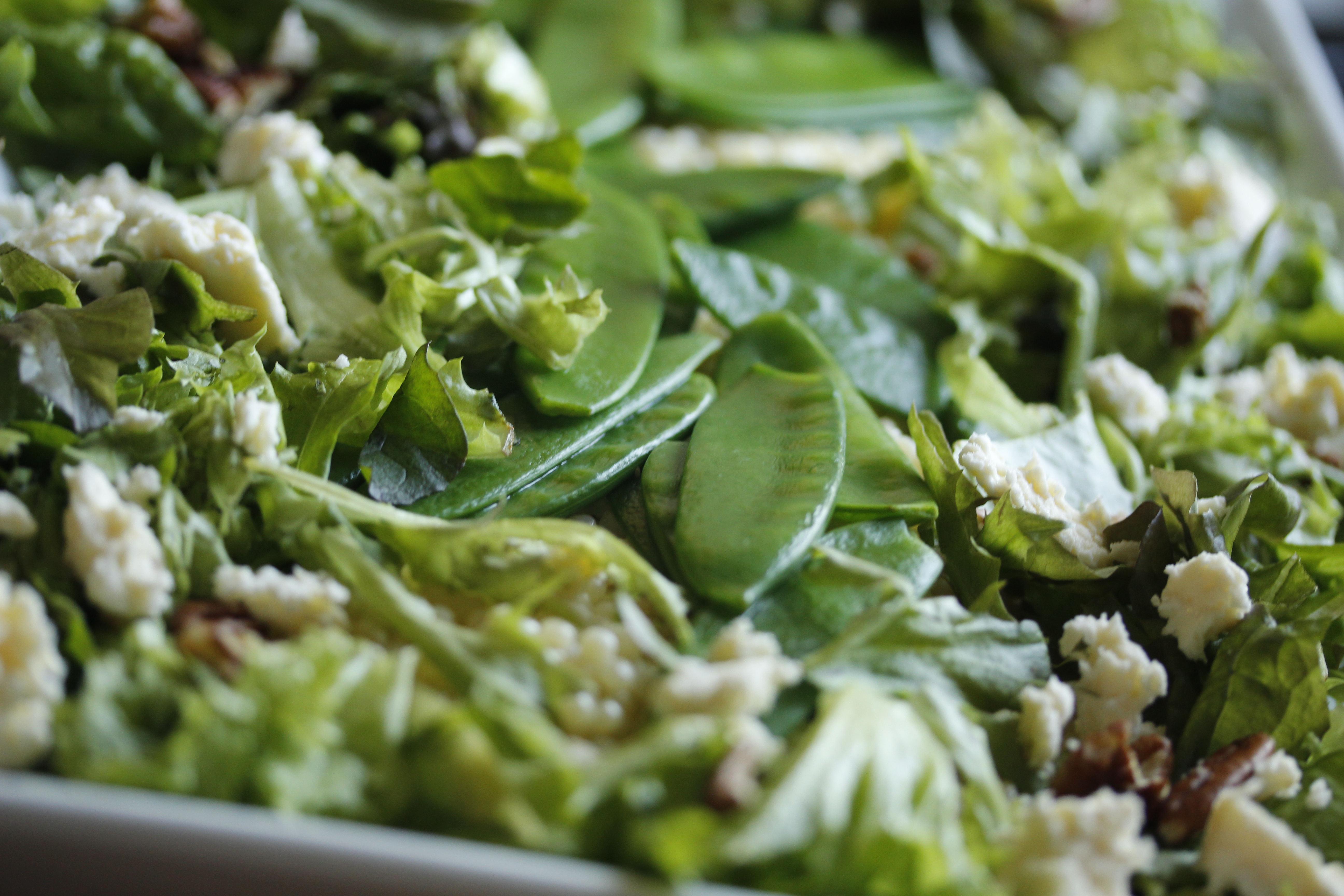 Svo dreifði ég 100 g af blönduðum salatblöðum í kringum kúskúsið. Skar svo 75 g af fetaostskubbi sem ég átti, muldi hann í stóra bita og dreifði þeim yfir salatið.