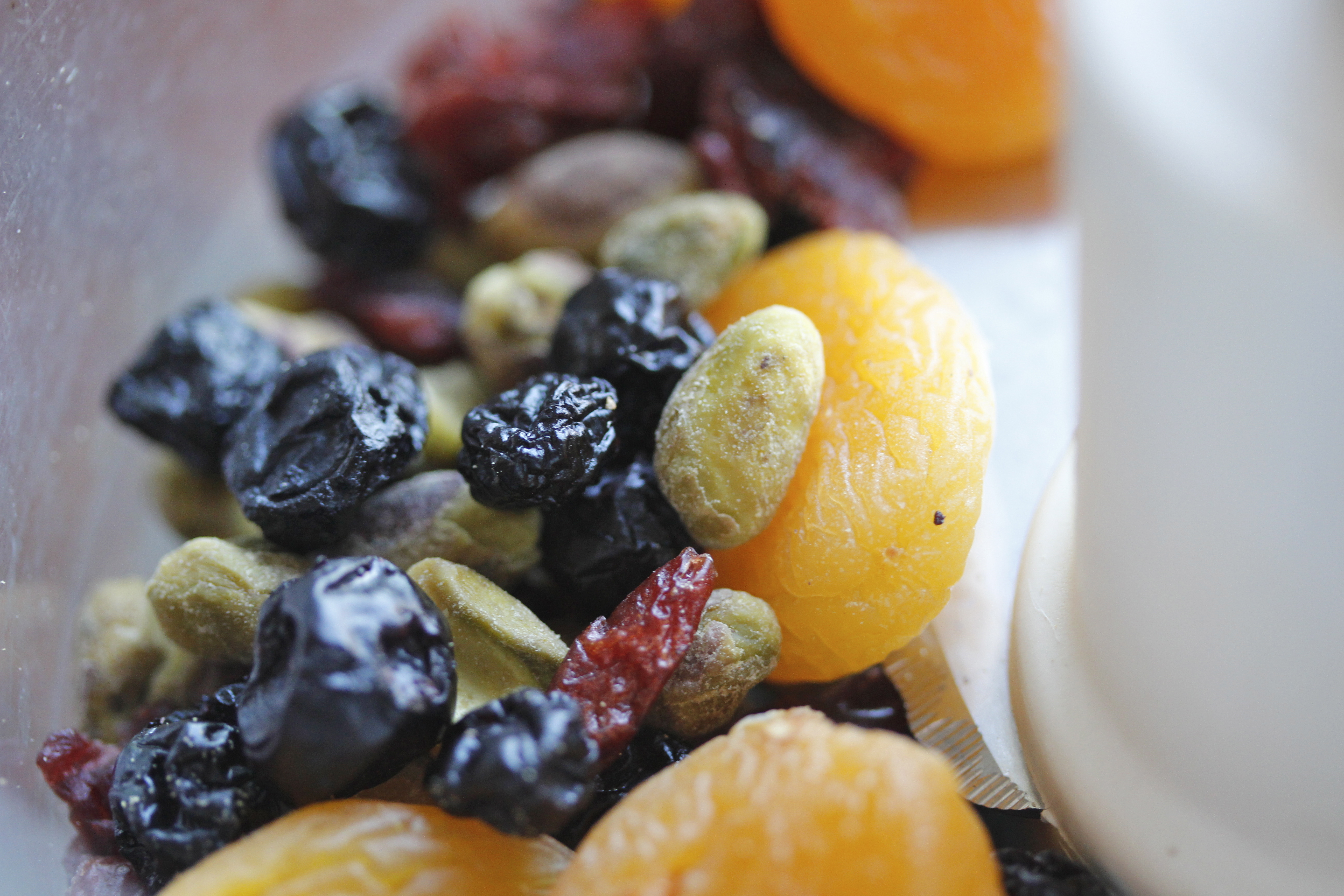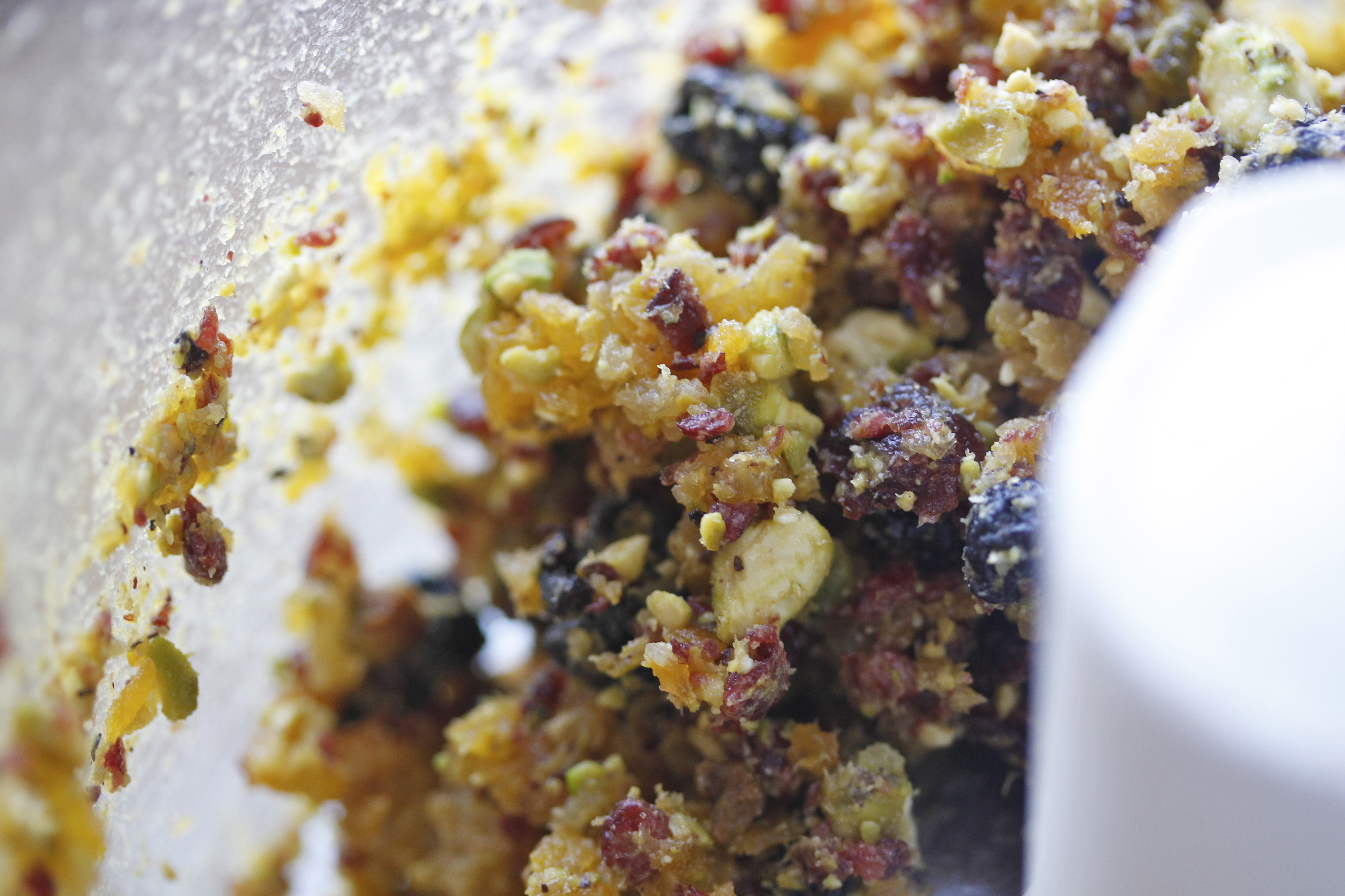 Ég tók 100 g af þurrkuðum apríkósum, 60 g af þurrkuðum bláberjum, 60 g af þurrkuðum trönuberjum og 75 g af pistasíuhnetum og setti í matvinnsluvél.