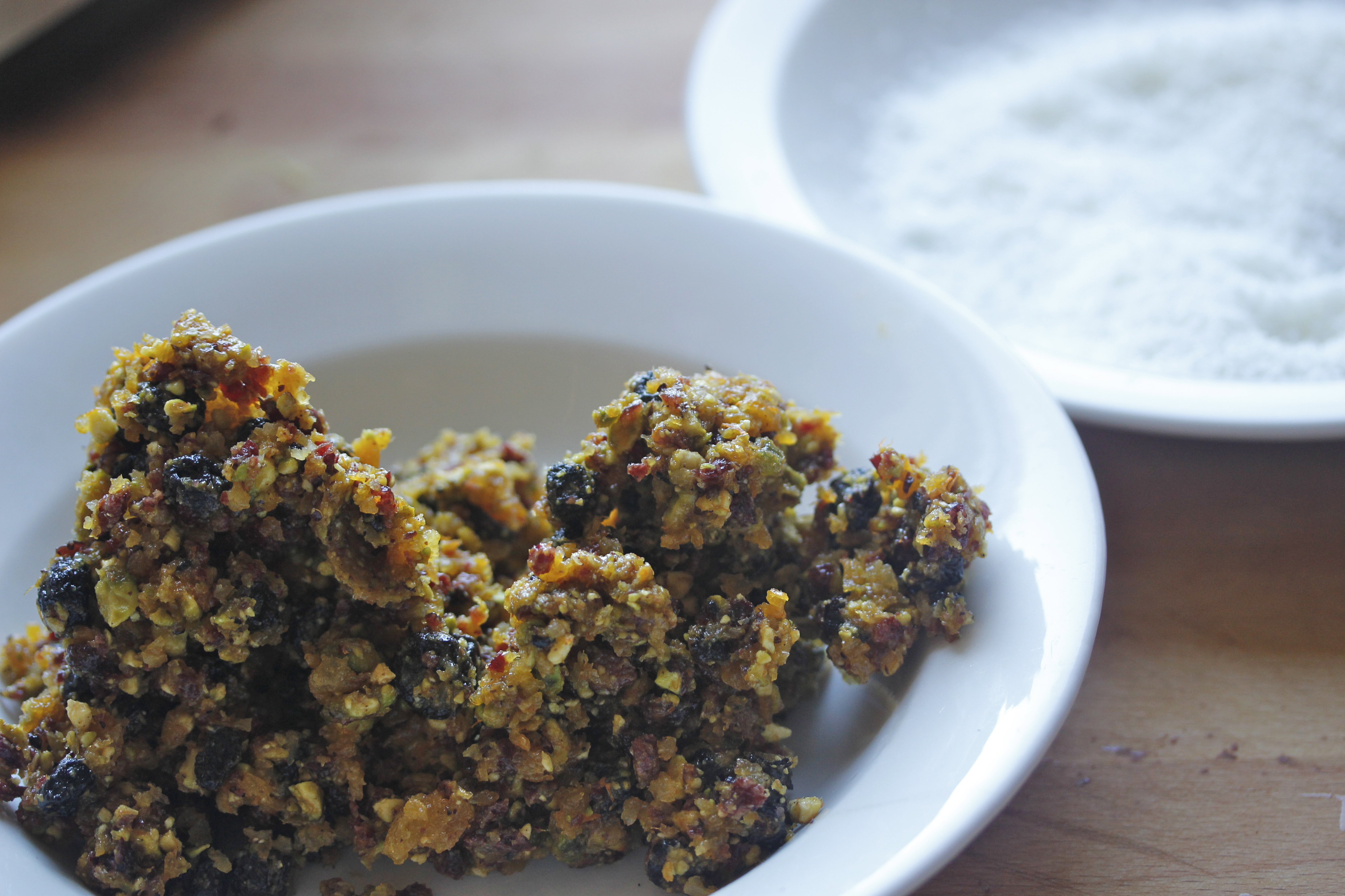 Það má nota aðra ávexti og hnetur í þær en mér finnst þessi blanda sérlega litrík og falleg, fyrir utan það hvað hún er bragðgóð. Þurrkuðu bláberin fékk ég í Kosti en það má vitaskuld nota önnur ber eða ávexti í staðinn, til dæmis ljósar rúsínur.