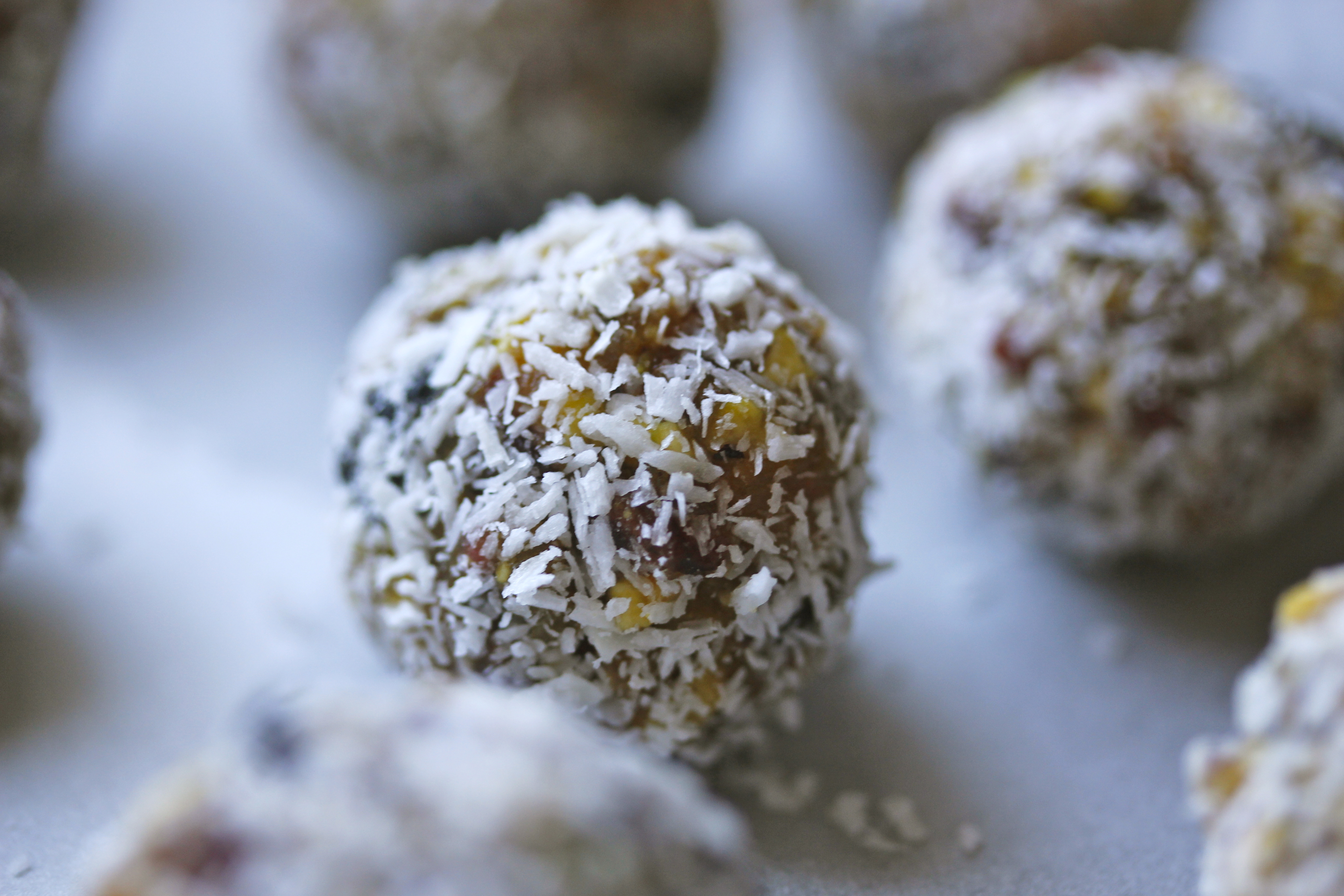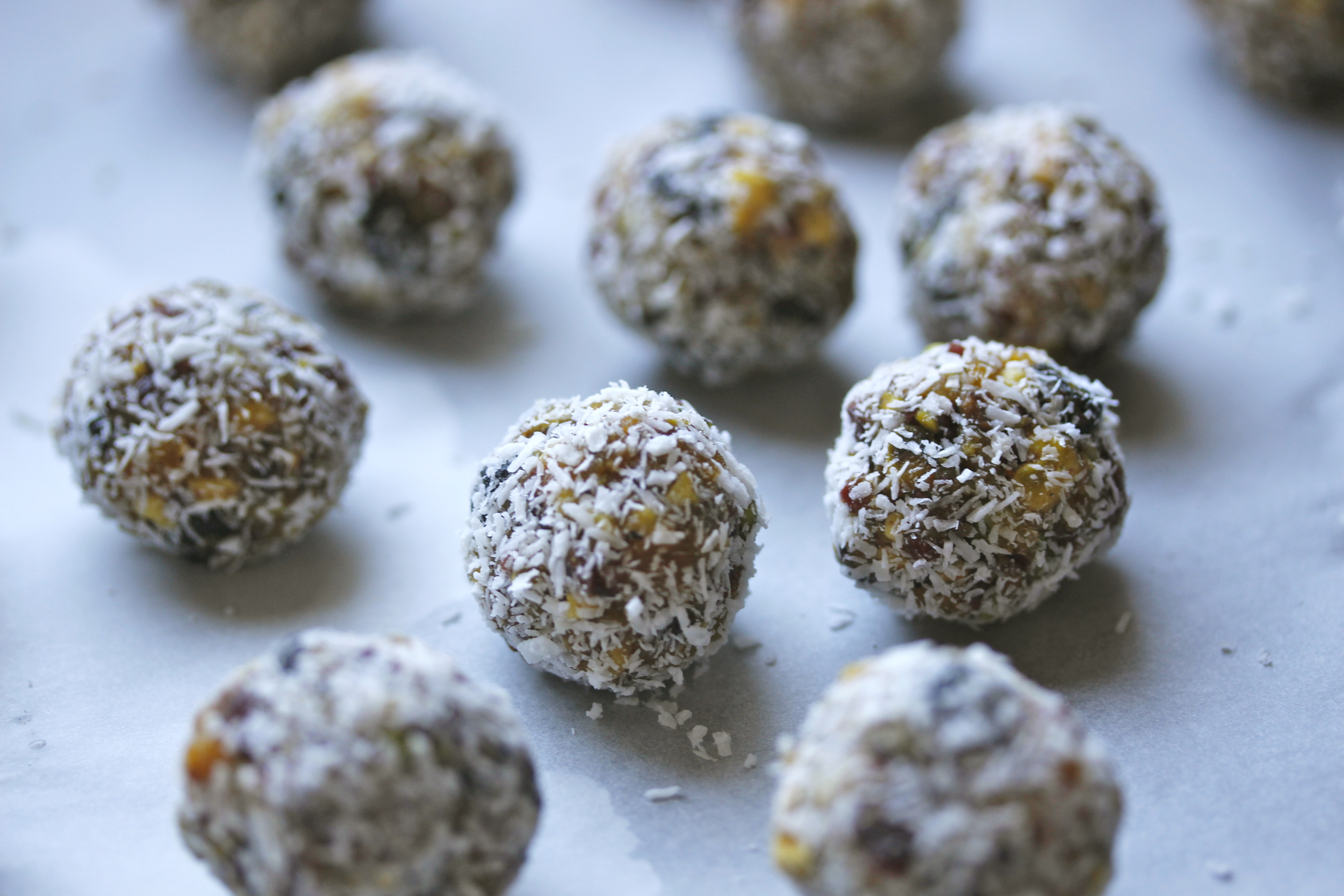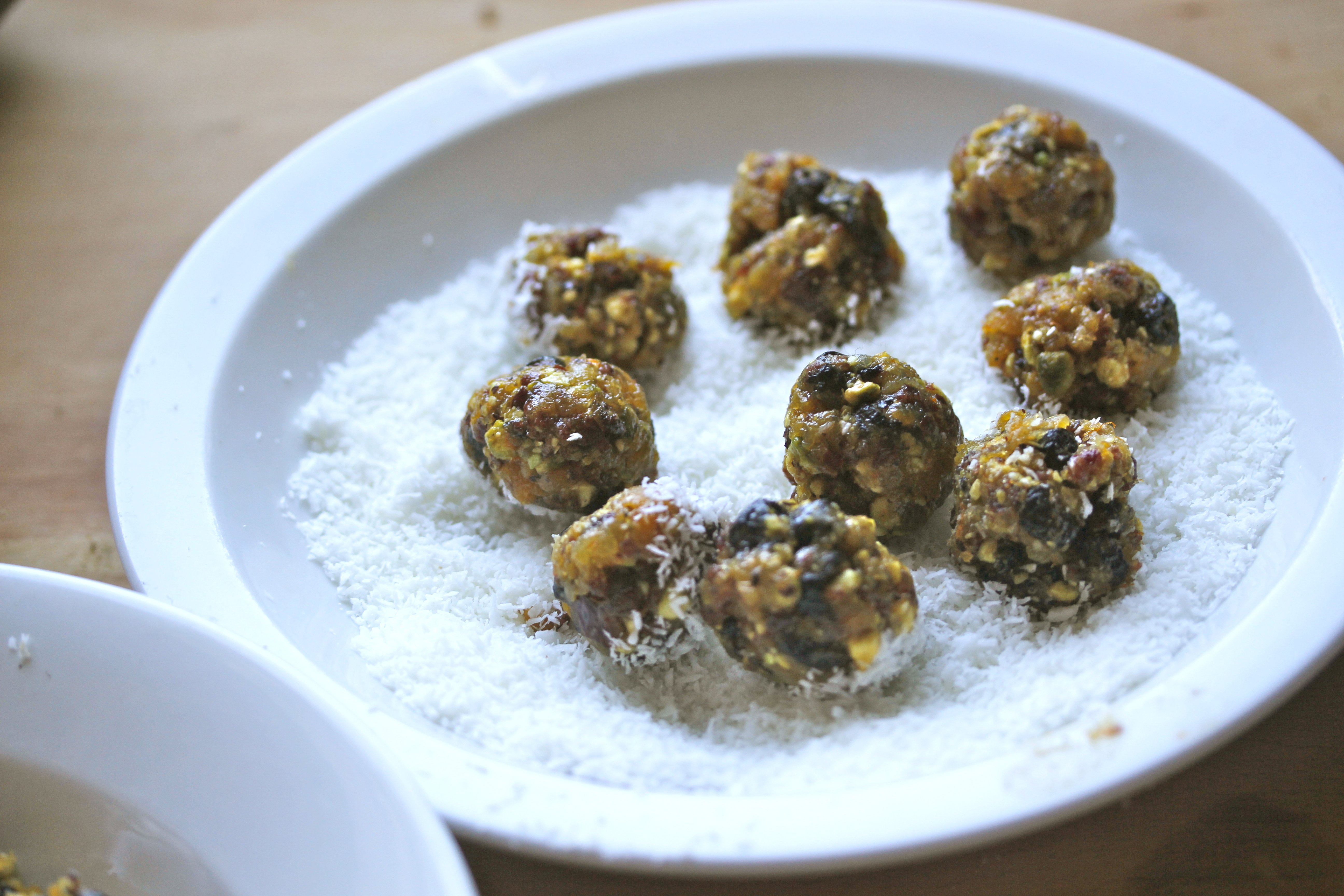 Svo mótaði ég kúlur úr henni, best að hafa þær ekki mjög stórar – þetta urðu 20-25 kúlur. Velti kúlunum upp úr kókosmjöli jafnóðum.