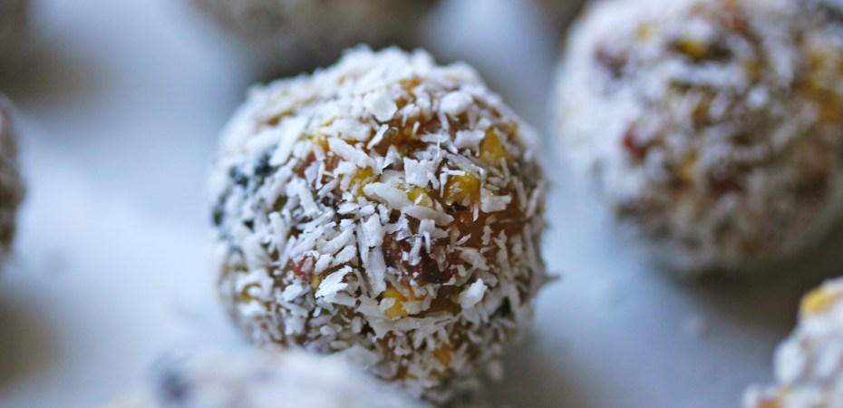 En sælgæti er misóhollt (mér finnst samt oftast vafasamt að tala um ,,hollustunammi“) og það er til nammi sem ég get alveg hugsað mér að narta í, þó í miklu hófi. Þar á meðal eru þessar kúlur. Auðvitað er heilmikill sykur í þeim – ekki bara þessi eina matskeið af hunangi, ávextirnir eru auðvitað stappfullir af ávaxtasykri (og trönuberin eru dálítið sykruð) – en eitthvað flýtur nú með af hollustu. Og kúlurnar eru mjög einfaldar og mér þykja þær góðar …