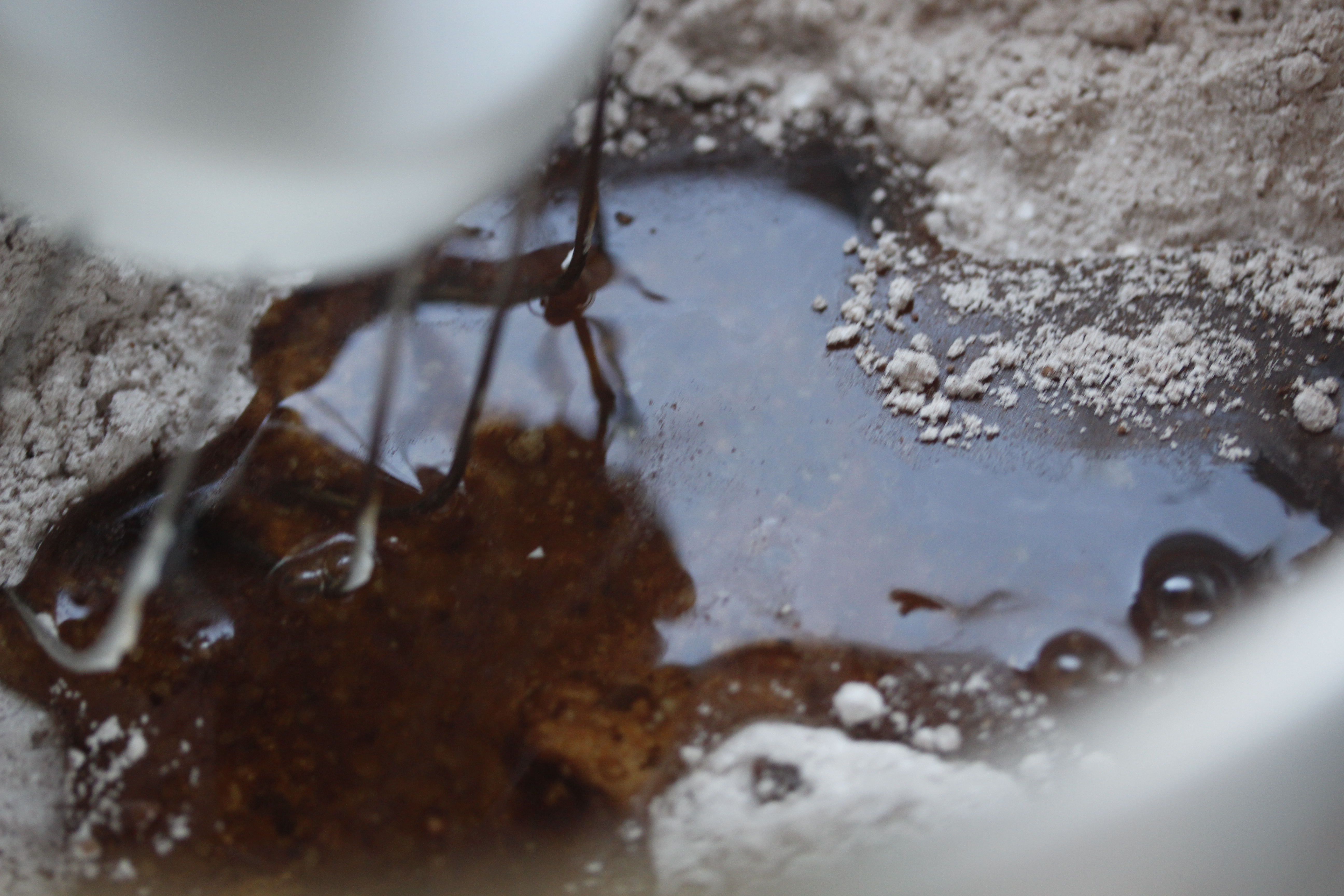 Ég byrjaði á að hita ofninn í 180°C. Svo blandaði ég saman 300 g af flórsykri, 35 g af kakódufti, 1/2 tsk af kanel og 1/4 tsk af engifer.