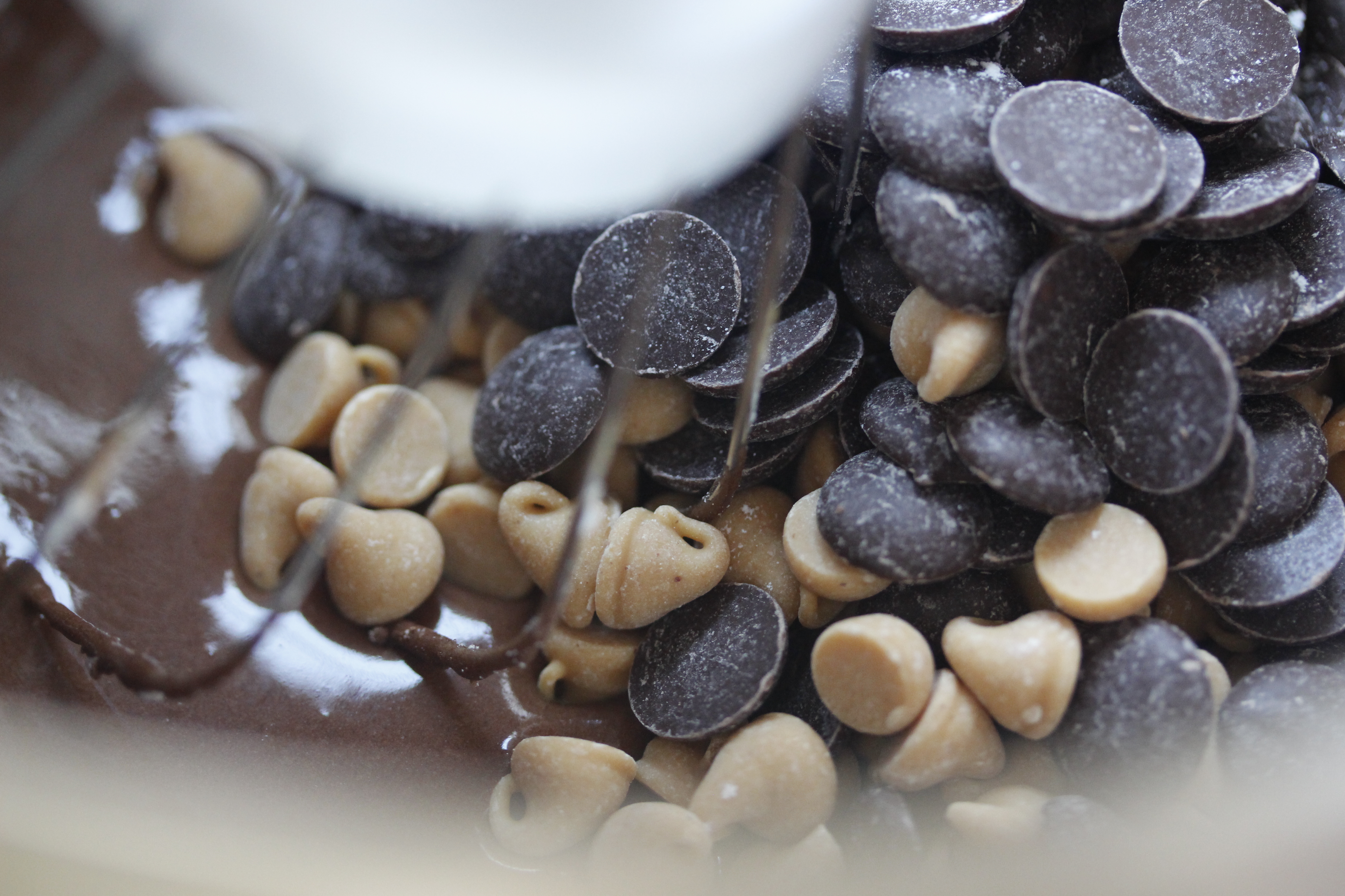 Svo vigtaði ég 100 g af súkkulaðidropum og 100 g af hnetusmjörsdropum (Reese’s Peanut Butter Chips) og blandaði saman við. Það má líka nota eingöngu súkkulaðidropa, e.t.v. blöndu af dökkum og ljósum.