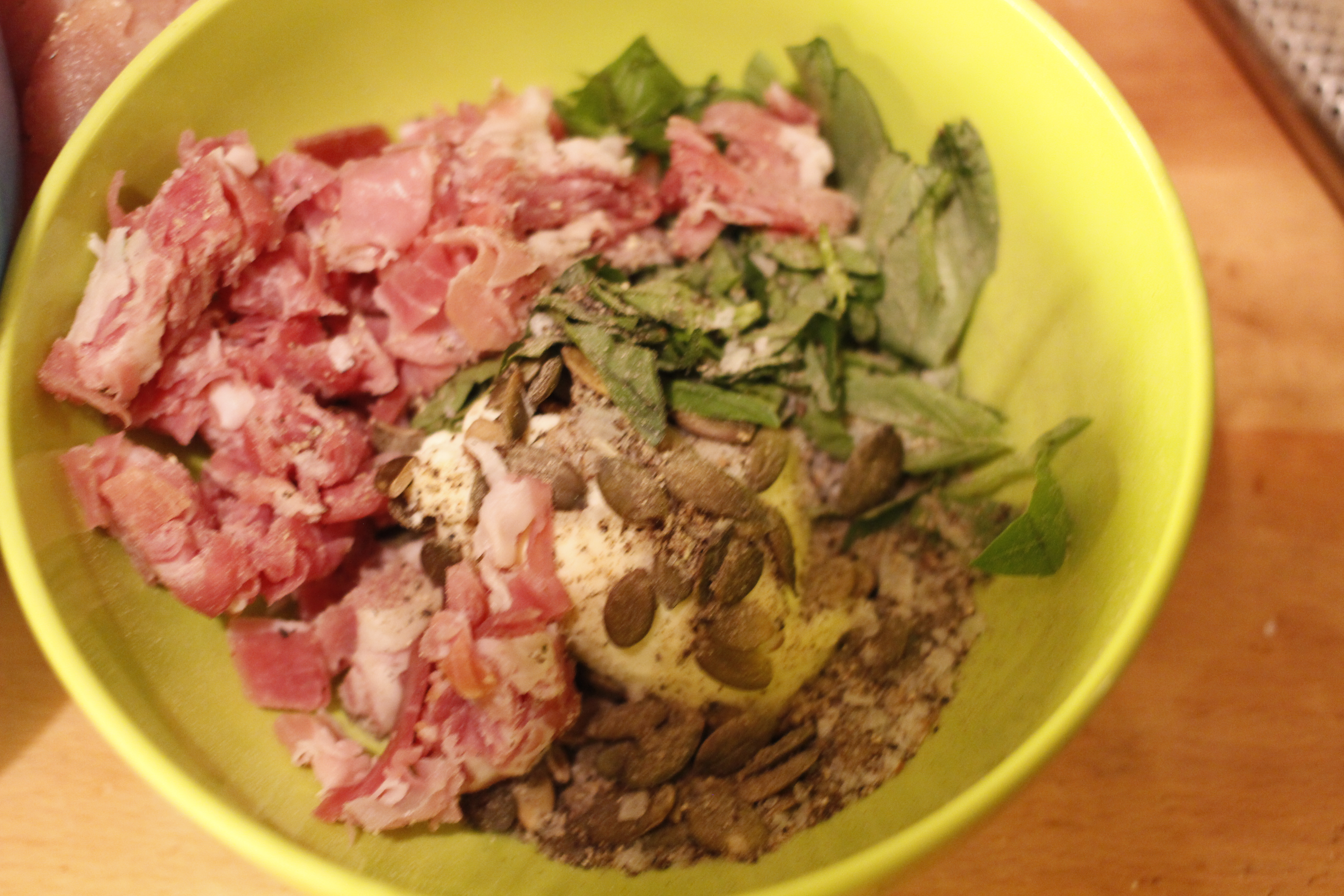 Önnur fyllingin var um 75 g af rjómaosti (en ég mældi ekkert og allar magntölur eru slumpaðar), 75 g af hráskinku, skorinni í bita, 2-3 msk af graskersfræjum, lófafylli af söxuðum basilíkublöðum, pipar og salt.